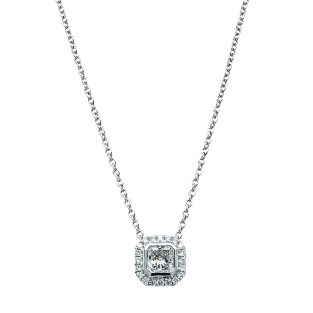 Isla - a favourite from our signature 1899 collection. Elegant in every way, this diamond pendant features a single radiant cut diamond framed by twenty round brilliant cut set diamonds in our 18ct white gold.