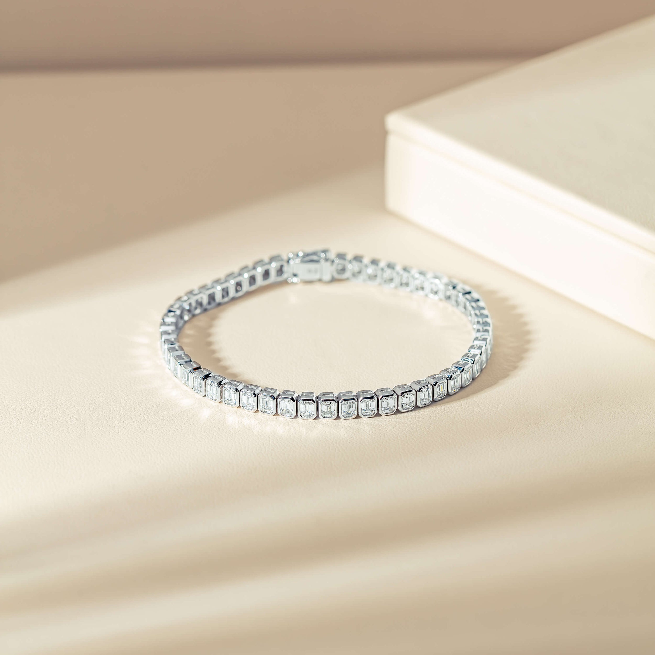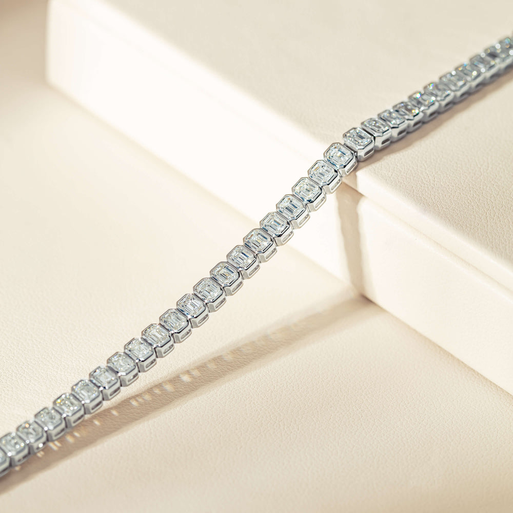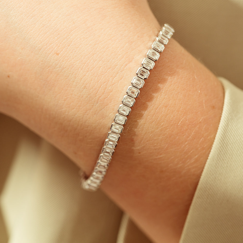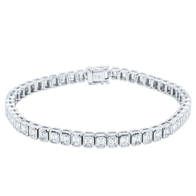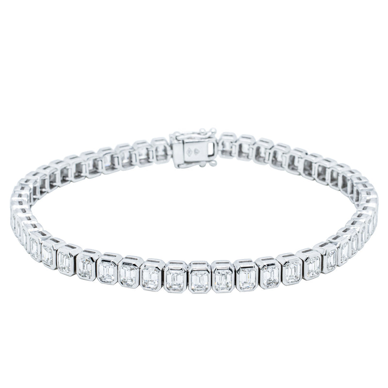 This elegant diamond tennis bracelet is meticulously crafted from 18ct white gold. It boasts fifty-one rectangular rub-over set emerald cut diamonds. These diamonds glisten and shine from all angles. This bracelet is secured with a hidden clasp and a pair of safety catches.