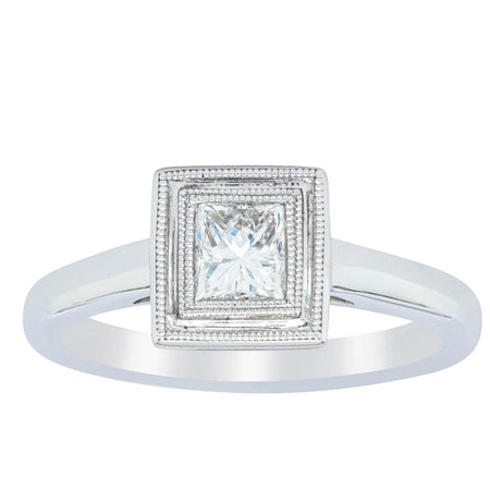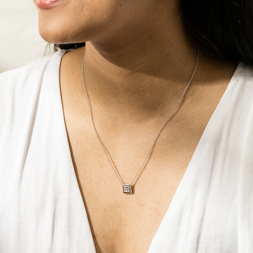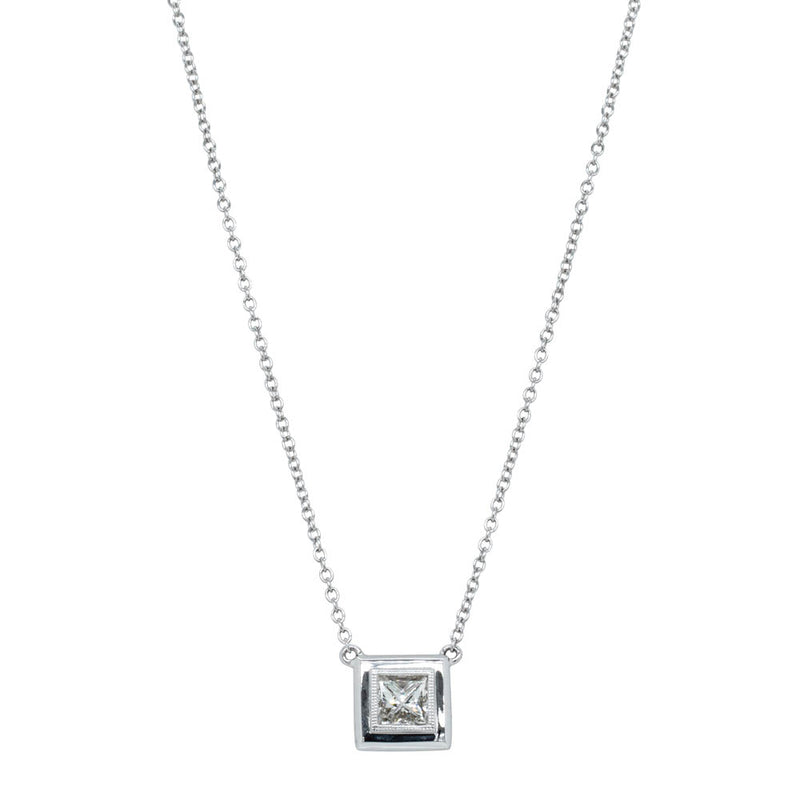 Luxuriously crafted in 18ct white gold from our signature 1899 collection , this darling pendant boasts one princess cut diamond, framed within a square bezel.