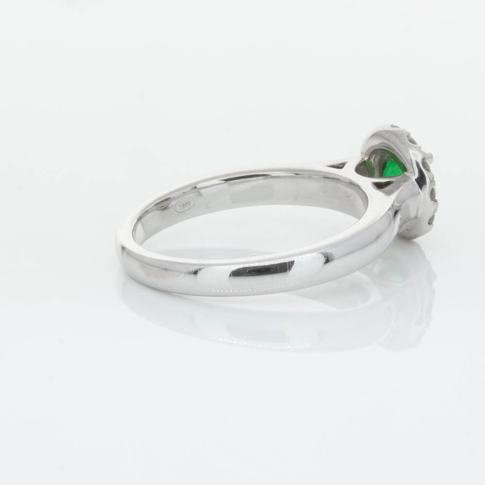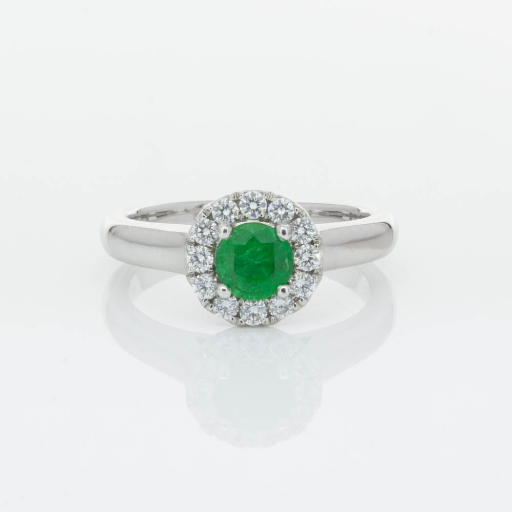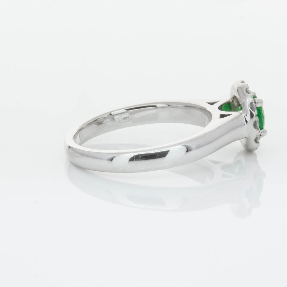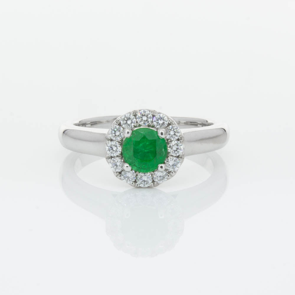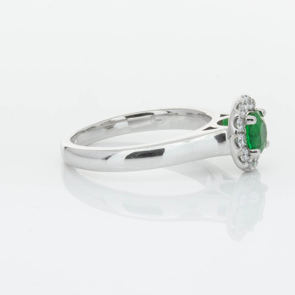 Embody sophistication in this timeless emerald and diamond ring. This striking ring boasts a bright green emerald framed by a sparkling diamond halo, set in 18ct white gold from our high palladium 1899 collection. An elegant ring that you will adore.
