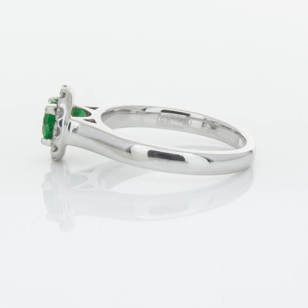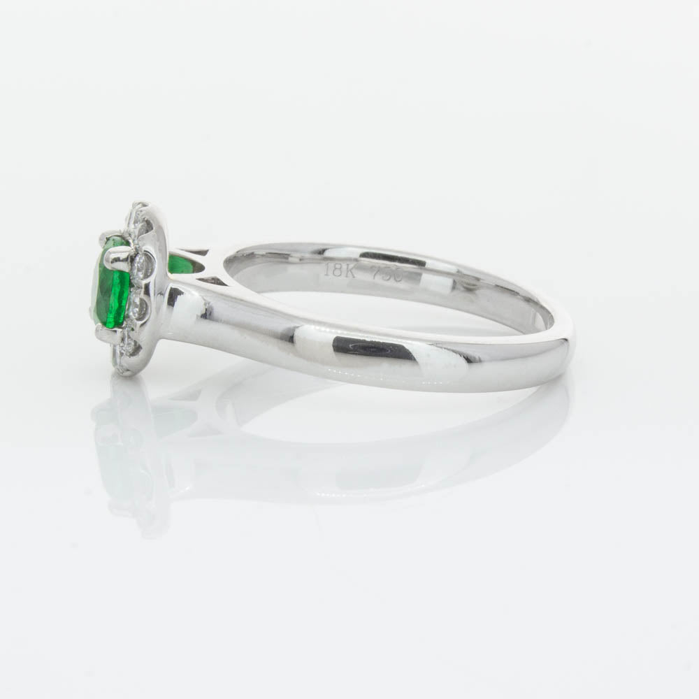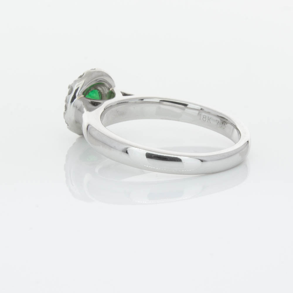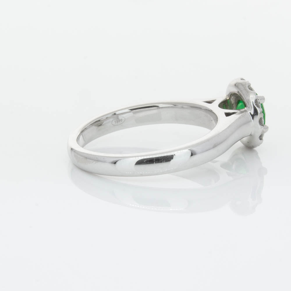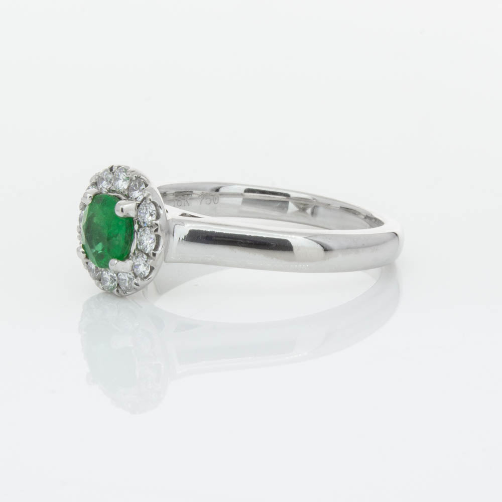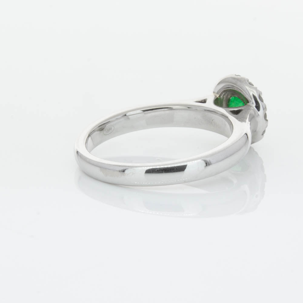 Embody sophistication in this timeless emerald and diamond ring. This striking ring boasts a bright green emerald framed by a sparkling diamond halo, set in 18ct white gold from our high palladium 1899 collection. An elegant ring that you will adore.