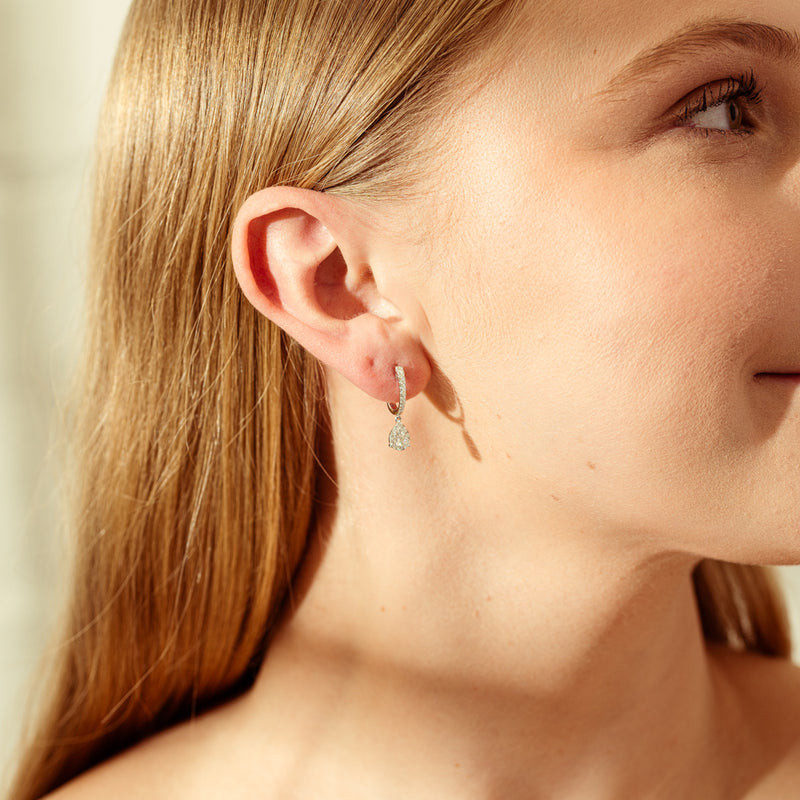 Dazzle in these sparkling 18ct white gold and diamond huggie drop earrings. These sparkling earrings feature 42 round brilliant cut diamonds with an impressive total diamond weight of .60ct. Let the sparkle of these diamonds, add sparkle to your collection!
