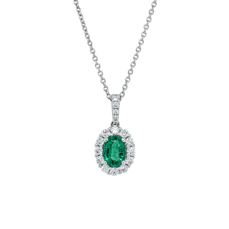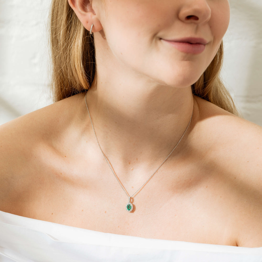 A wonderful surprise for a May-born beauty, or someone with glistening green eyes! This pendant boasts a vibrant .63ct oval faceted emerald surrounded by a glittering diamond halo. Set in divine 18ct white gold, this will soon become her favourite piece.