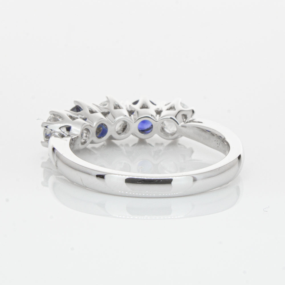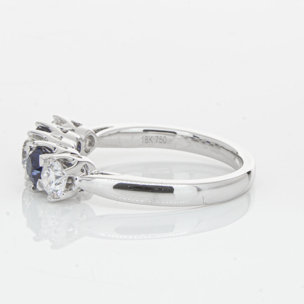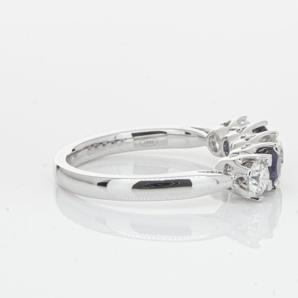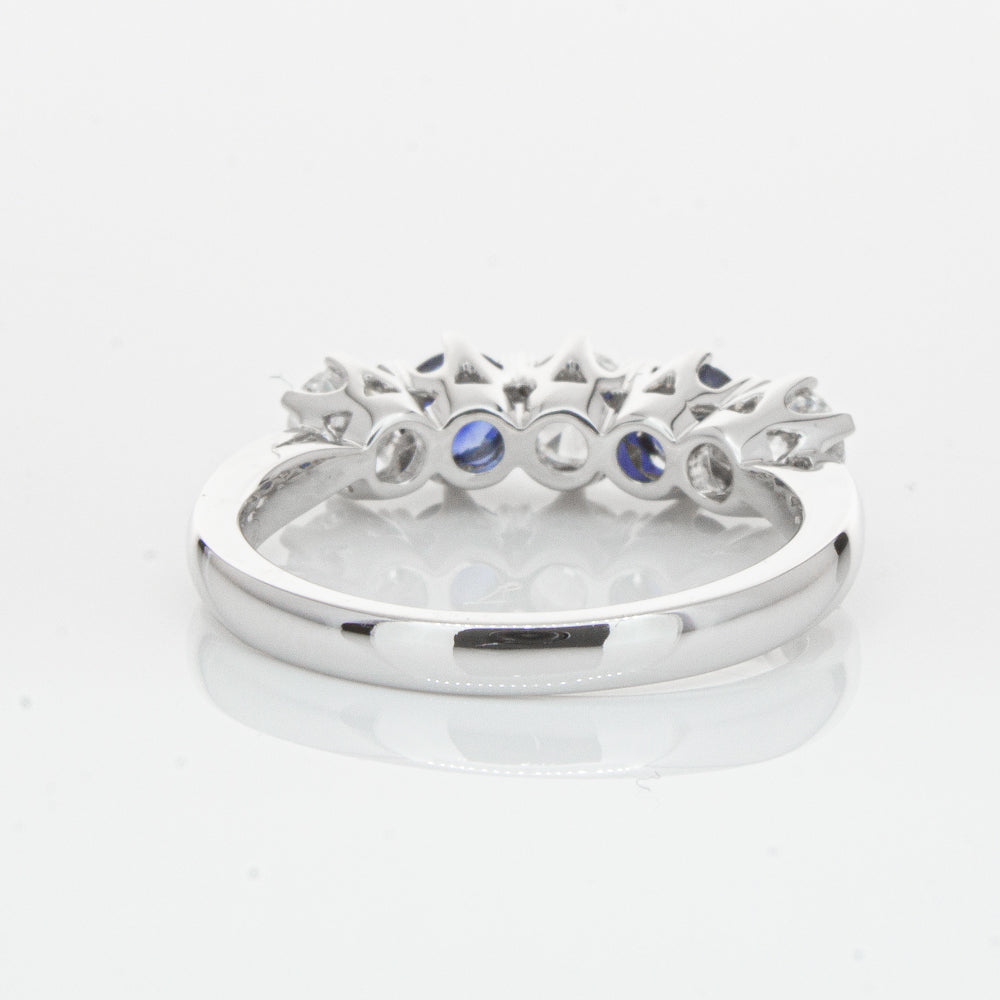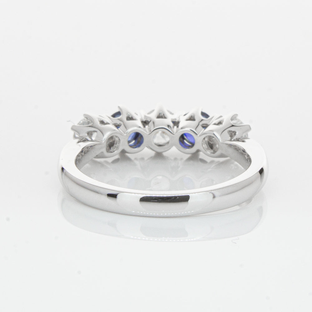 With lots of sparkle, this dazzling sapphire and diamond Pentagon ring will make a beautiful wedding or eternity ring. Elegantly crafted from luxurious 18ct white gold this special ring features two dark blue sapphires with three glistening round brilliant cut diamonds.