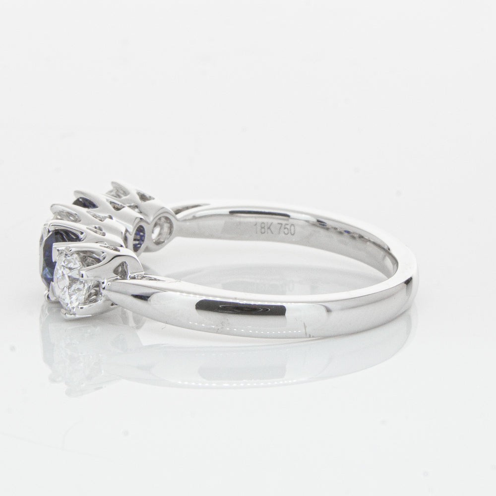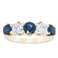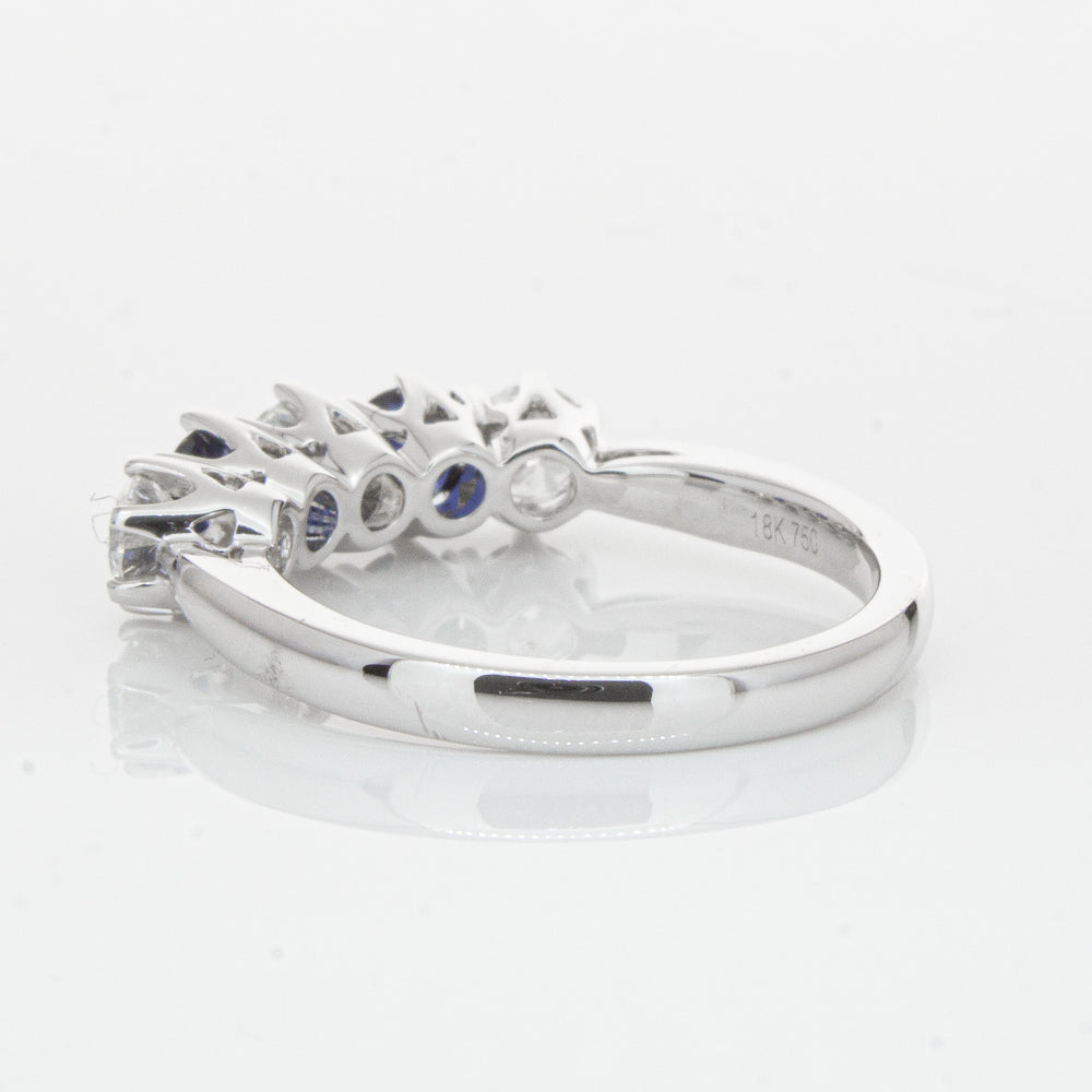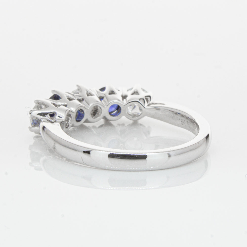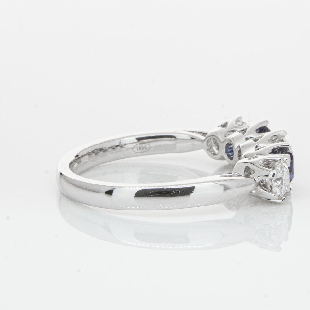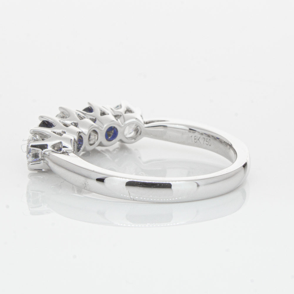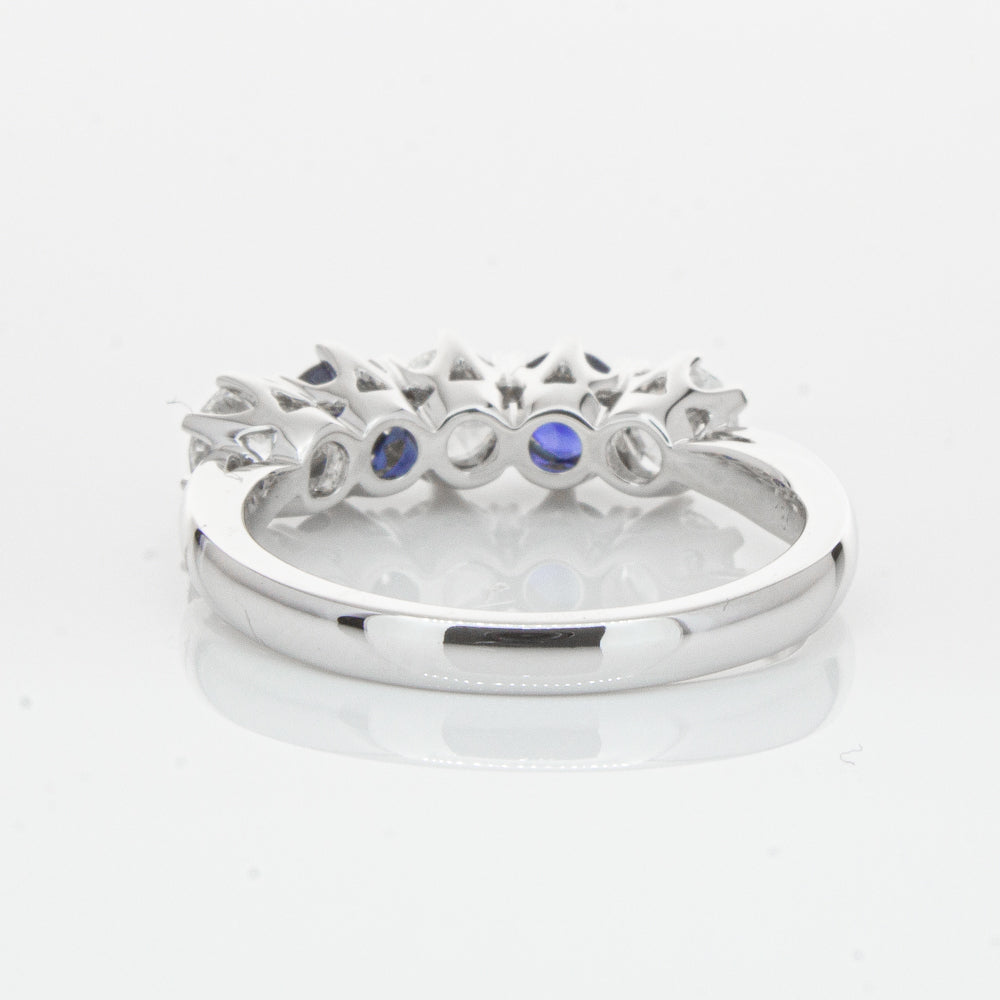 With lots of sparkle, this dazzling sapphire and diamond Pentagon ring will make a beautiful wedding or eternity ring. Elegantly crafted from luxurious 18ct white gold this special ring features two dark blue sapphires with three glistening round brilliant cut diamonds.