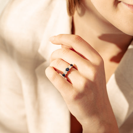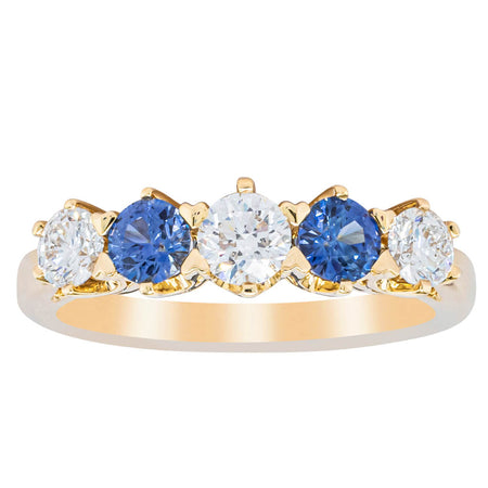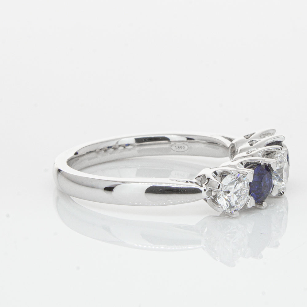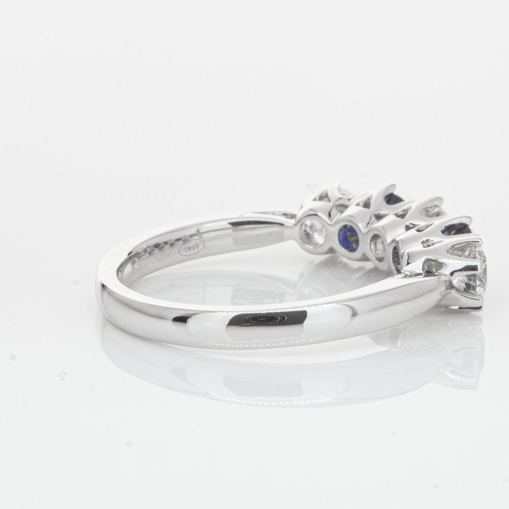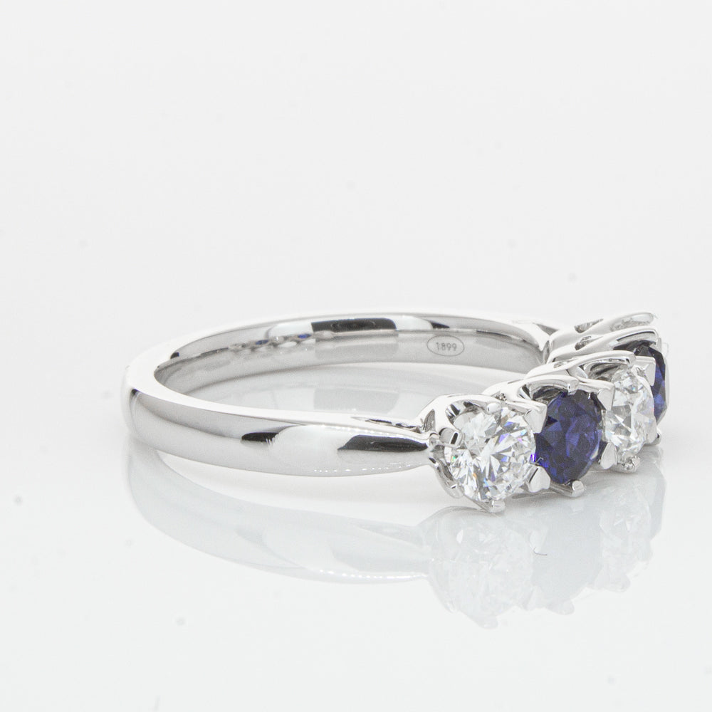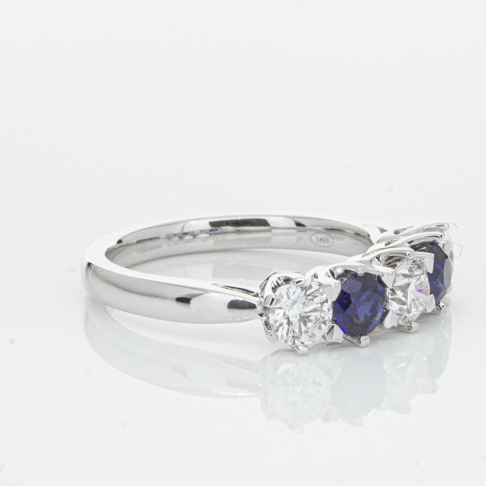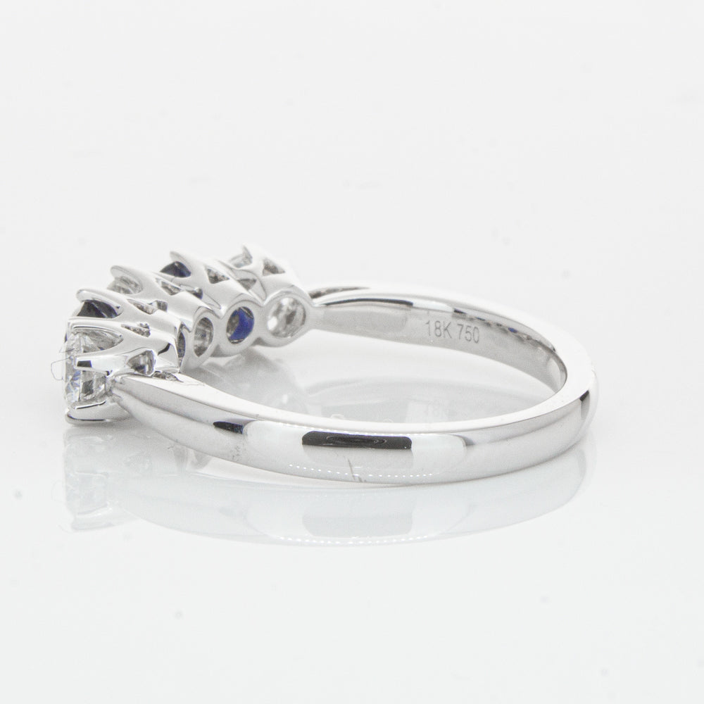 With lots of sparkle, this dazzling sapphire and diamond Pentagon ring will make a beautiful wedding or eternity ring. Elegantly crafted from luxurious 18ct white gold this special ring features two dark blue sapphires with three glistening round brilliant cut diamonds.