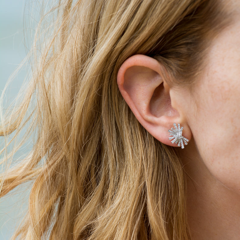 She will sparkle with sophistication in these glittering diamond Asteroid stud earrings. Crafted to perfection from luxurious 18ct white gold, these delightful Deco style earrings feature a starburst of shimmering white diamonds exploding from the centre. You won't be able to take your eyes off her!
