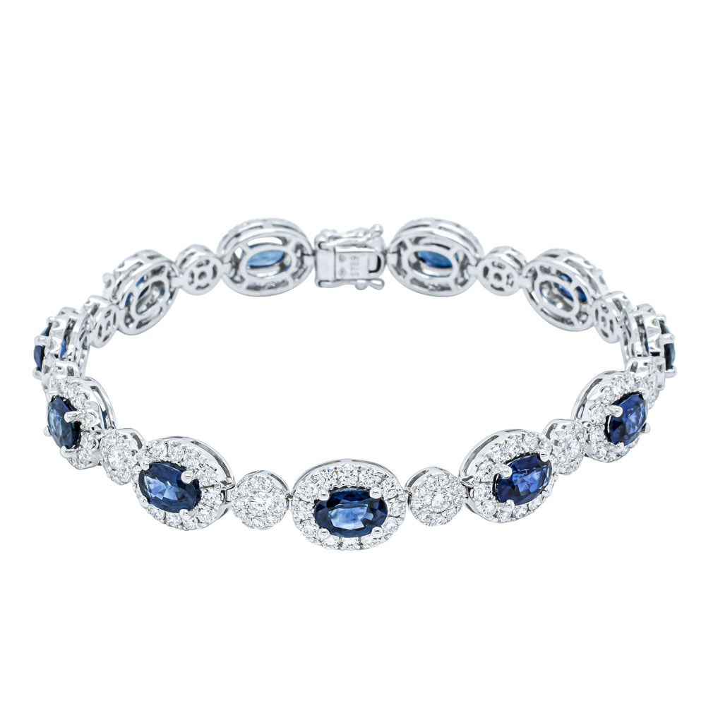 Carefully crafted in luxurious 18ct white gold, this sapphire and diamond bracelet features 11 oval faceted sapphires framed by sparkling halos of round brilliant cut diamonds. This bracelet features 242 diamonds and is secured with a hidden clasp and a pair of safety catches, creating a timeless piece.