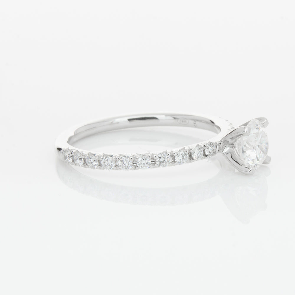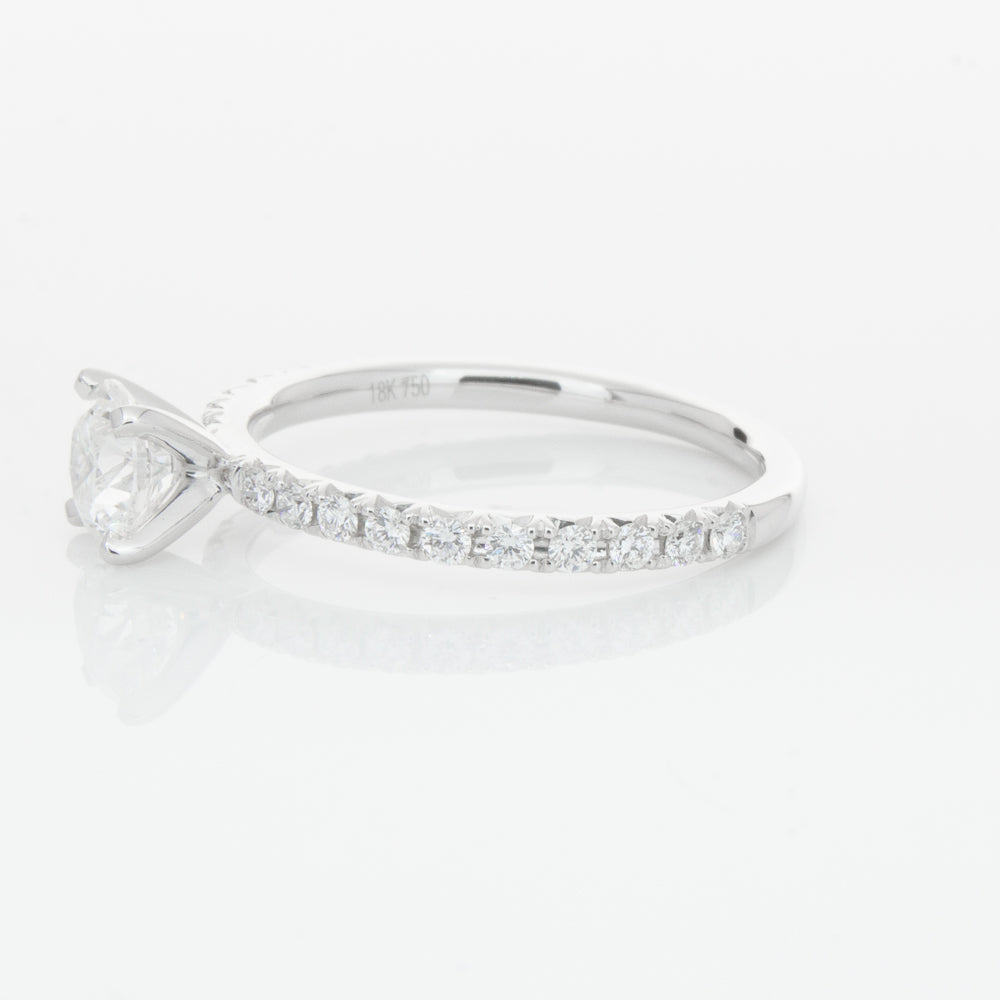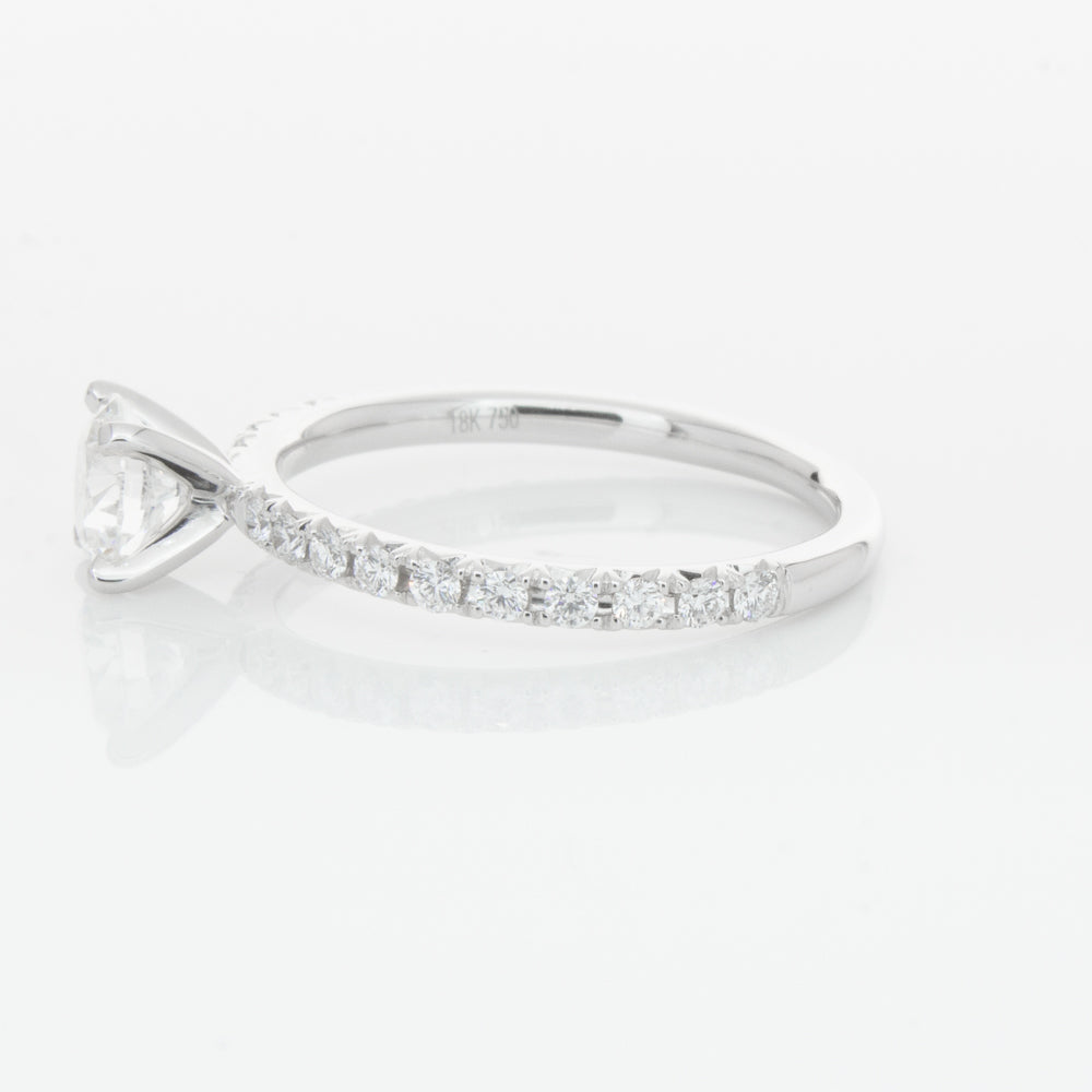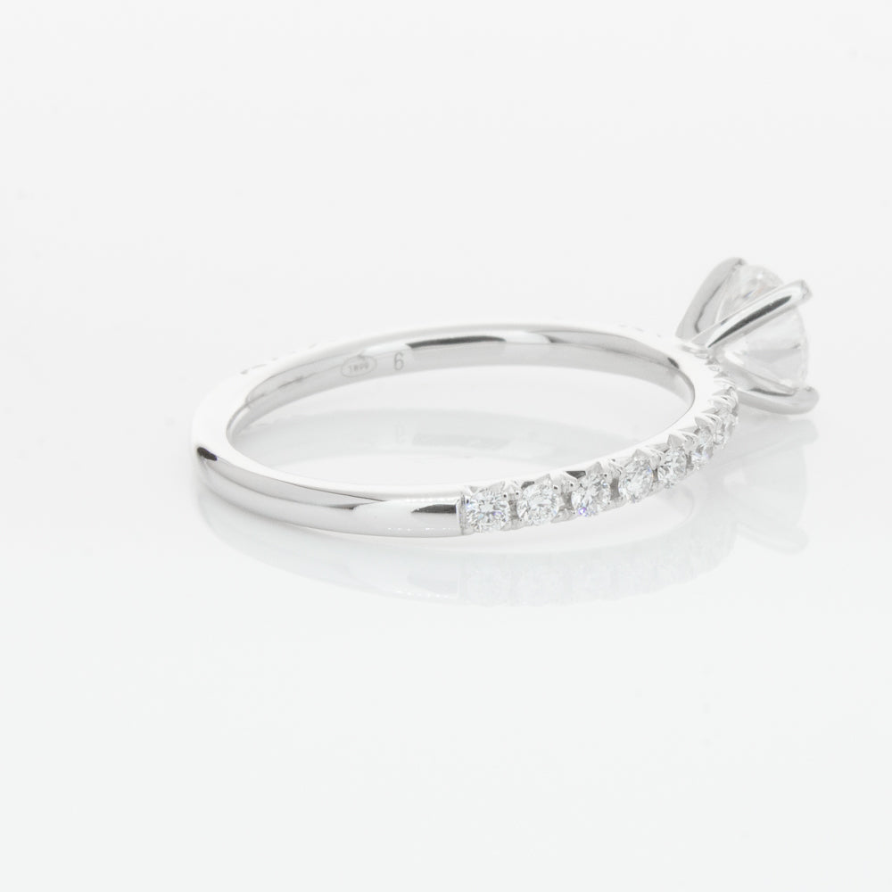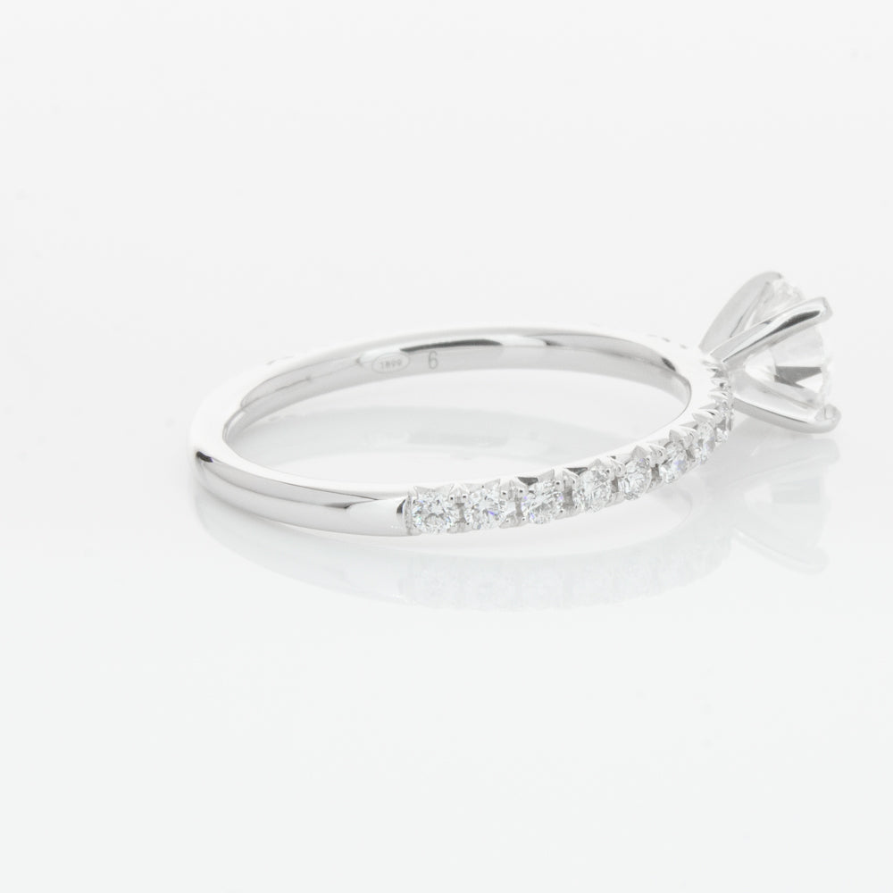 Crafted from beautiful 18ct white gold from our signature 1899 collection, this ring boasts a dazzling .70ct round brilliant cut centre diamond which rests in a four claw "V" type setting. Complete with diamond set shoulders this ring is perfect for the beautiful you!