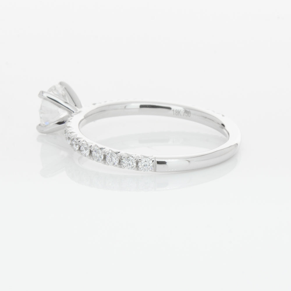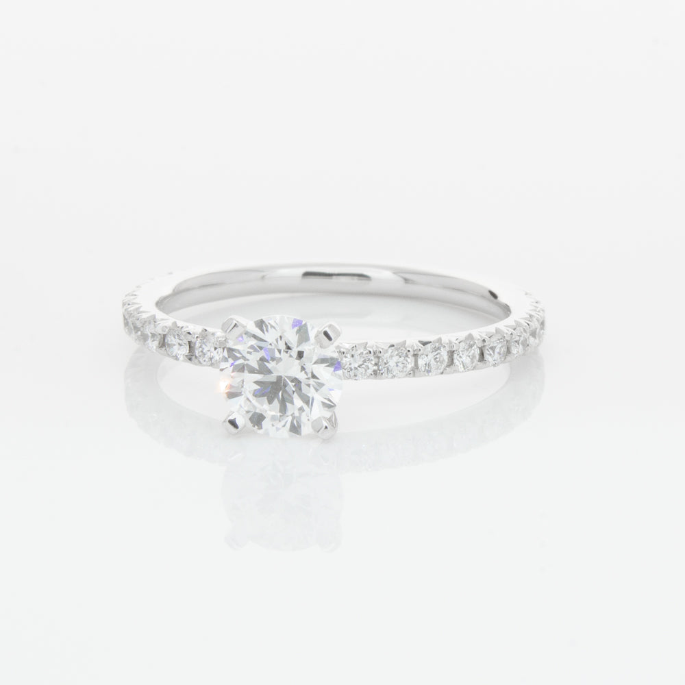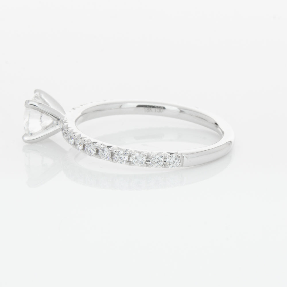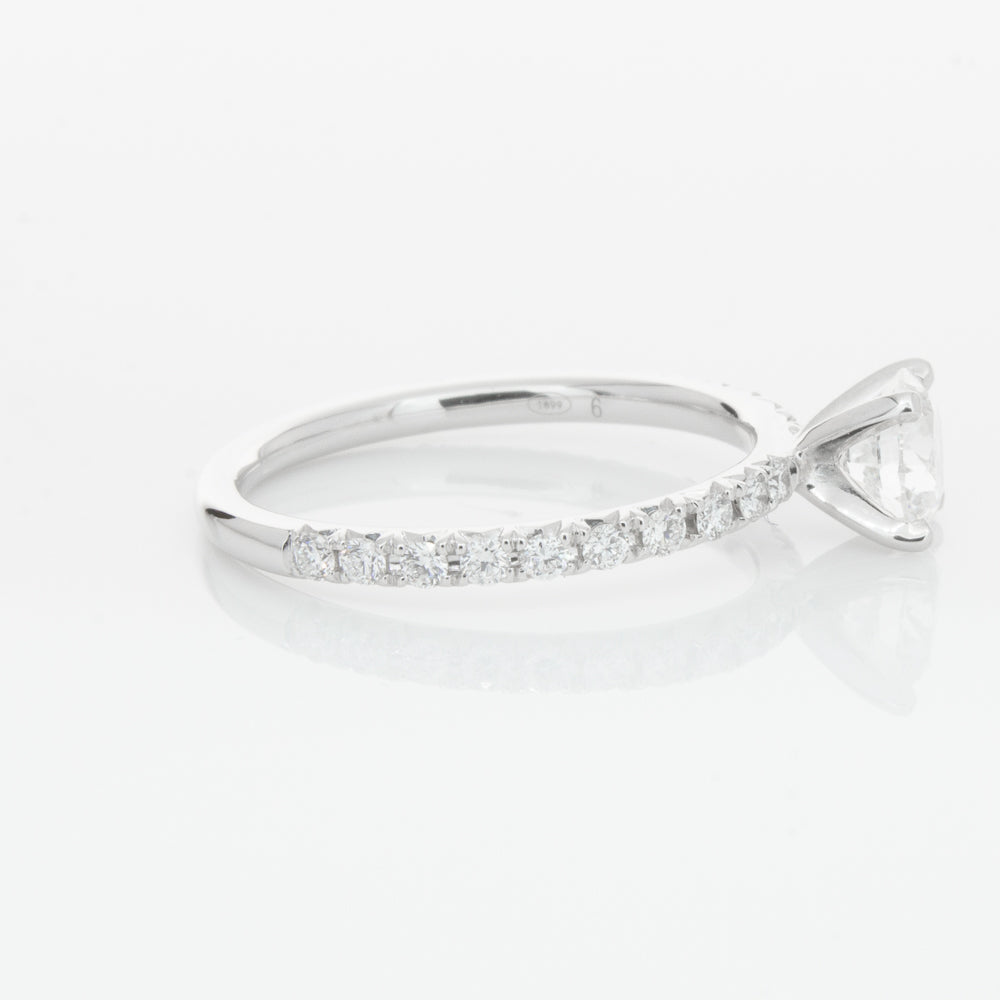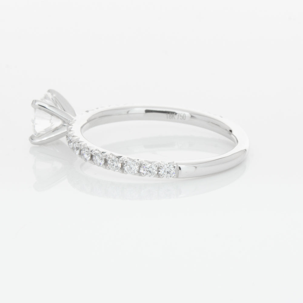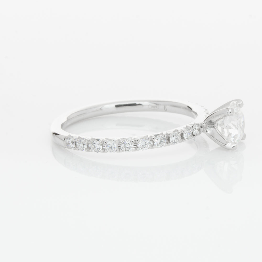 Crafted from beautiful 18ct white gold from our signature 1899 collection, this ring boasts a dazzling .70ct round brilliant cut centre diamond which rests in a four claw "V" type setting. Complete with diamond set shoulders this ring is perfect for the beautiful you!