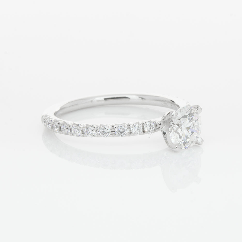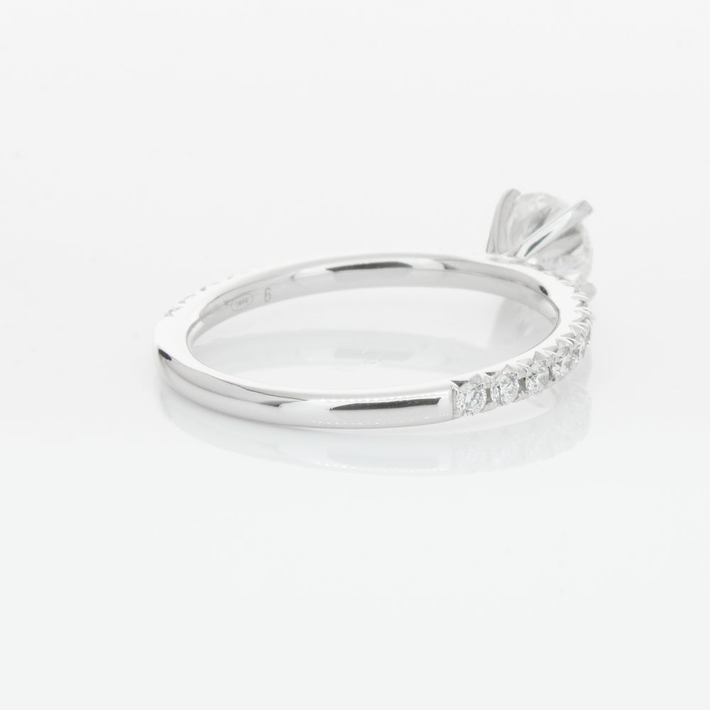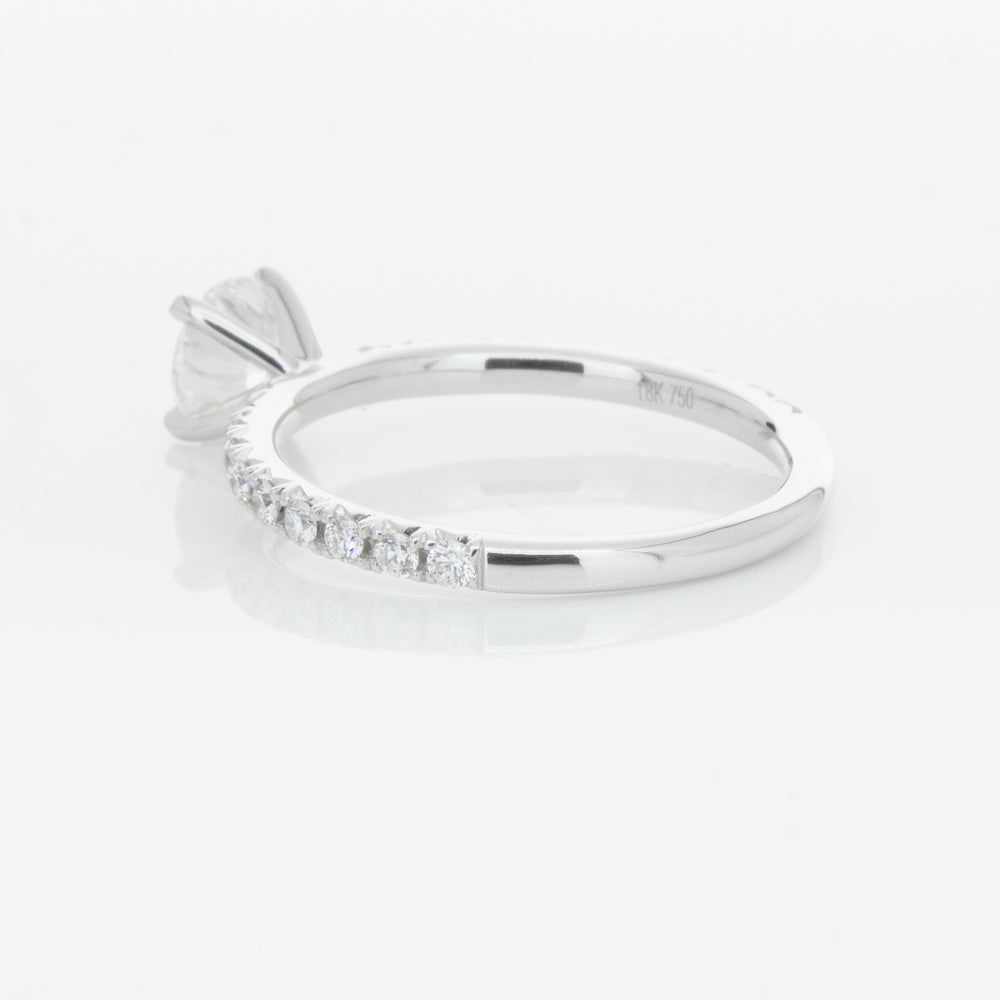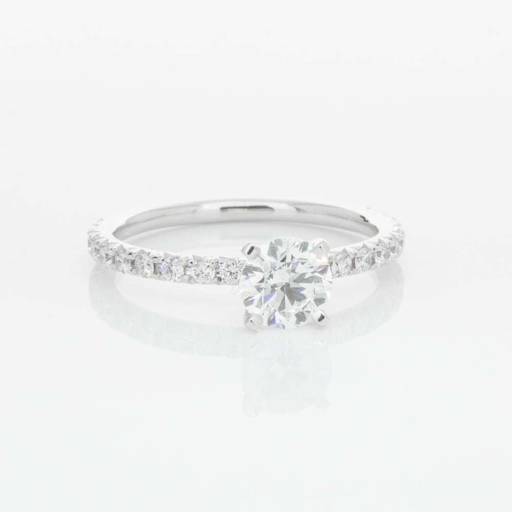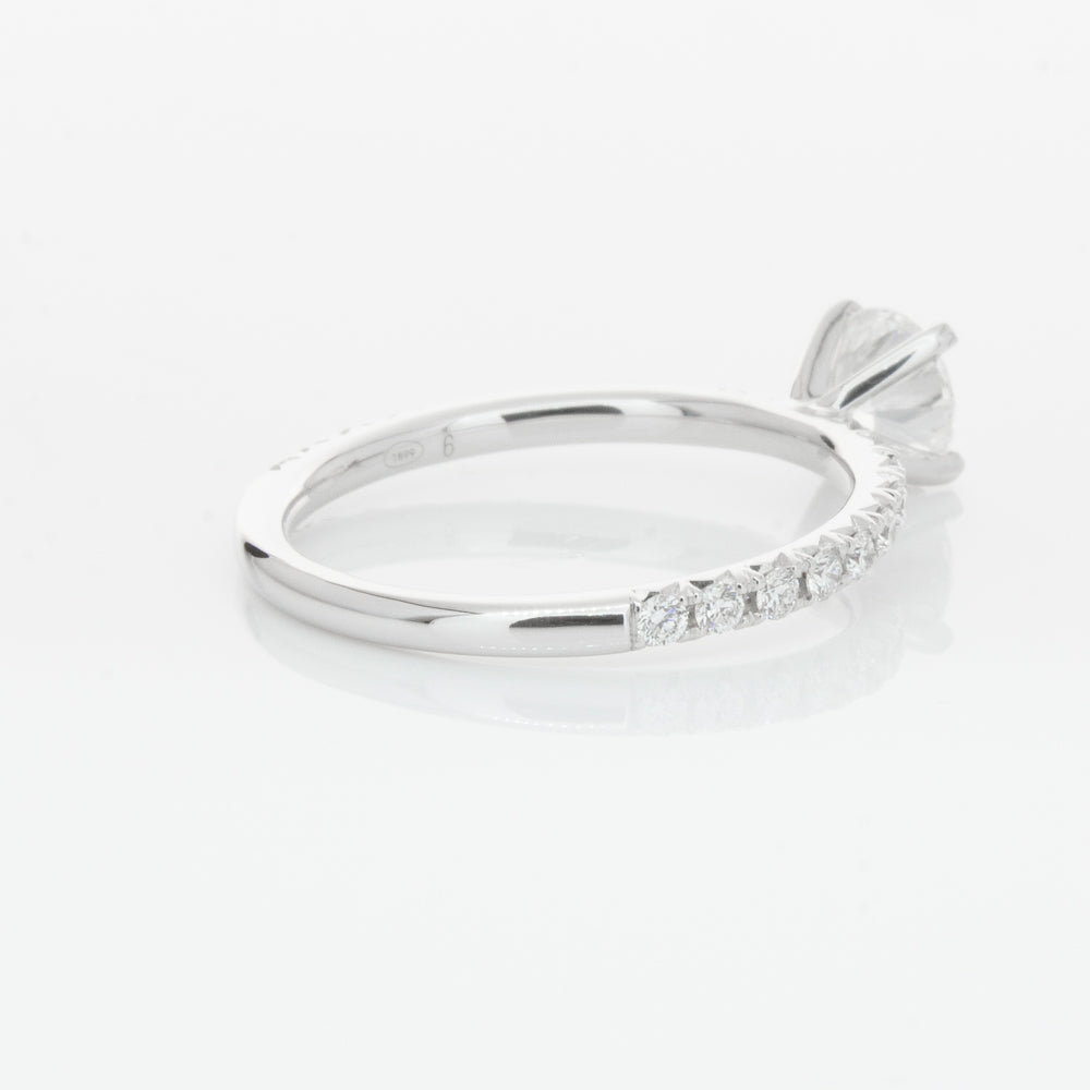Crafted from beautiful 18ct white gold from our signature 1899 collection, this ring boasts a dazzling .70ct round brilliant cut centre diamond which rests in a four claw "V" type setting. Complete with diamond set shoulders this ring is perfect for the beautiful you!