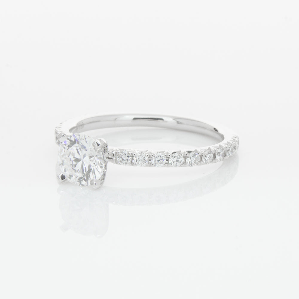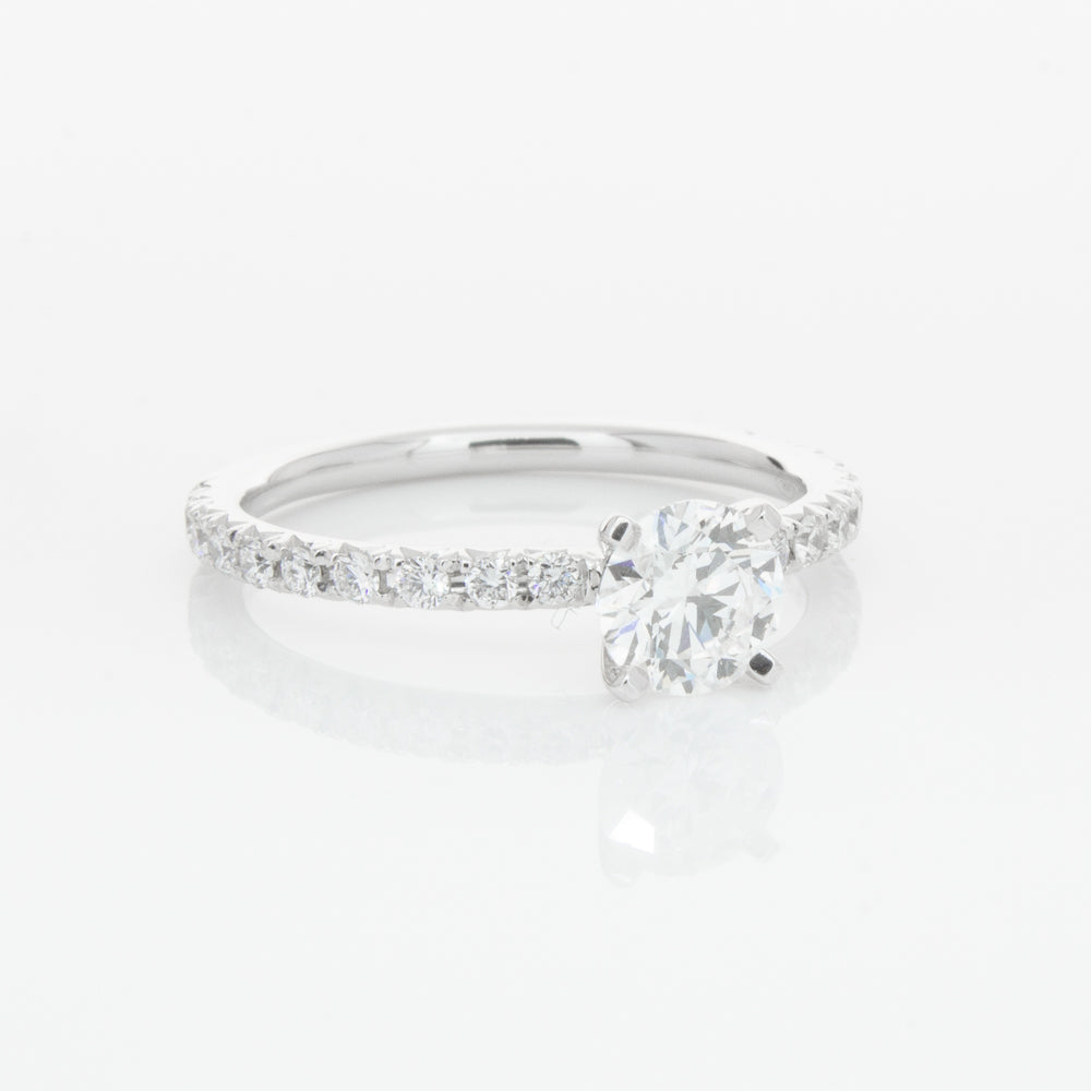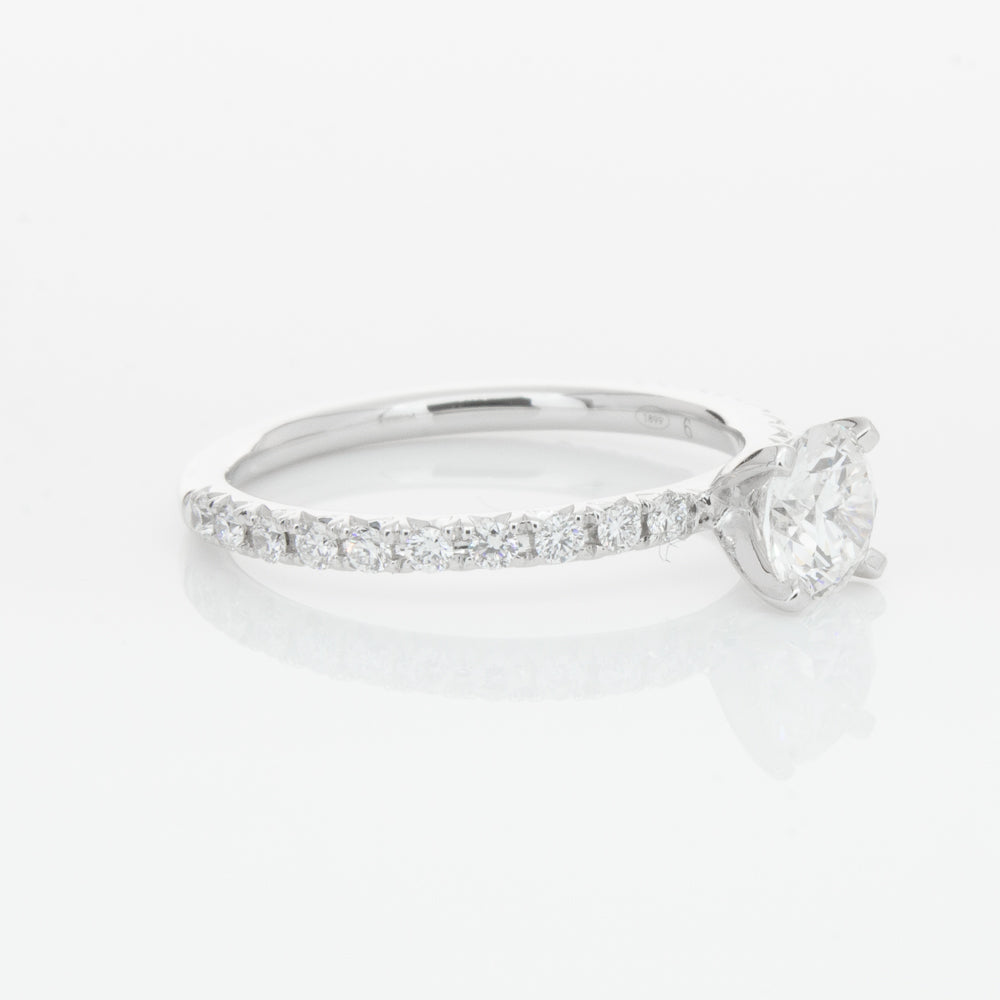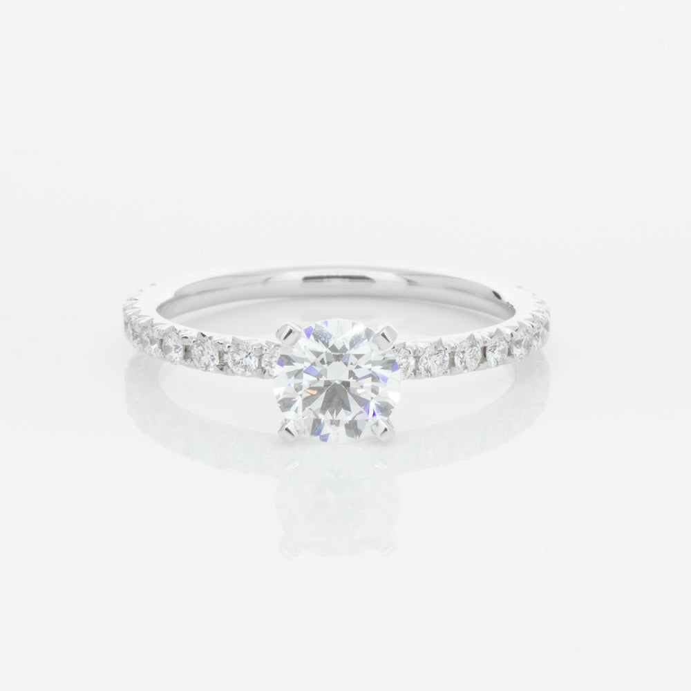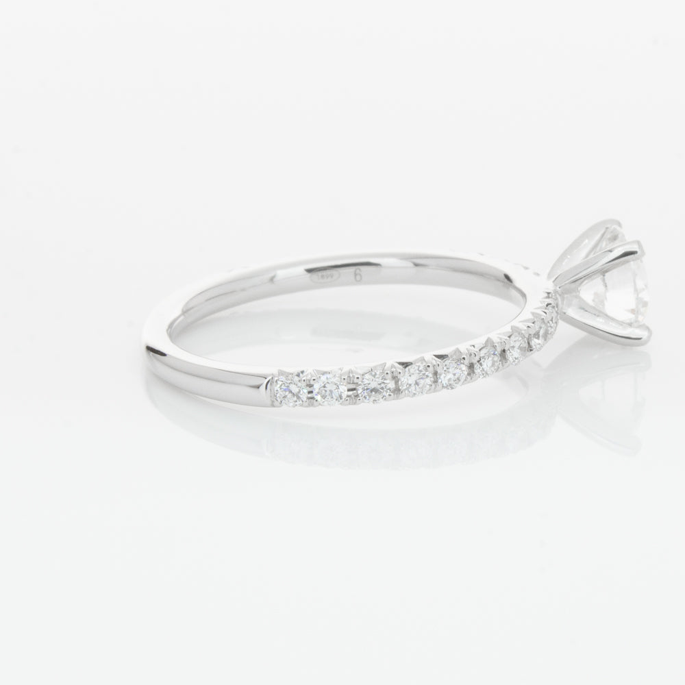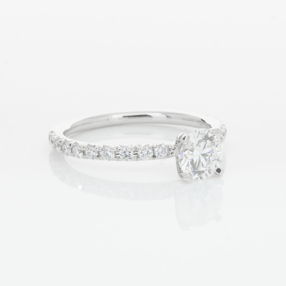 Crafted from beautiful 18ct white gold from our signature 1899 collection, this ring boasts a dazzling .70ct round brilliant cut centre diamond which rests in a four claw "V" type setting. Complete with diamond set shoulders this ring is perfect for the beautiful you!