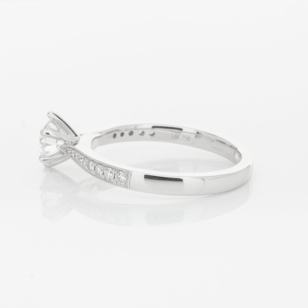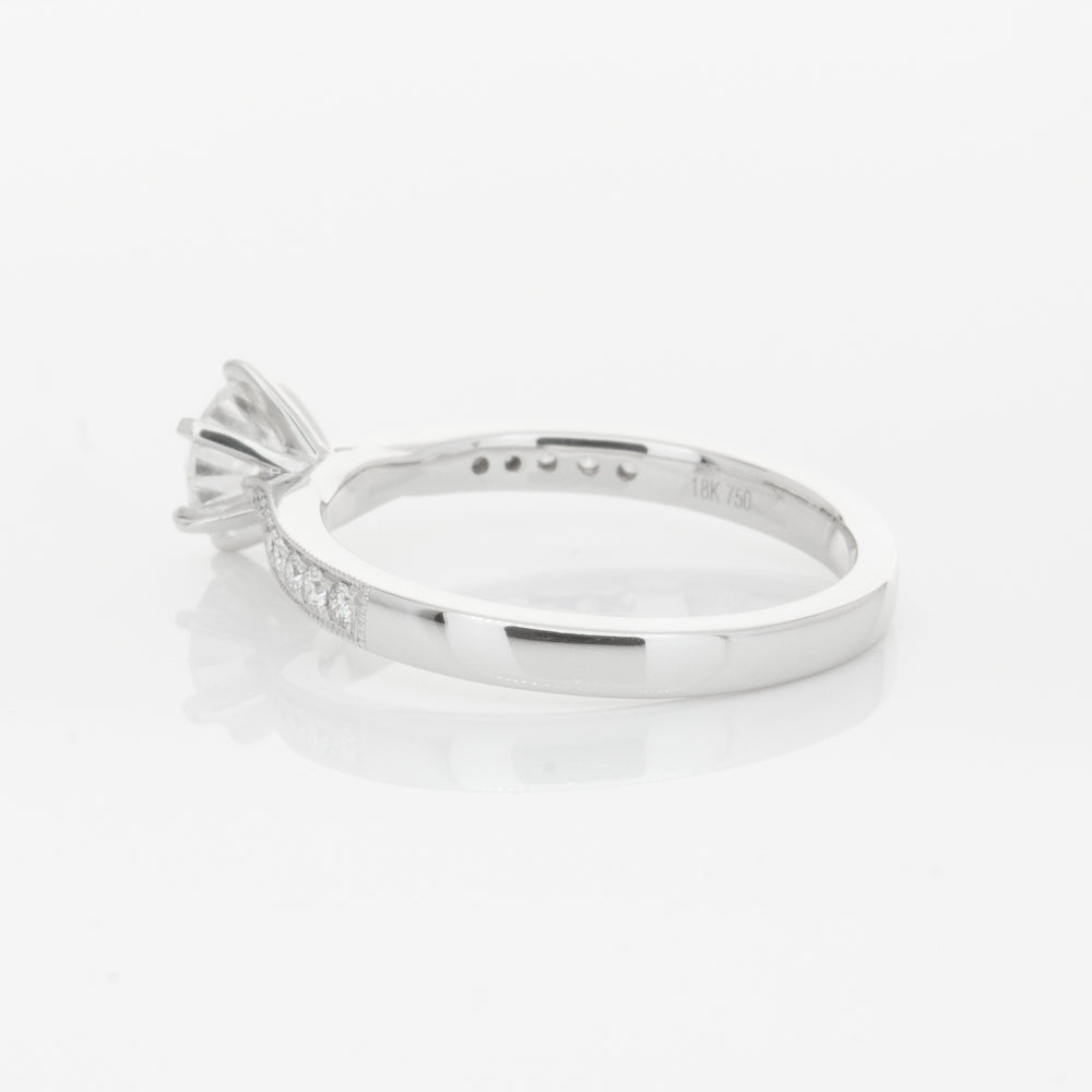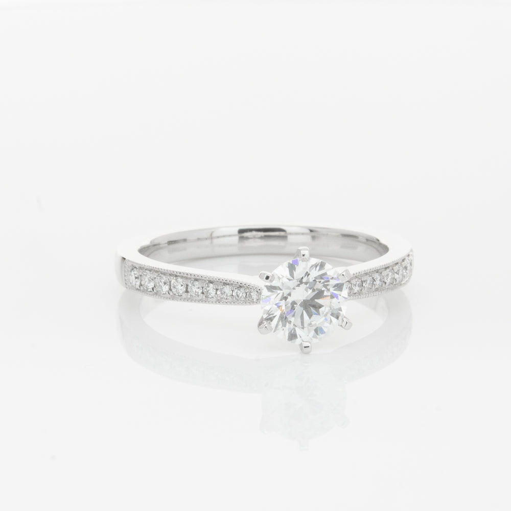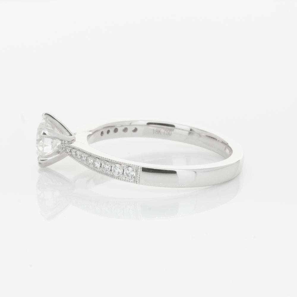 A delicate diamond set band with milgrain detailing, tapers towards the zenith to showcase a sparkling diamond.