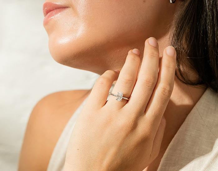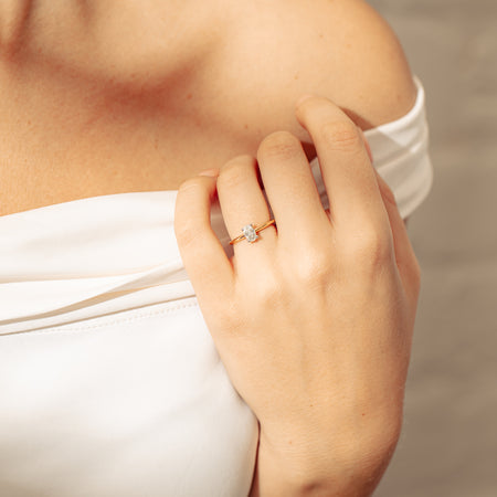 A fine minimalist design, Melba was named after the Greek word for 'slender'. The barely-there slim band allows the diamond to float above the finger.