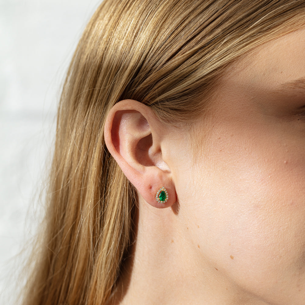 Simply mesmerising.. these vibrant emerald & diamond halo studs will have her falling in love! Carefully set in shining 18ct yellow gold, this precious pair boast two pear faceted emeralds framed by a dazzling white diamond halo. She will think of you whenever she wears them!