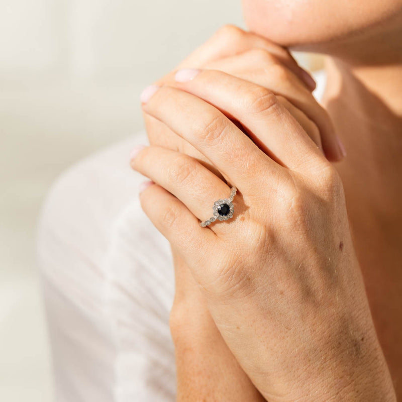 Carefully crafted in high palladium 18ct white gold from our signature 1899 collection this paramount ring features a .76ct round faceted sapphire framed by a shimmering halo of round brilliant cut diamonds. You won't be able to resist showing of this lovely ring.