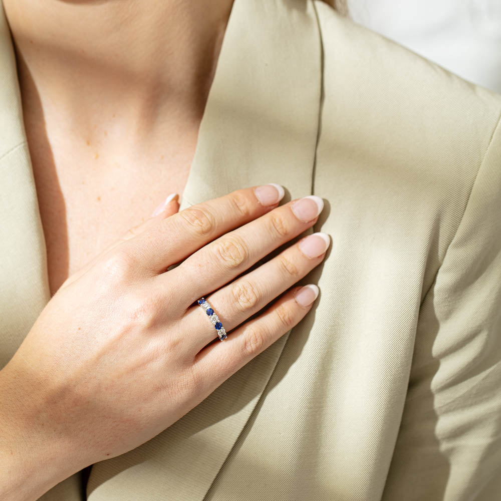 Hand crafted in high palladium 18ct white gold, this beautiful ring boasts blue sapphires alternating with round brilliant cut diamonds.