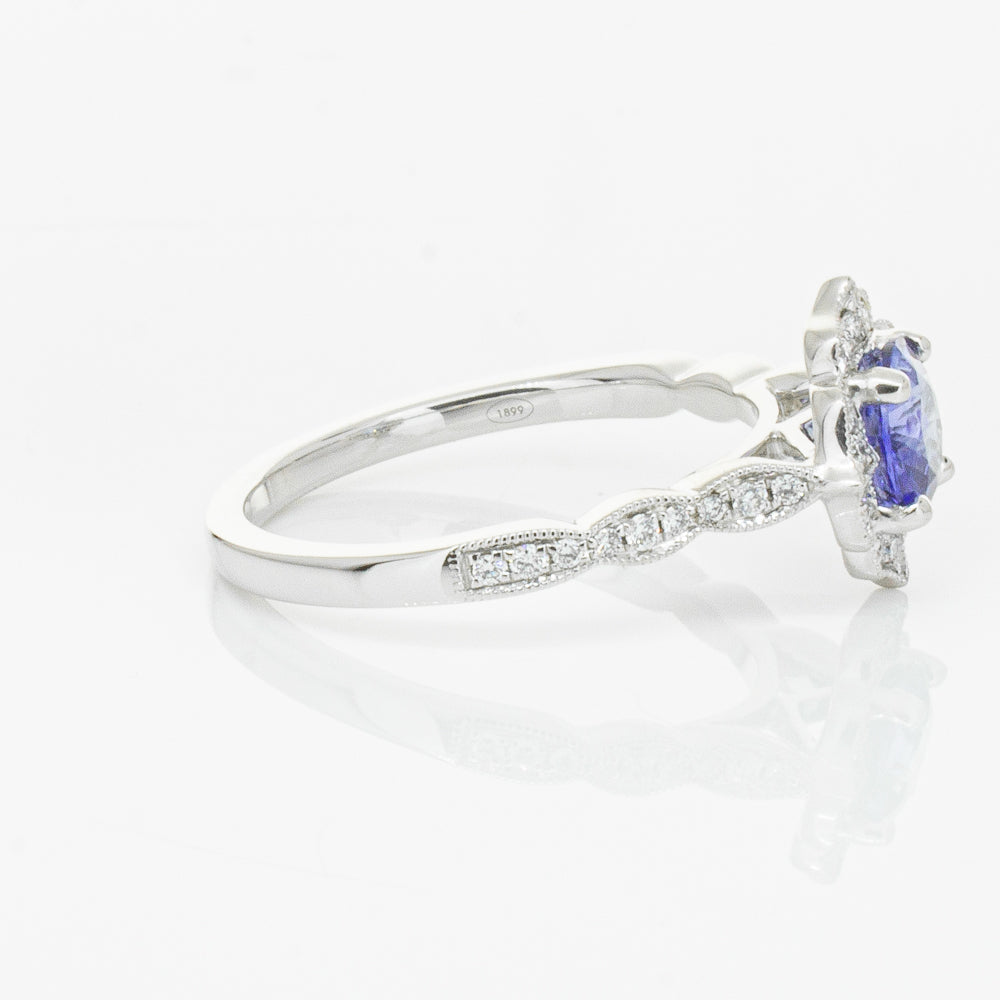 Carefully crafted in 18ct white gold from our signature 1899 collection this paramount ring features a .95ct round faceted sapphire framed by a shimmering halo of round brilliant cut diamonds. You won't be able to resist showing of this lovely ring.