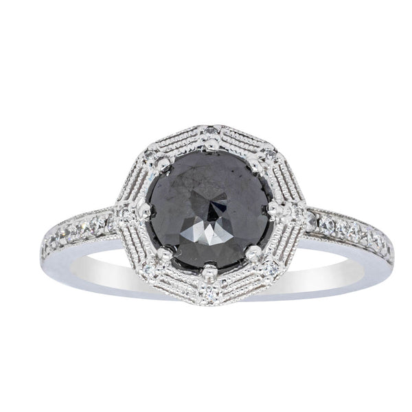 Elegantly set in 18ct white gold, this special ring from our signature 1899 collection features one impressive rose cut black diamond surrounded by a halo and detailed white diamond shoulders.