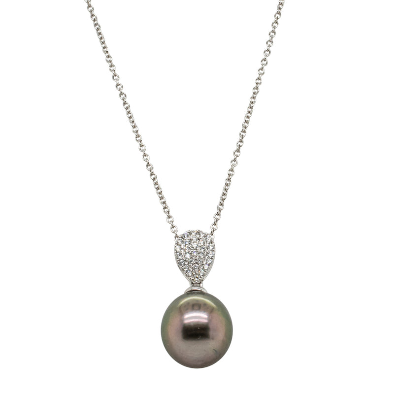 This elegant necklace features a rosy grey Tahitian pearl. Set in luxurious 18ct white gold from our signature 1899 collection, this luminous pearl swings beneath a diamond set, pear shaped mount.