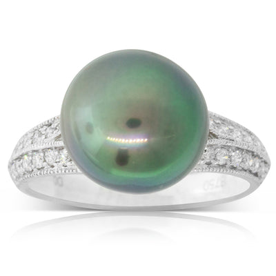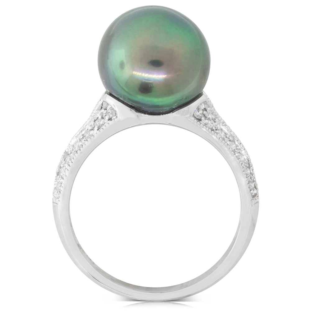 18ct White Gold Black Pearl & Diamond Shoulders Ring