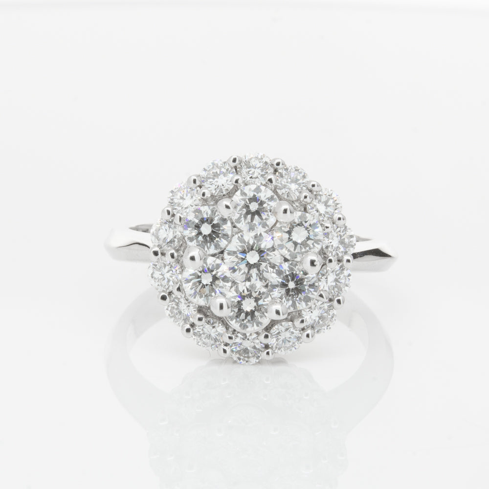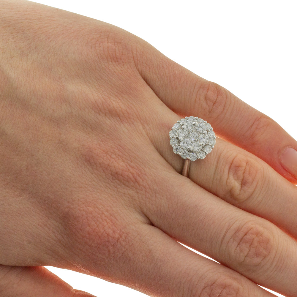 A bouquet of diamonds! You will adore this beautiful ring as it sparkles from every angle. Crafted in 18ct white gold, this stunning ring shimmers with twenty one round round brilliant cut diamonds set in a three tier cluster setting.