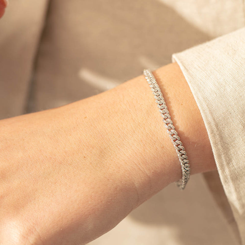 Add gorgeous gleam to your wrist with this diamond curb link bracelet crafted from 18ct white gold. 412 round brilliant cut diamonds encircle the bracelet, adding sparkling luxury.
