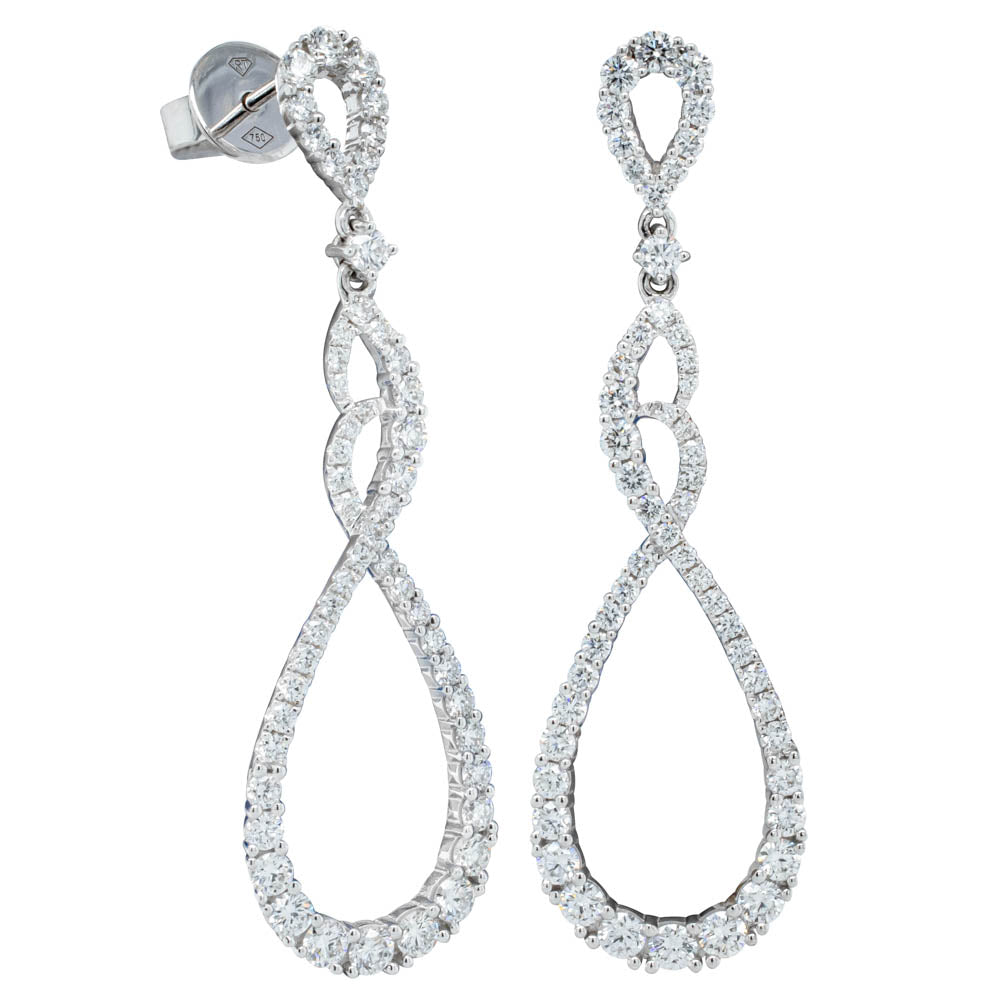 These beautiful diamond earrings boasts a pear shaped drop suspended from beautiful diamond set mount. Crafted from shining 18ct white gold. Go on, make a statement!