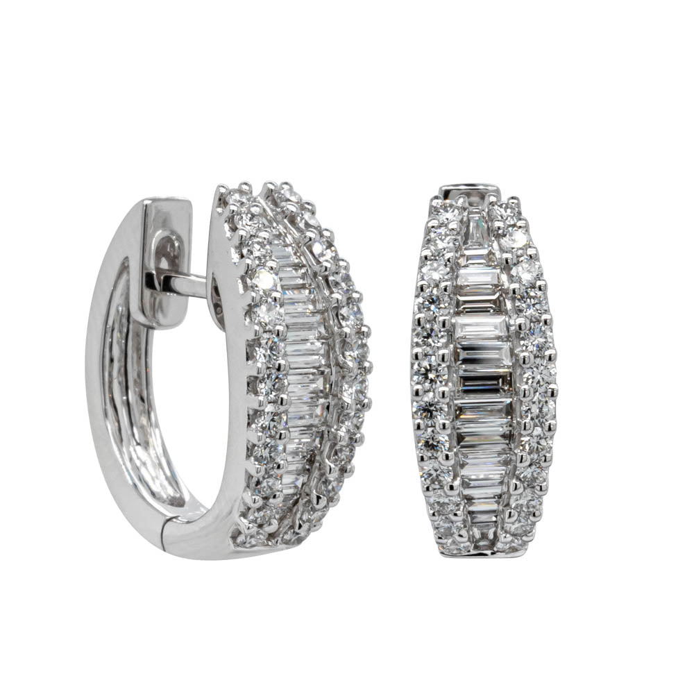 18ct white gold hoop earrings featuring baguette cut and round brilliant cut diamonds.