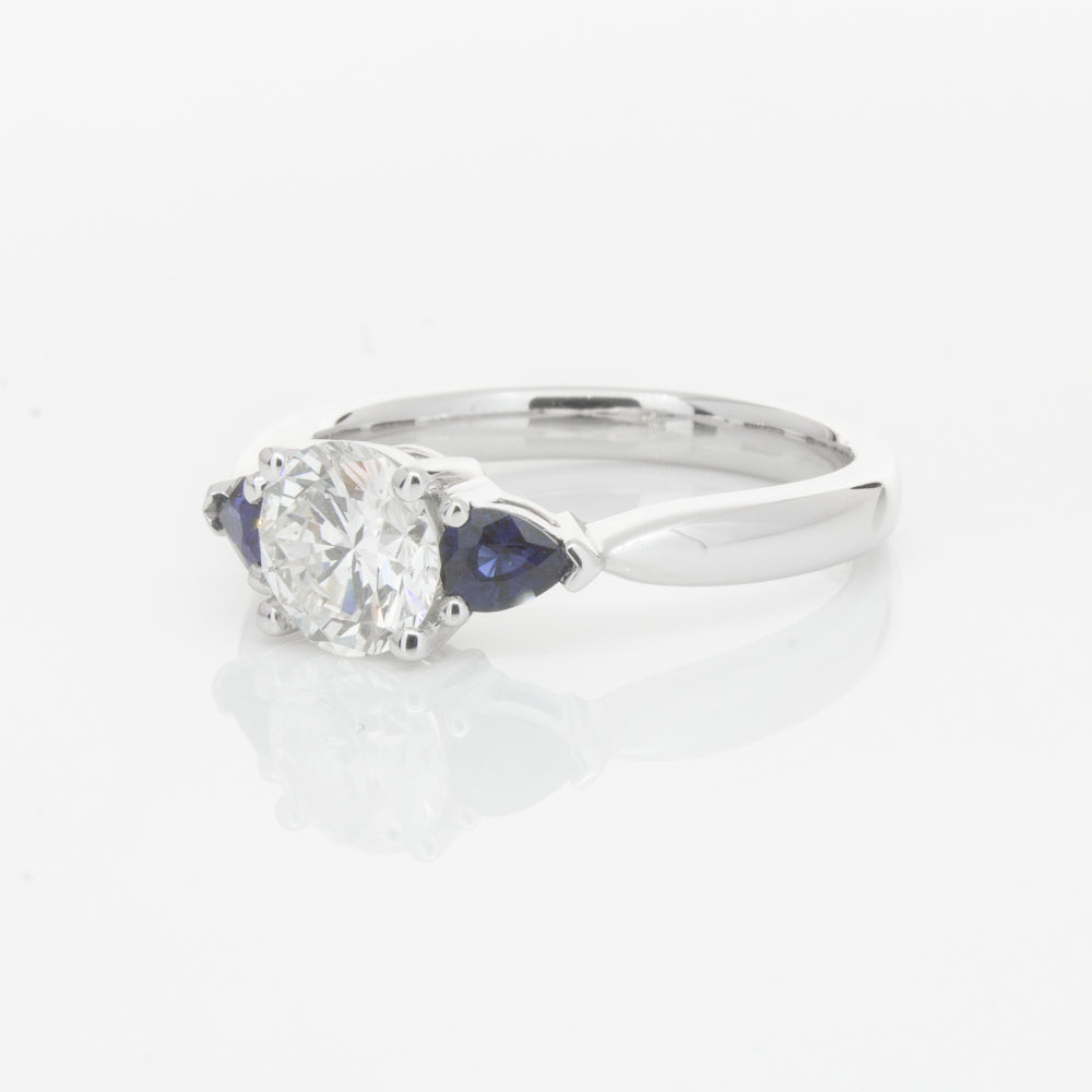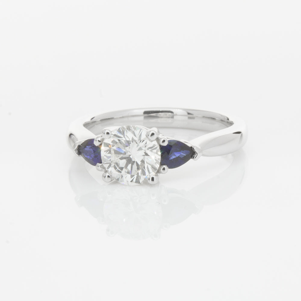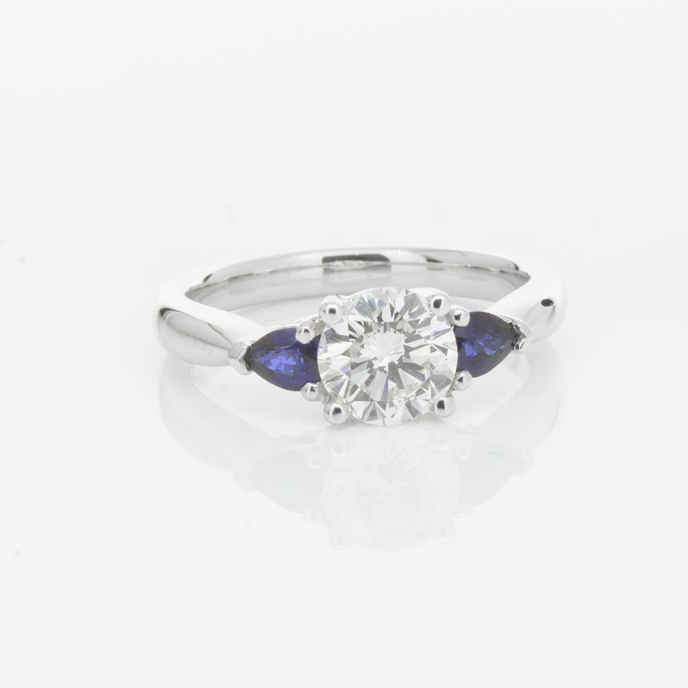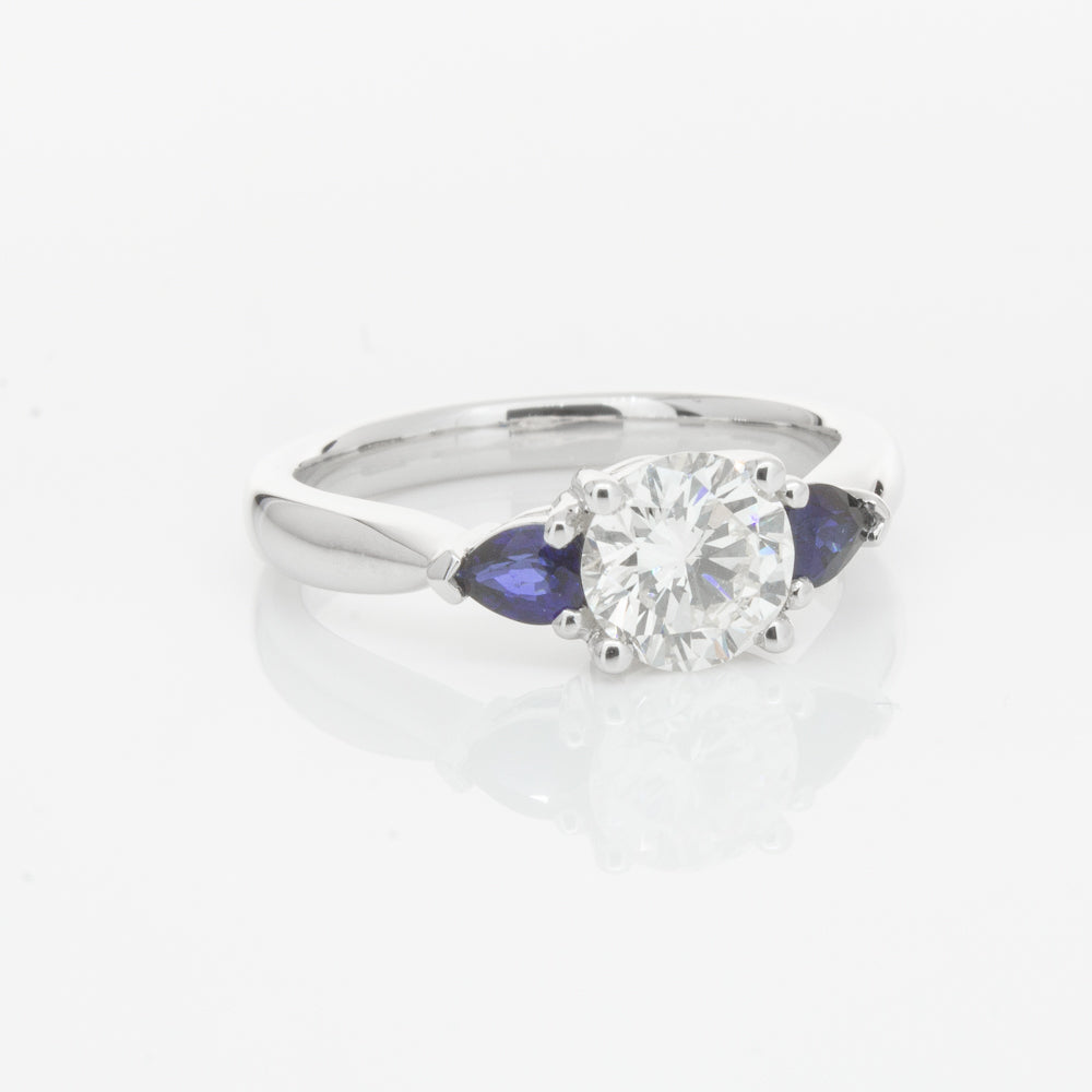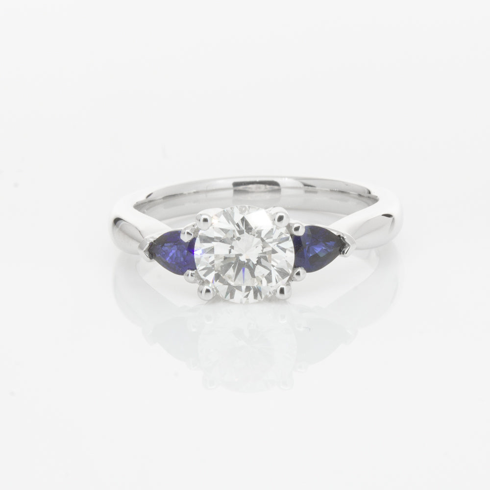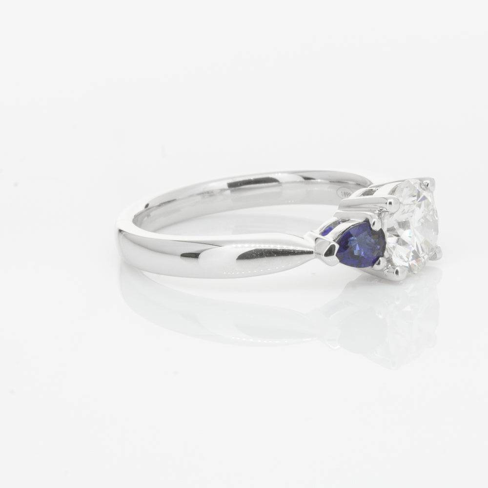 18ct white gold ring featuring one round brilliant cut diamond framed by two deep blue pear cut sapphires.
