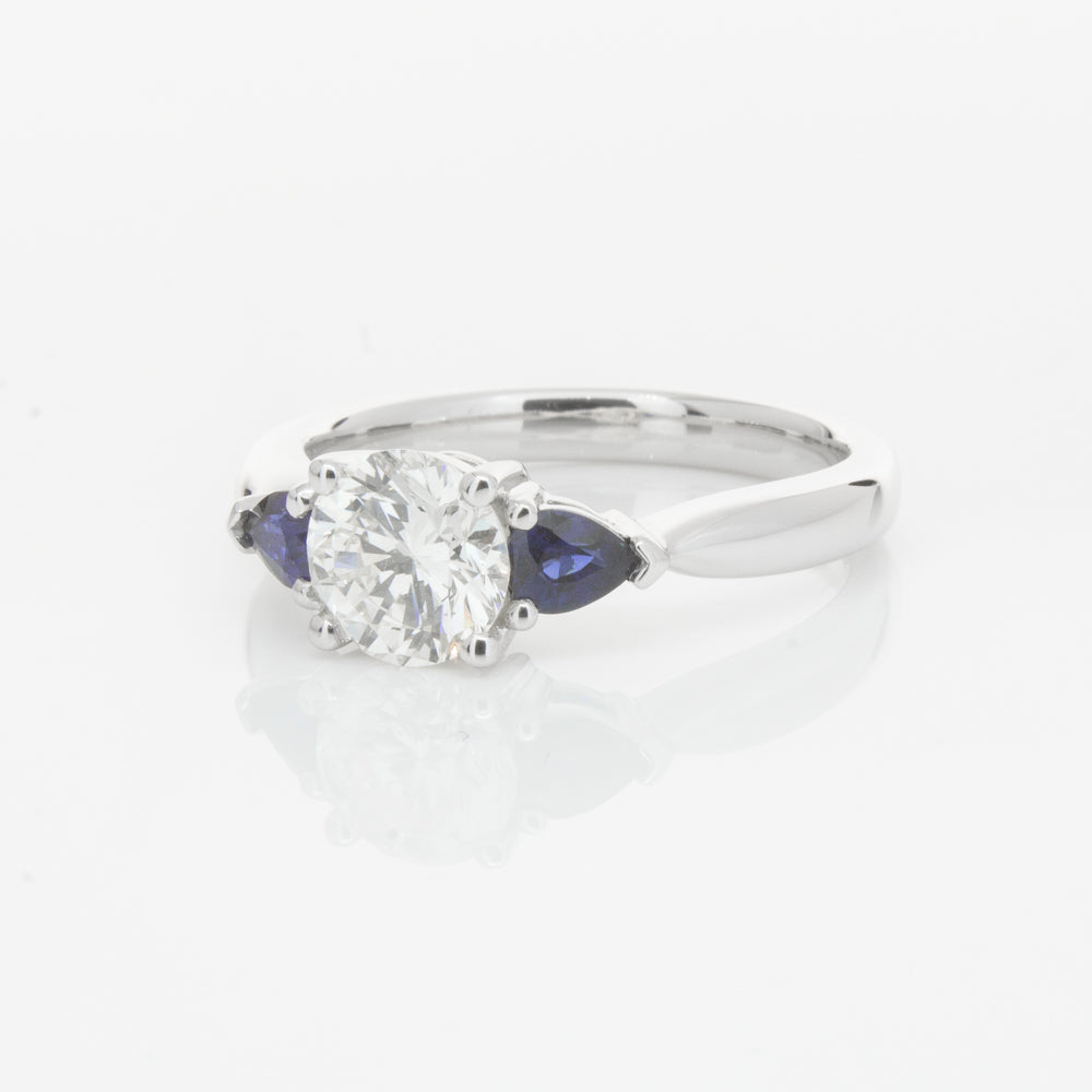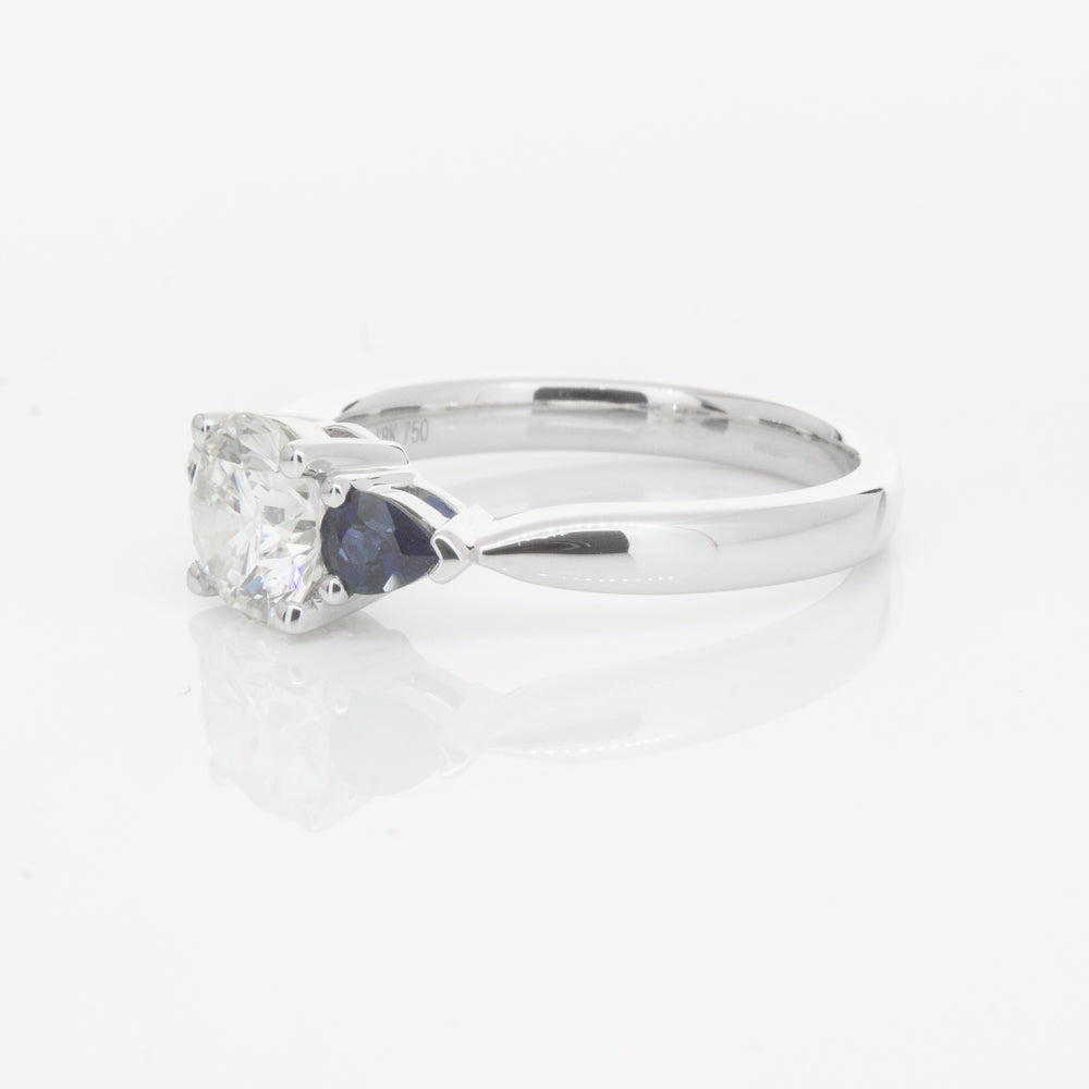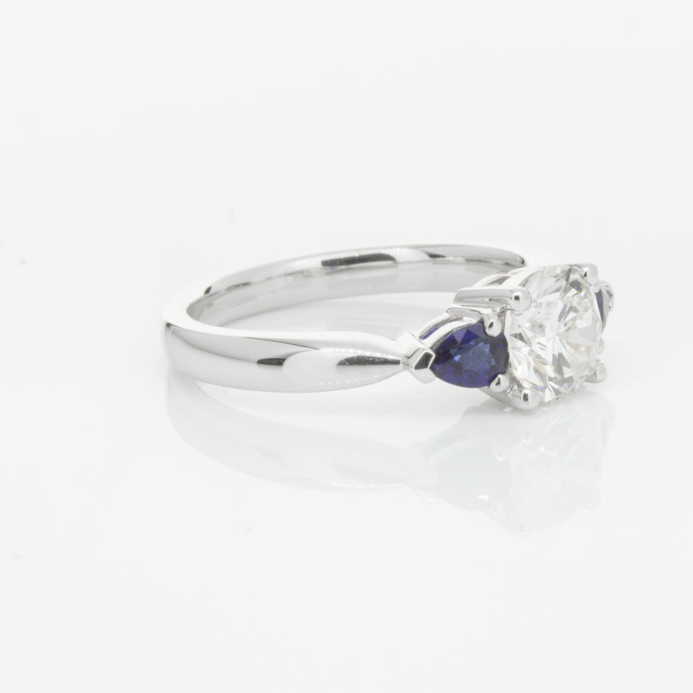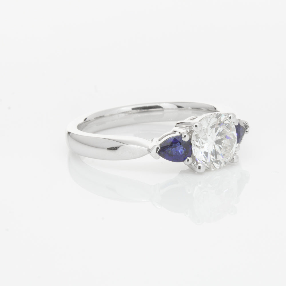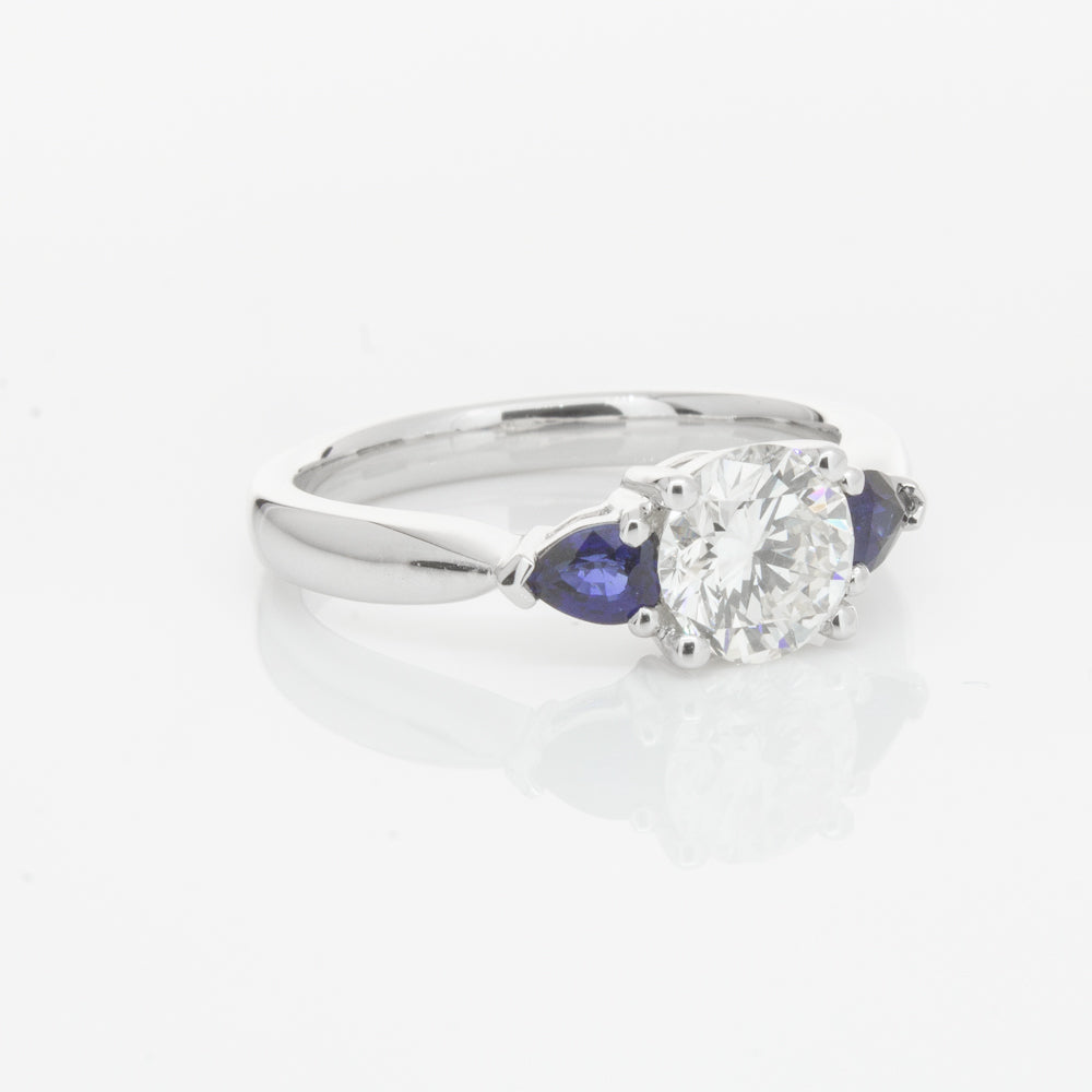 18ct white gold ring featuring one round brilliant cut diamond framed by two deep blue pear cut sapphires.