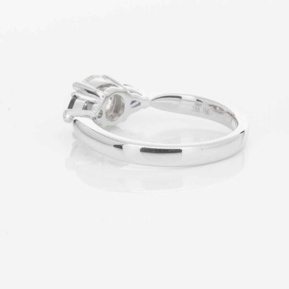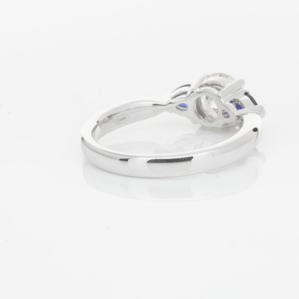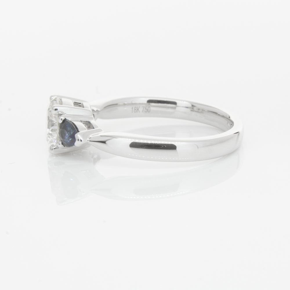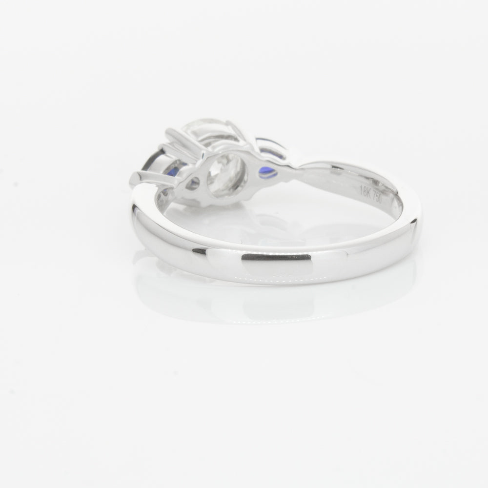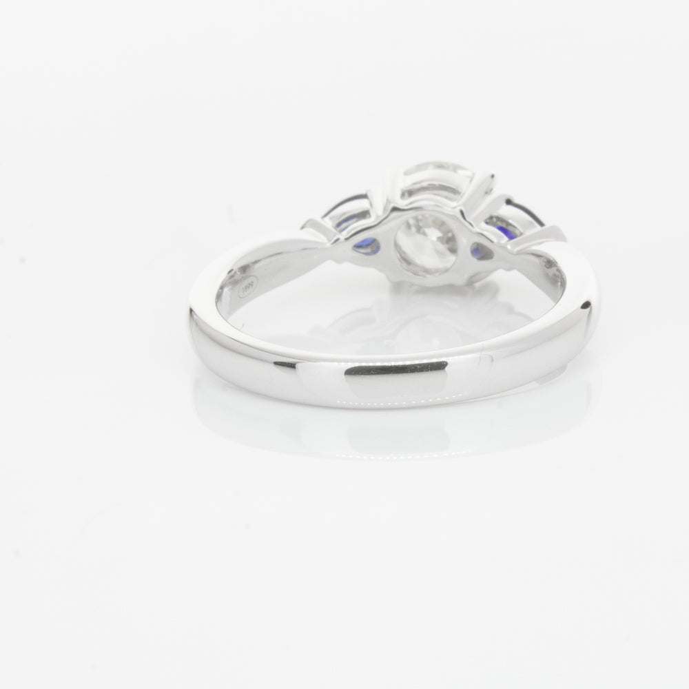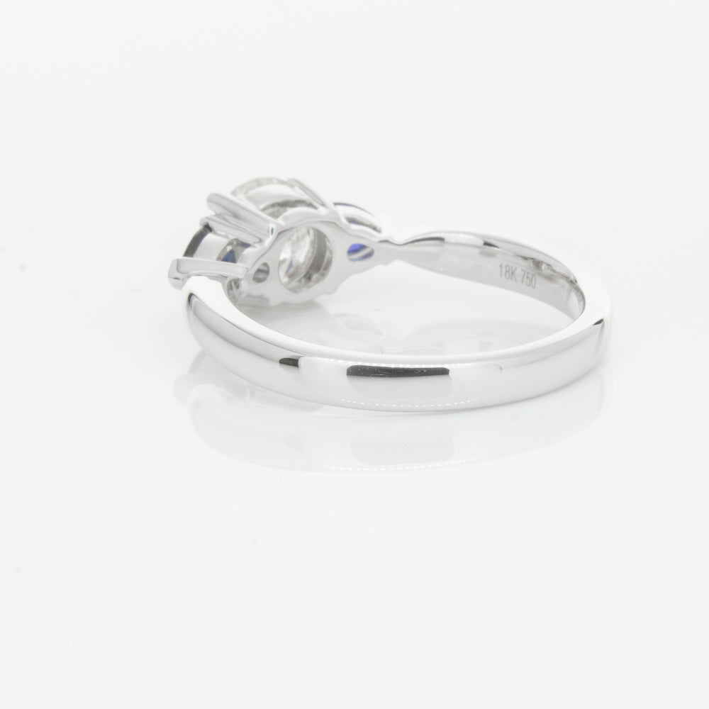 18ct white gold ring featuring one round brilliant cut diamond framed by two deep blue pear cut sapphires.