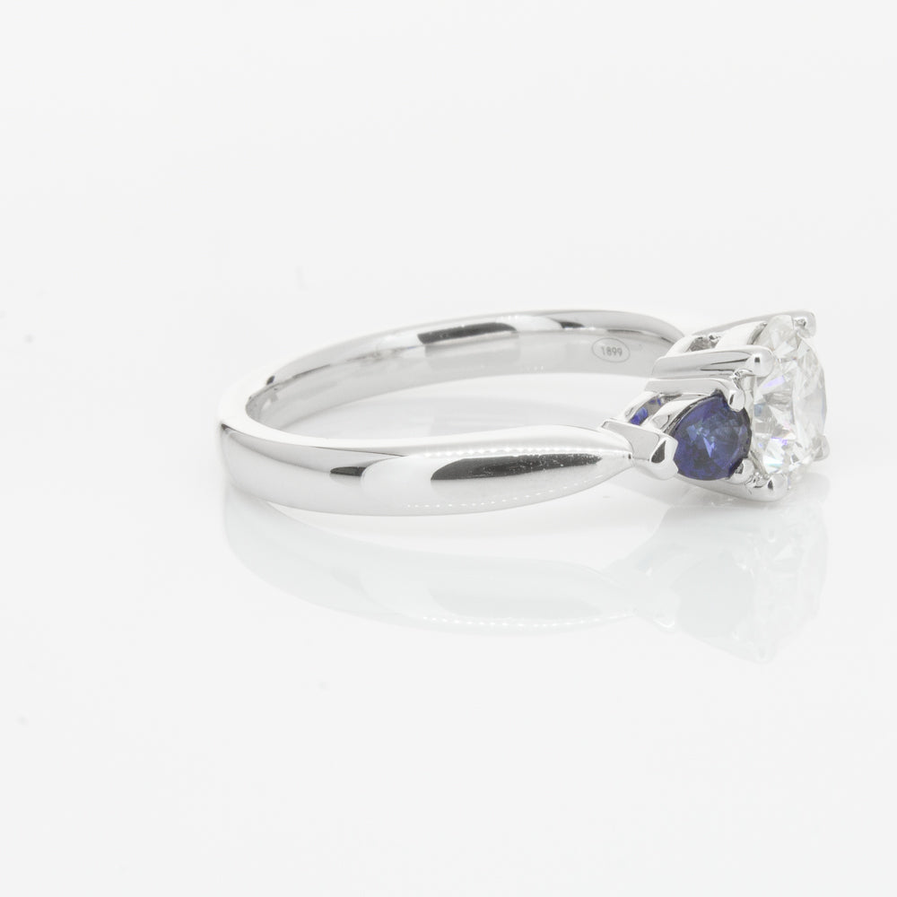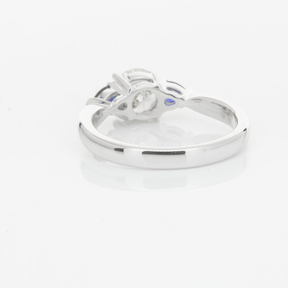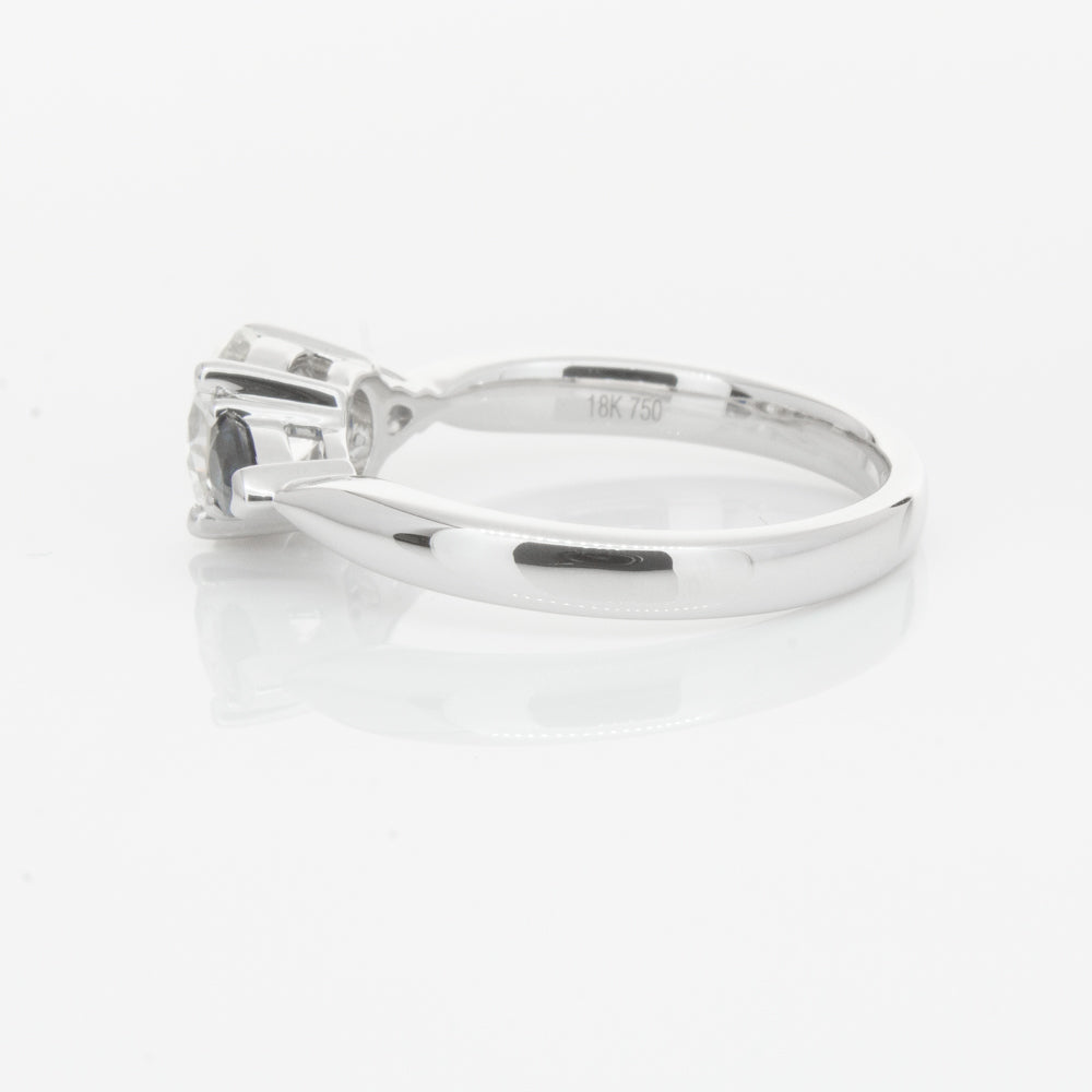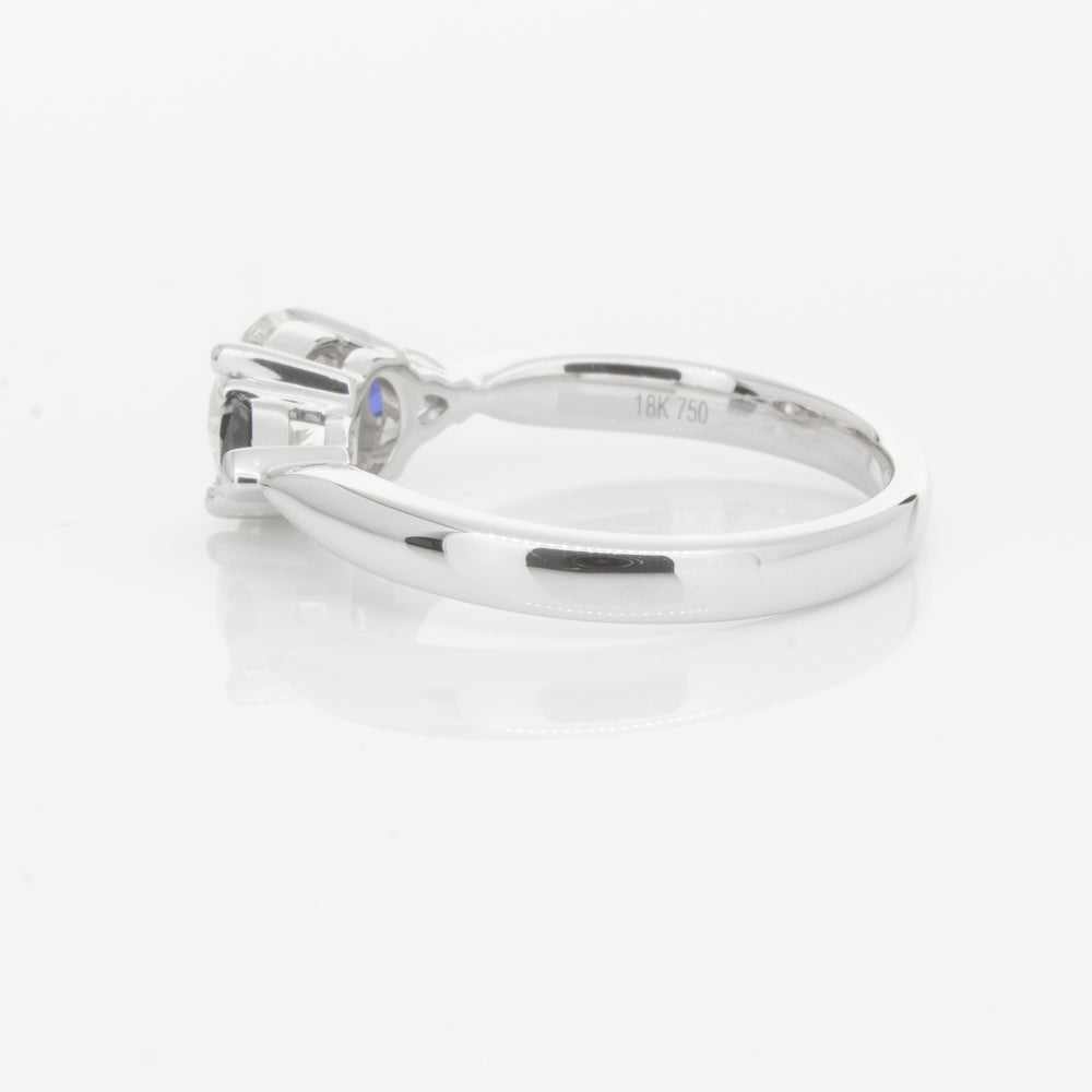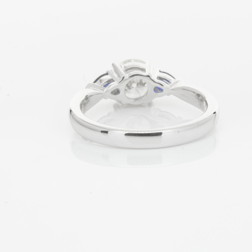 18ct white gold ring featuring one round brilliant cut diamond framed by two deep blue pear cut sapphires.
