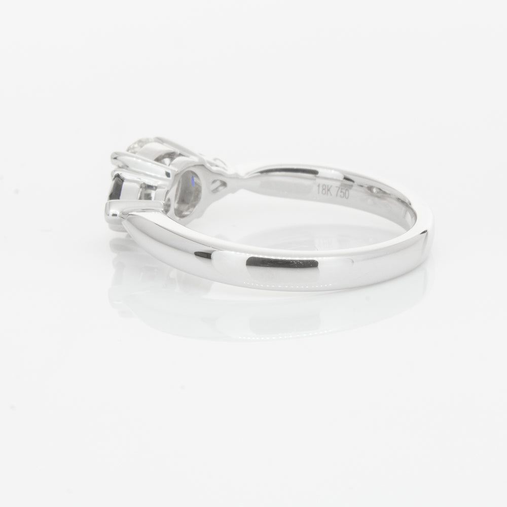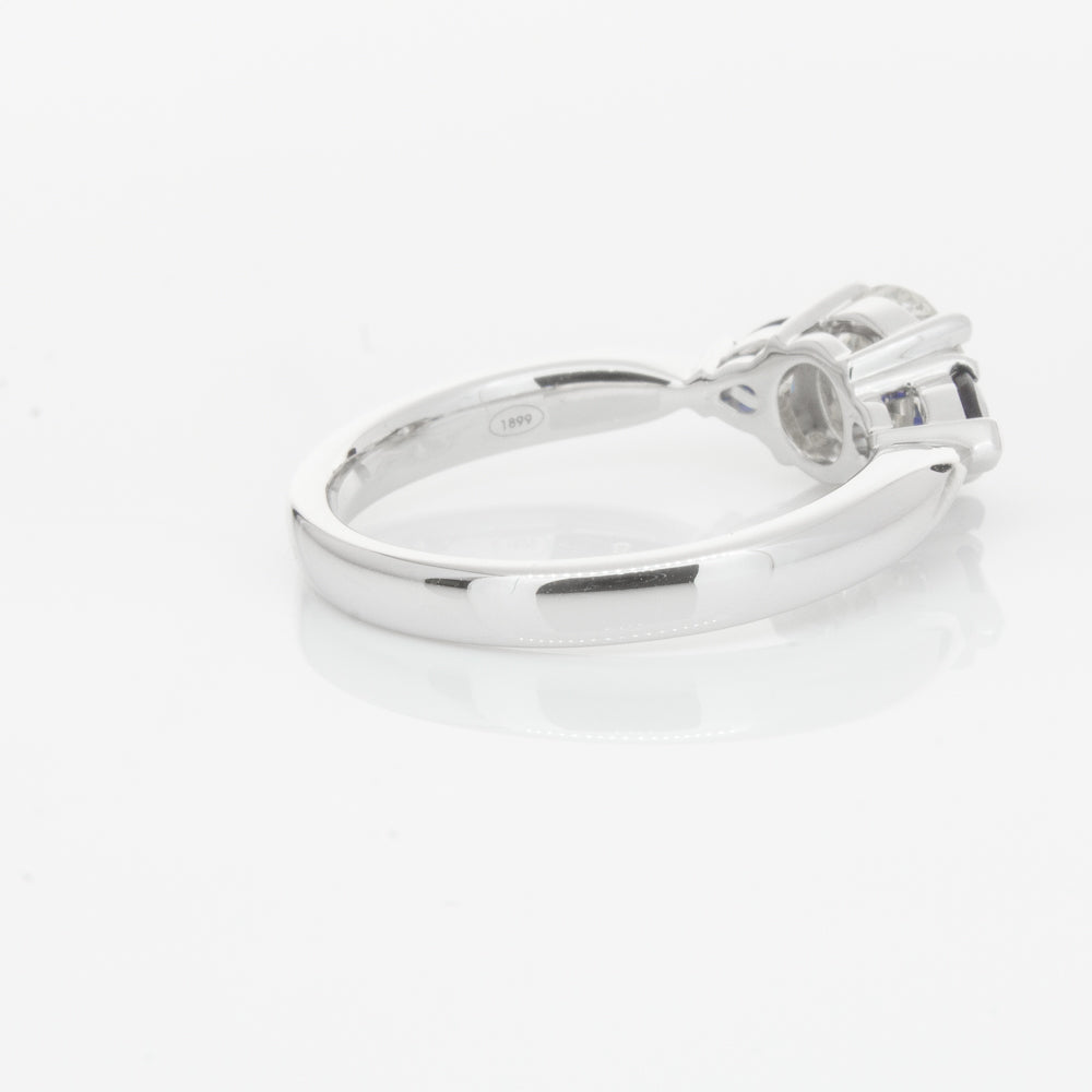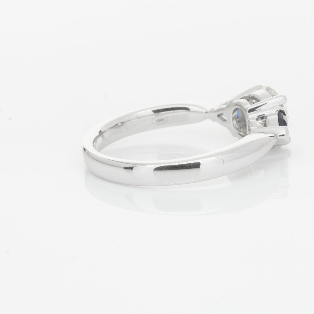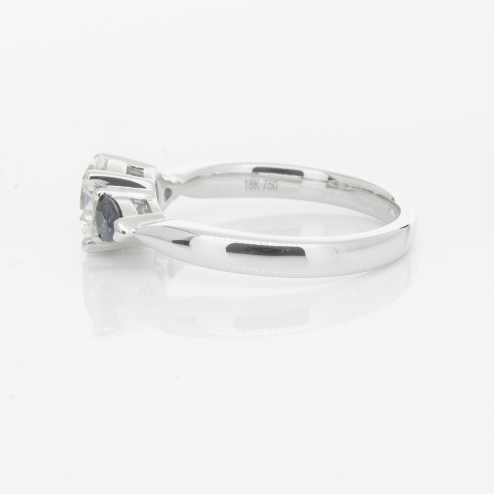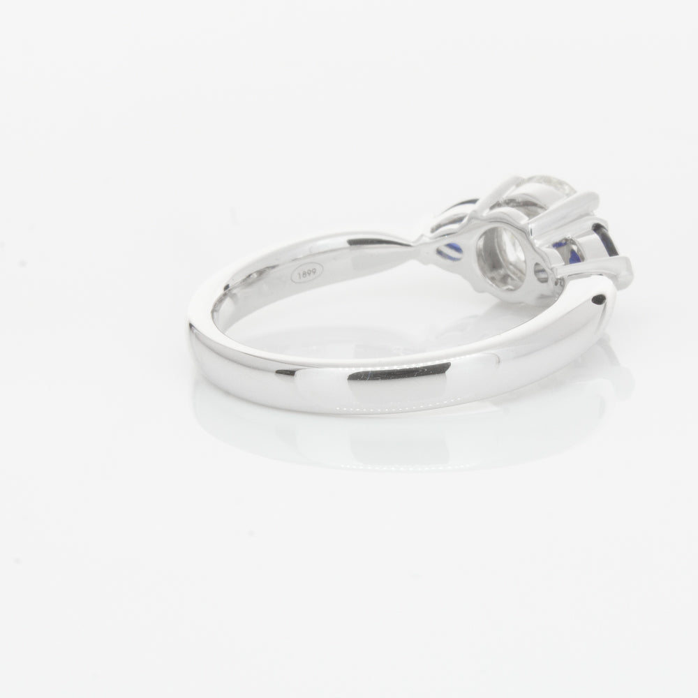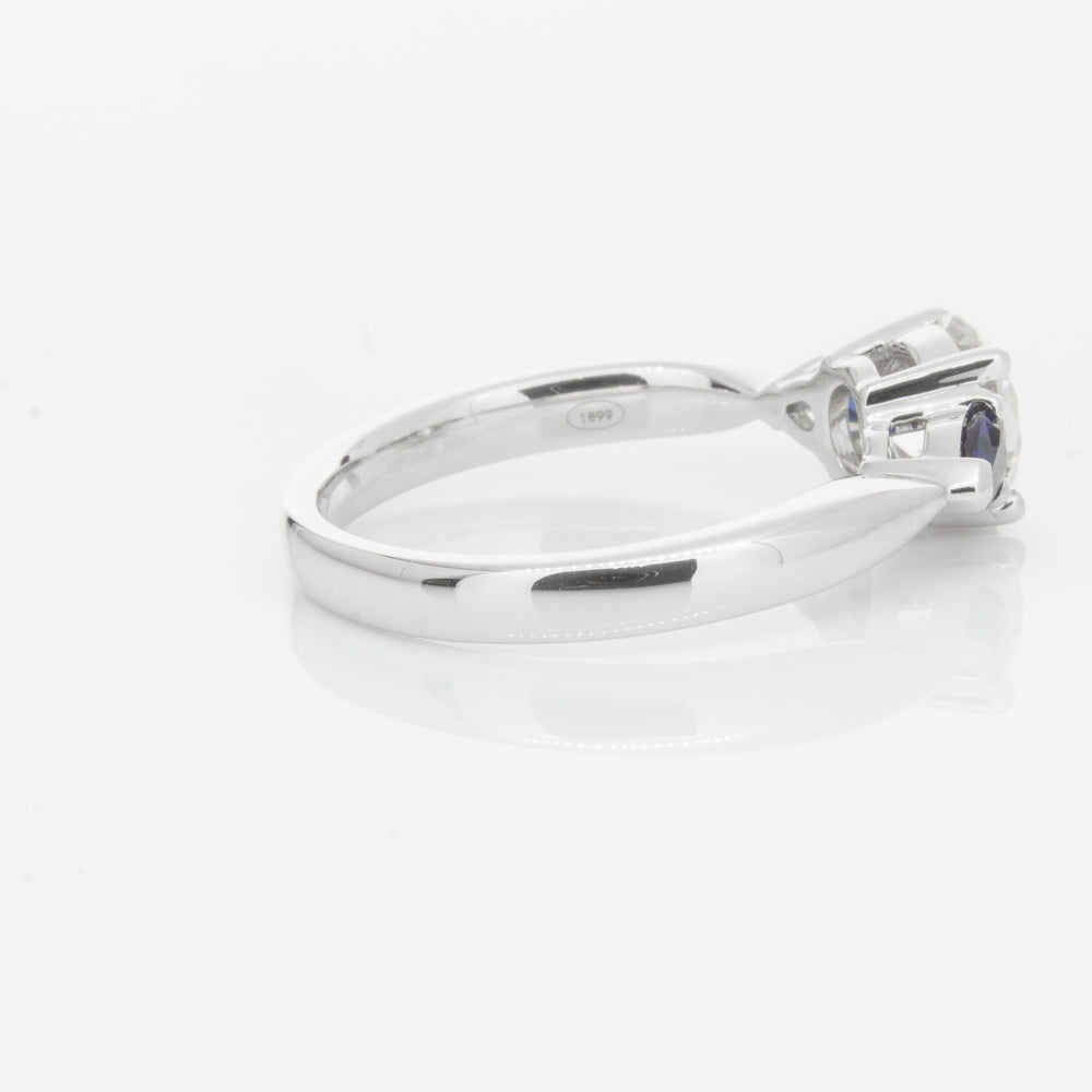 18ct white gold ring featuring one round brilliant cut diamond framed by two deep blue pear cut sapphires.