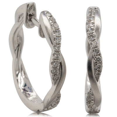18ct white gold hoop earrings feature thirty two round brilliant cut diamonds elegantly resting in a perfectly crafted twist.