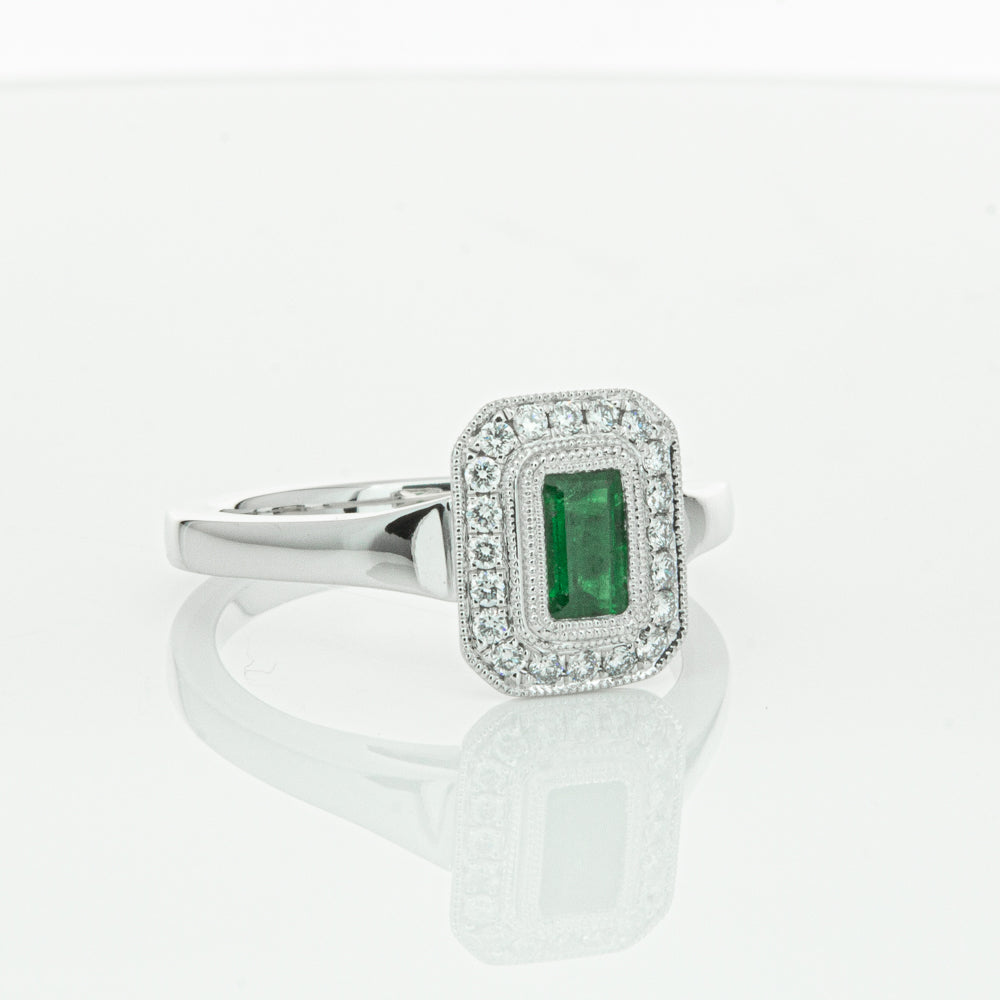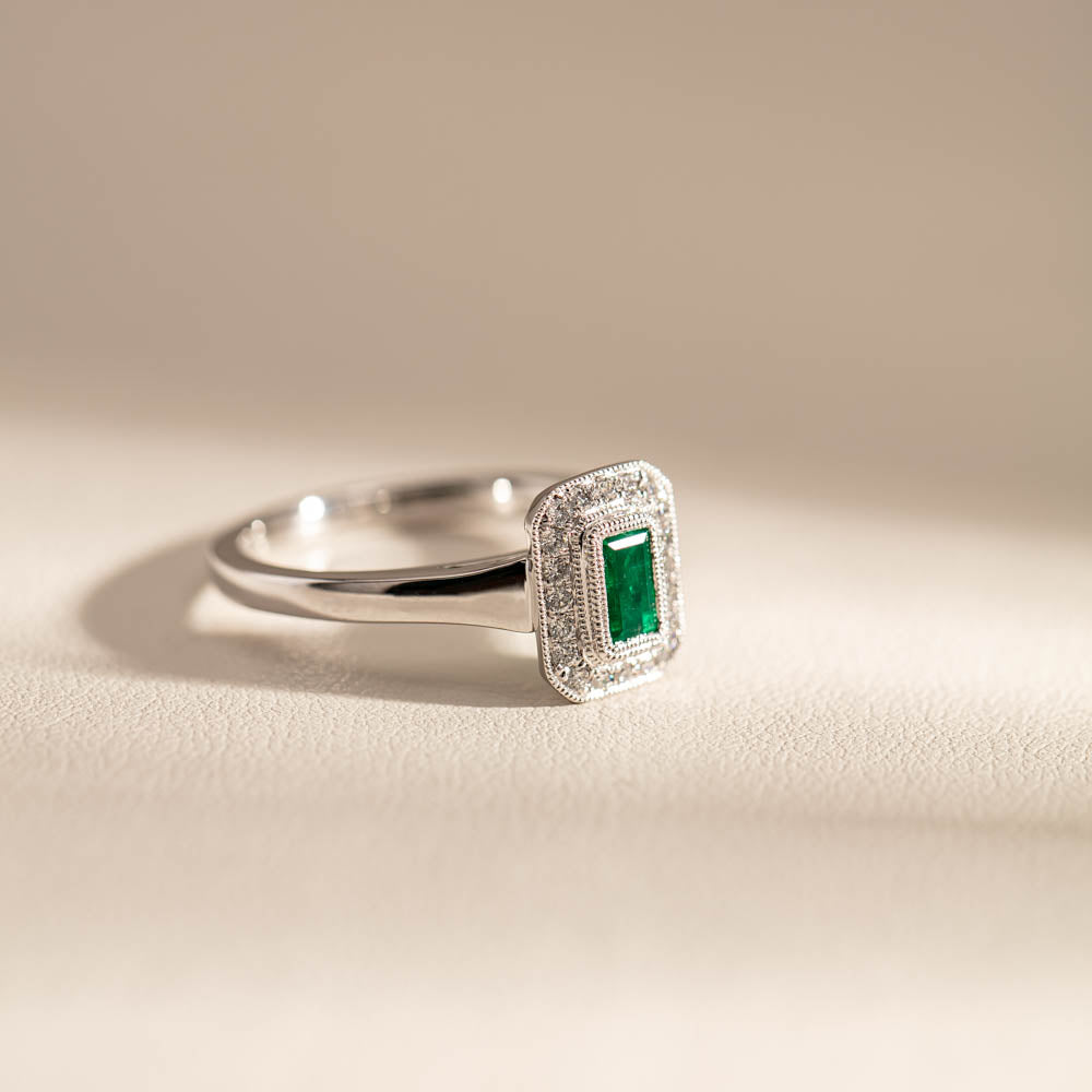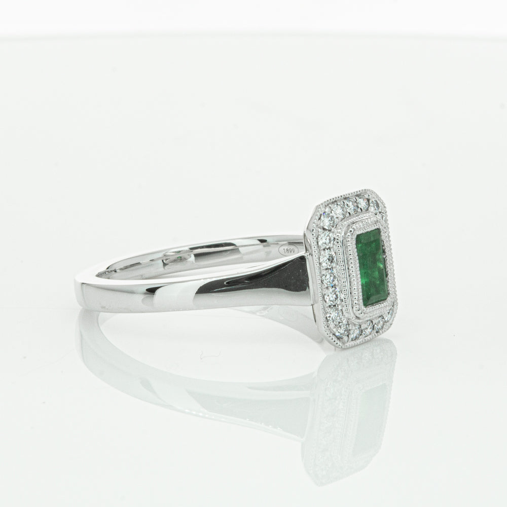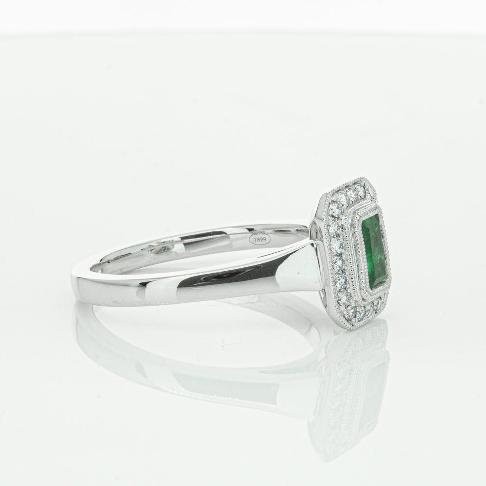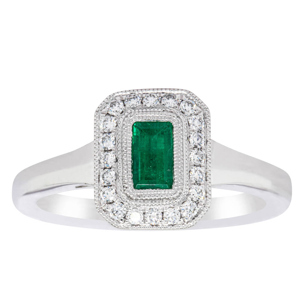 Crafted from luxurious high palladium 18ct white gold this stunning ring boasts a millgrain set emerald, which rests inside a diamond cluster. You will love showing off this vibrant piece.