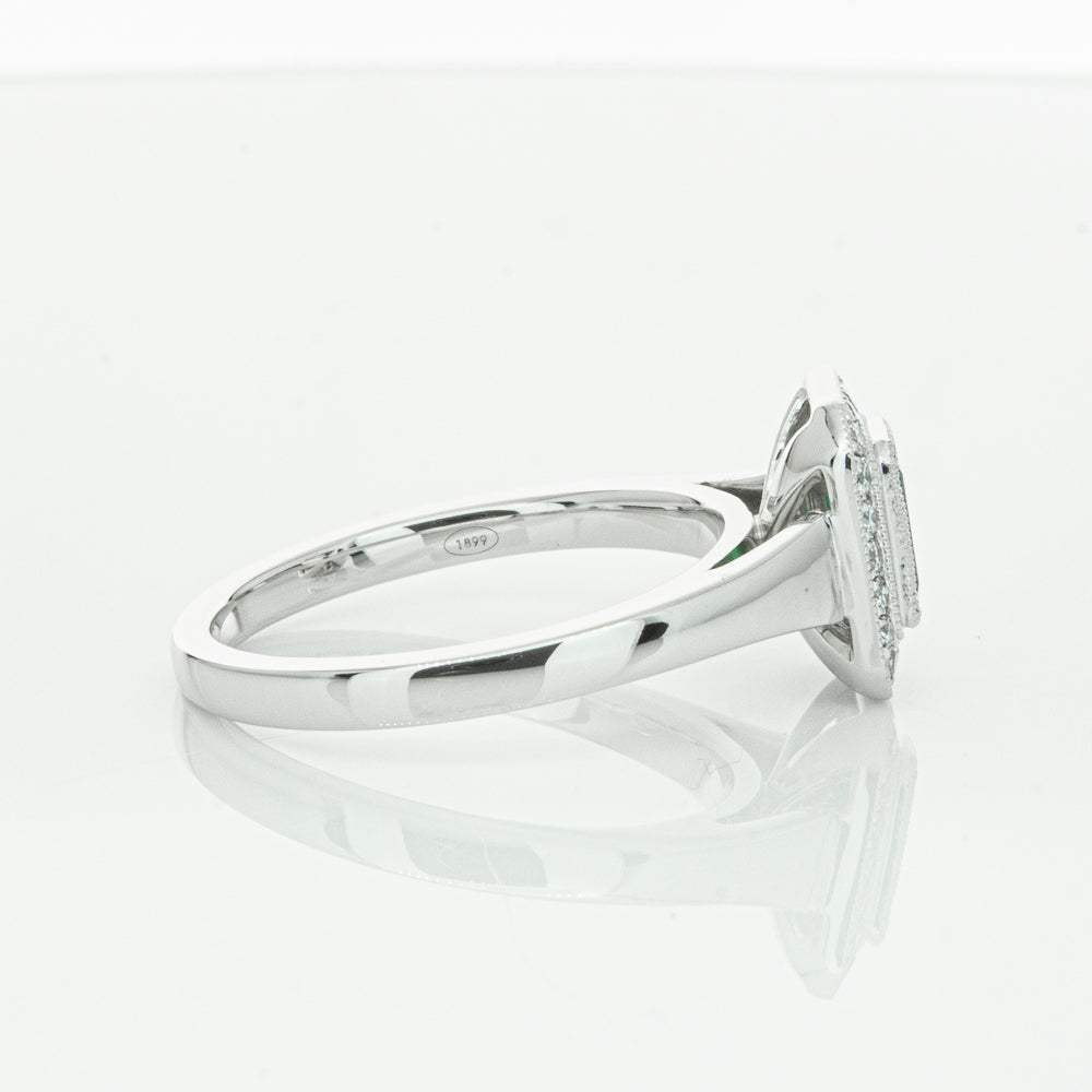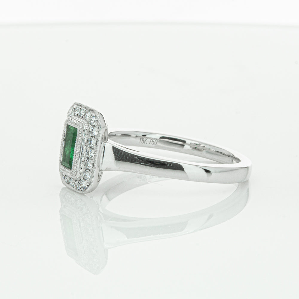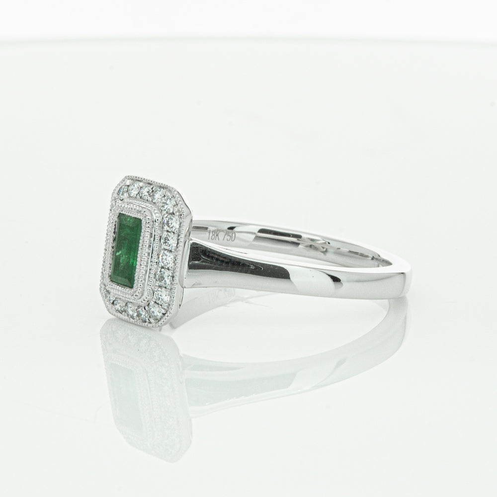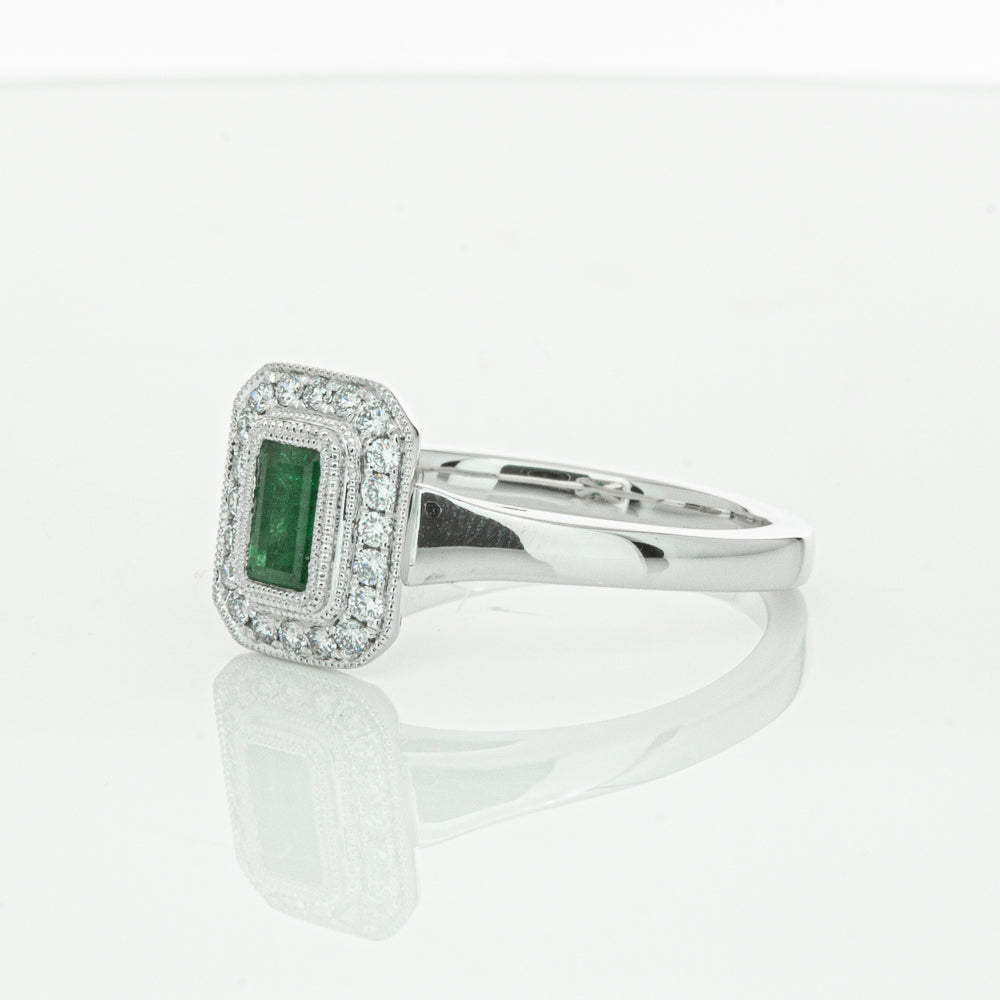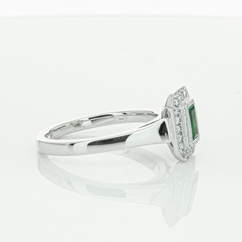 Crafted from luxurious high palladium 18ct white gold this stunning ring boasts a millgrain set emerald, which rests inside a diamond cluster. You will love showing off this vibrant piece.