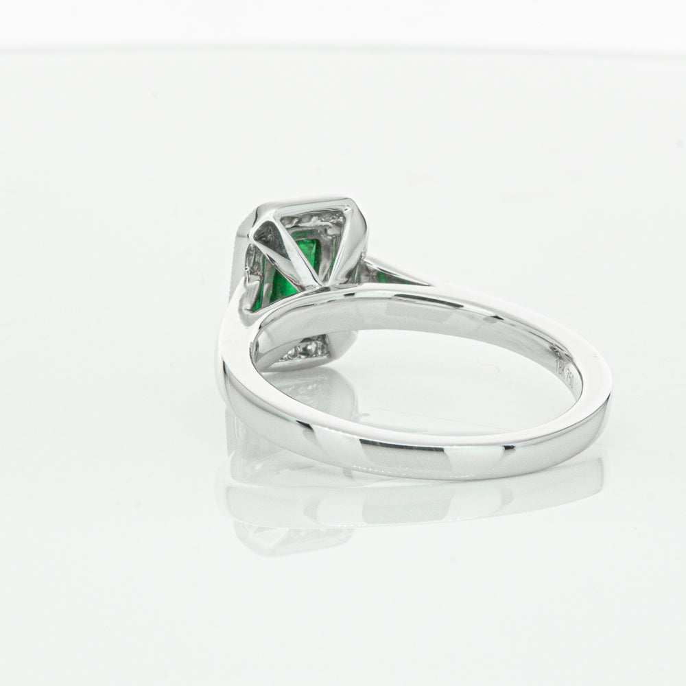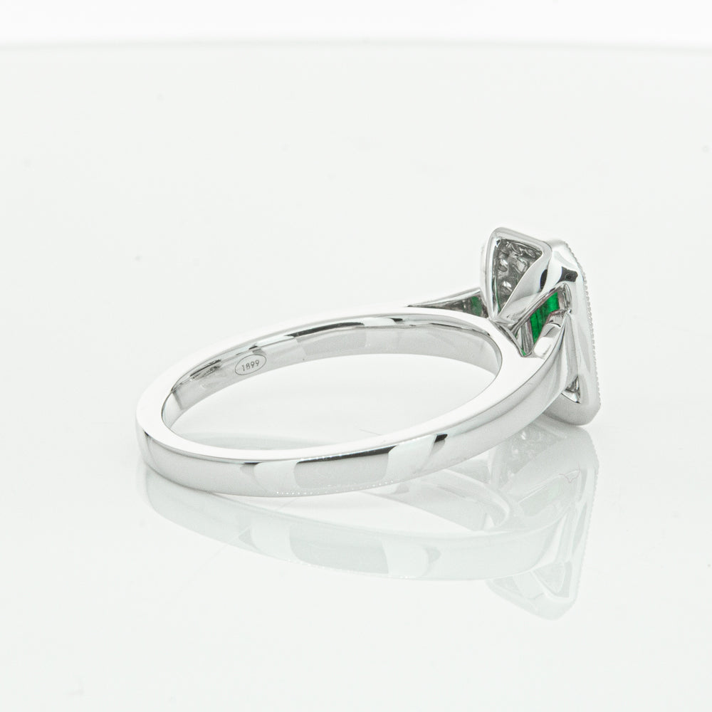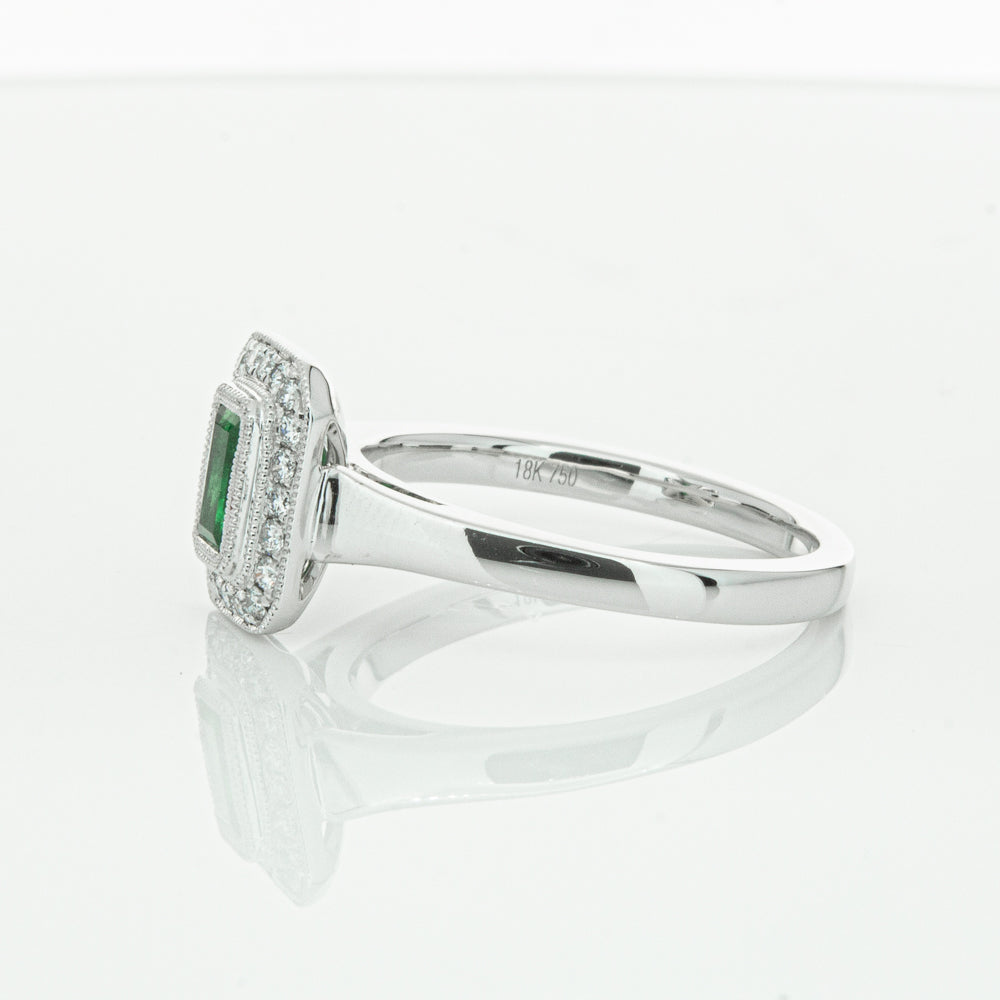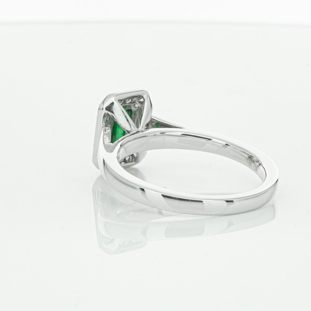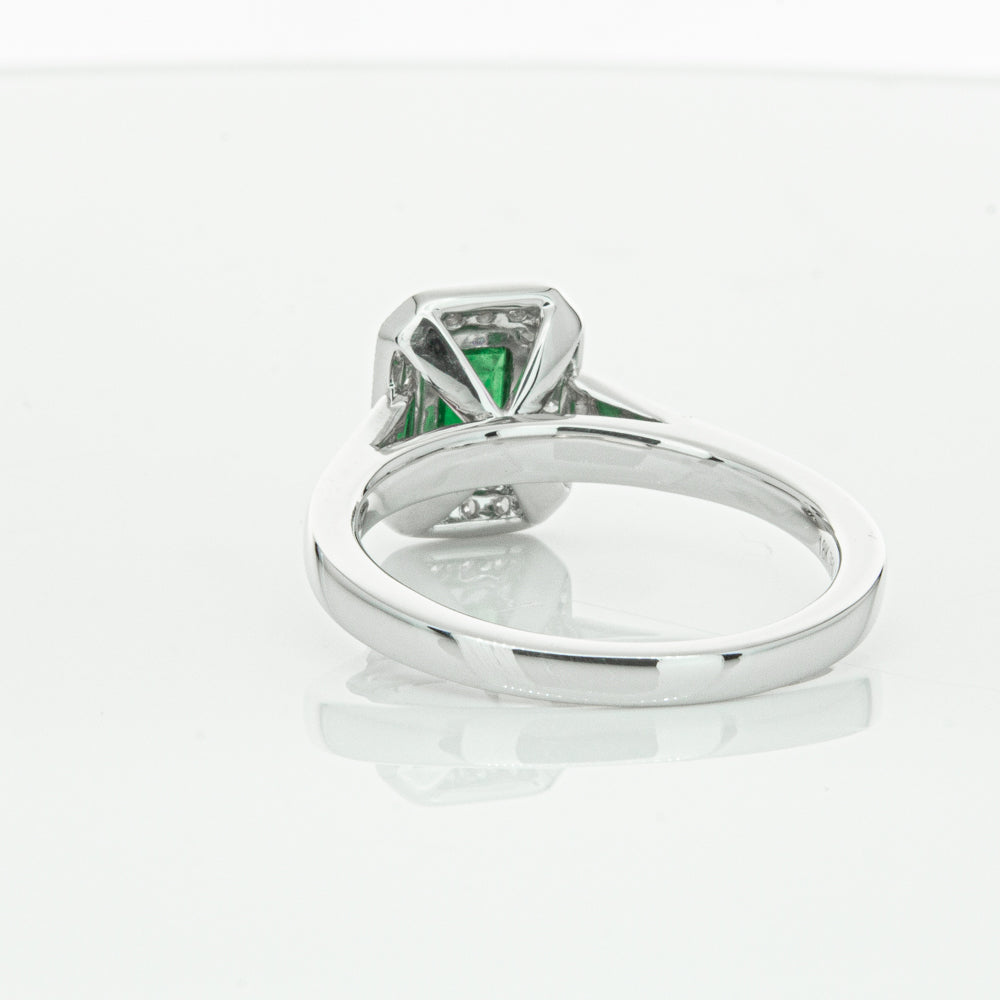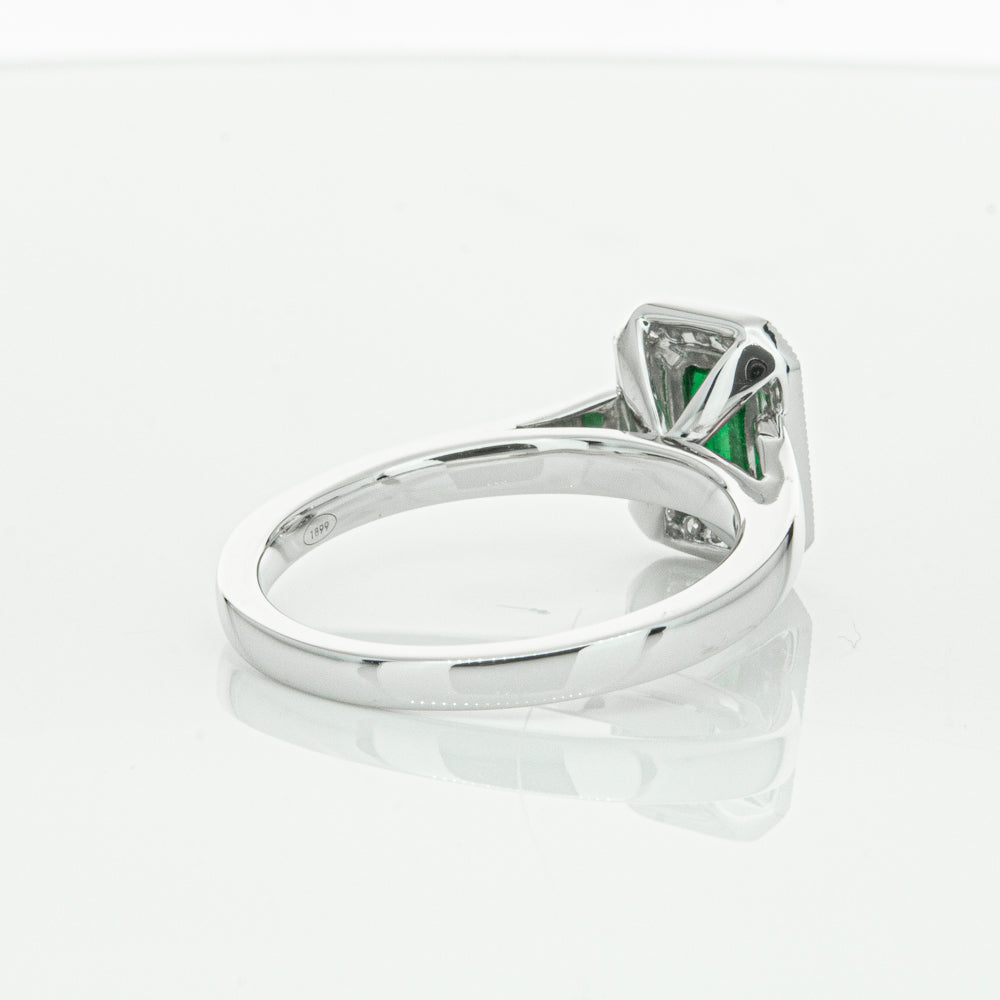 Crafted from luxurious high palladium 18ct white gold this stunning ring boasts a millgrain set emerald, which rests inside a diamond cluster. You will love showing off this vibrant piece.
