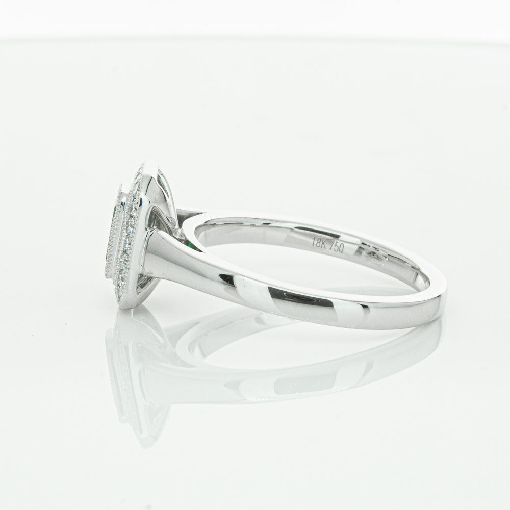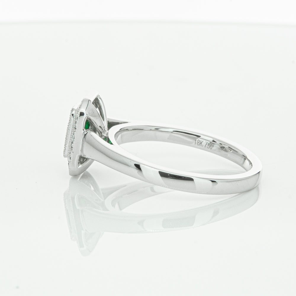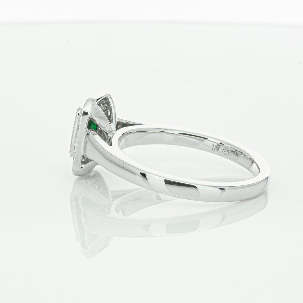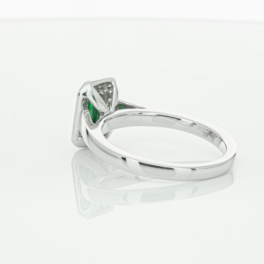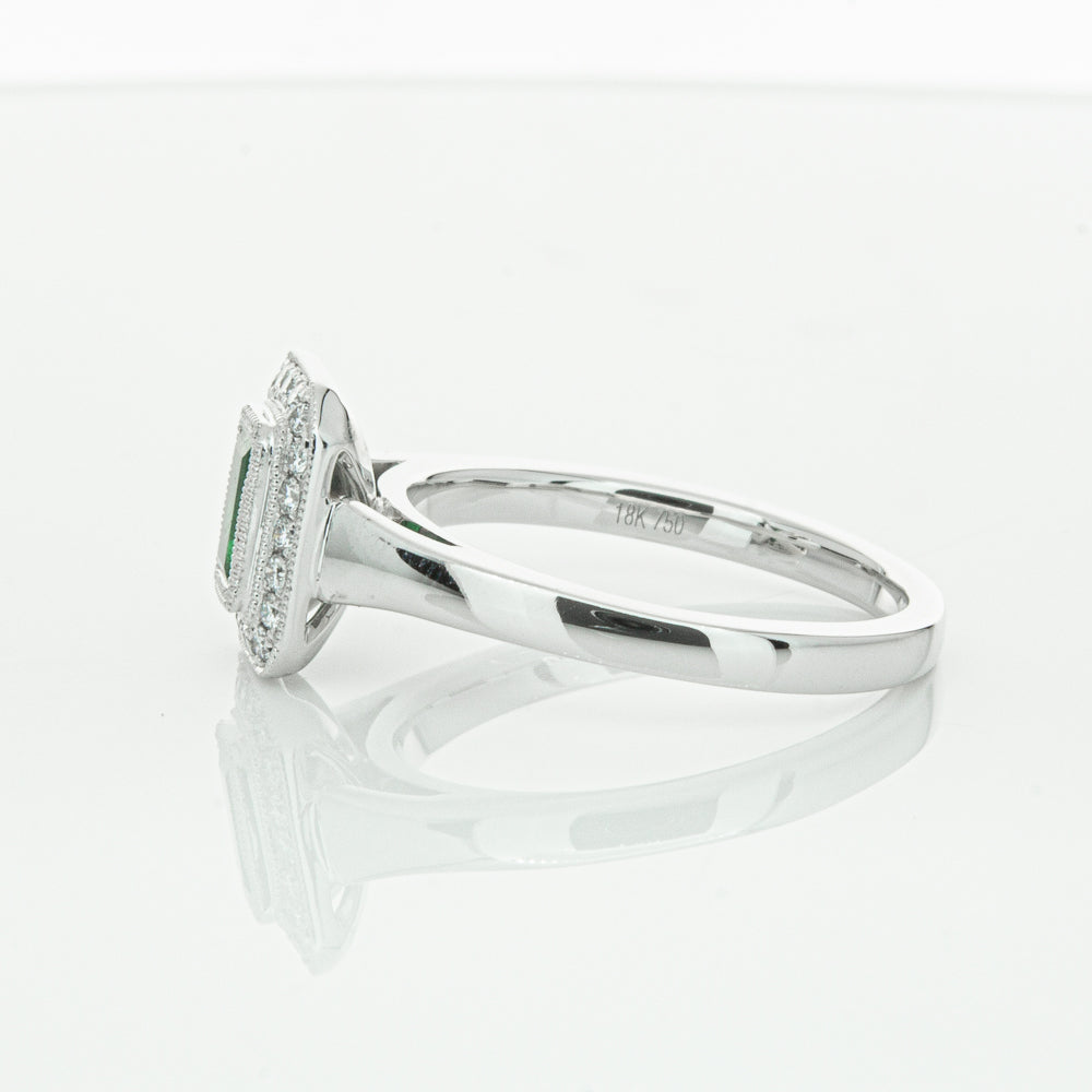 Crafted from luxurious high palladium 18ct white gold this stunning ring boasts a millgrain set emerald, which rests inside a diamond cluster. You will love showing off this vibrant piece.