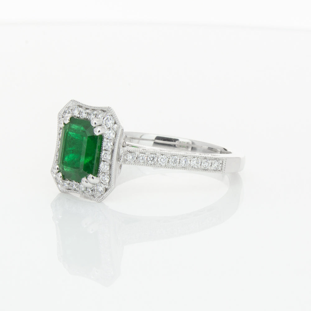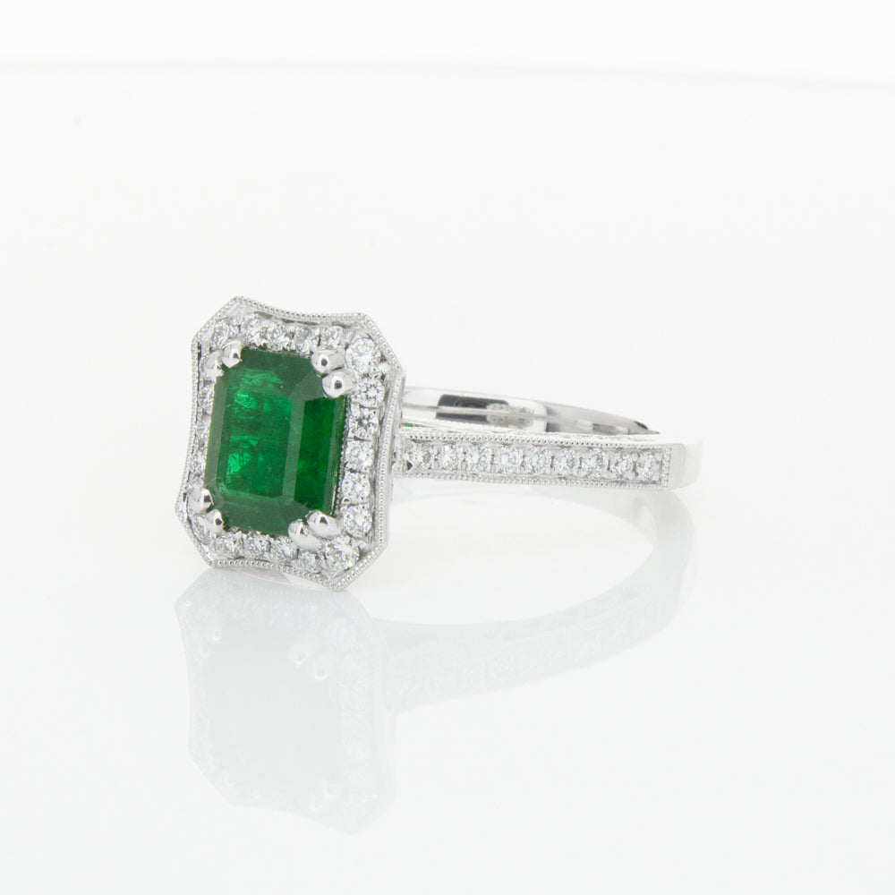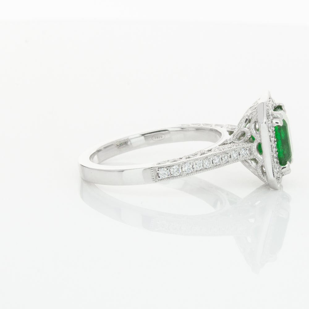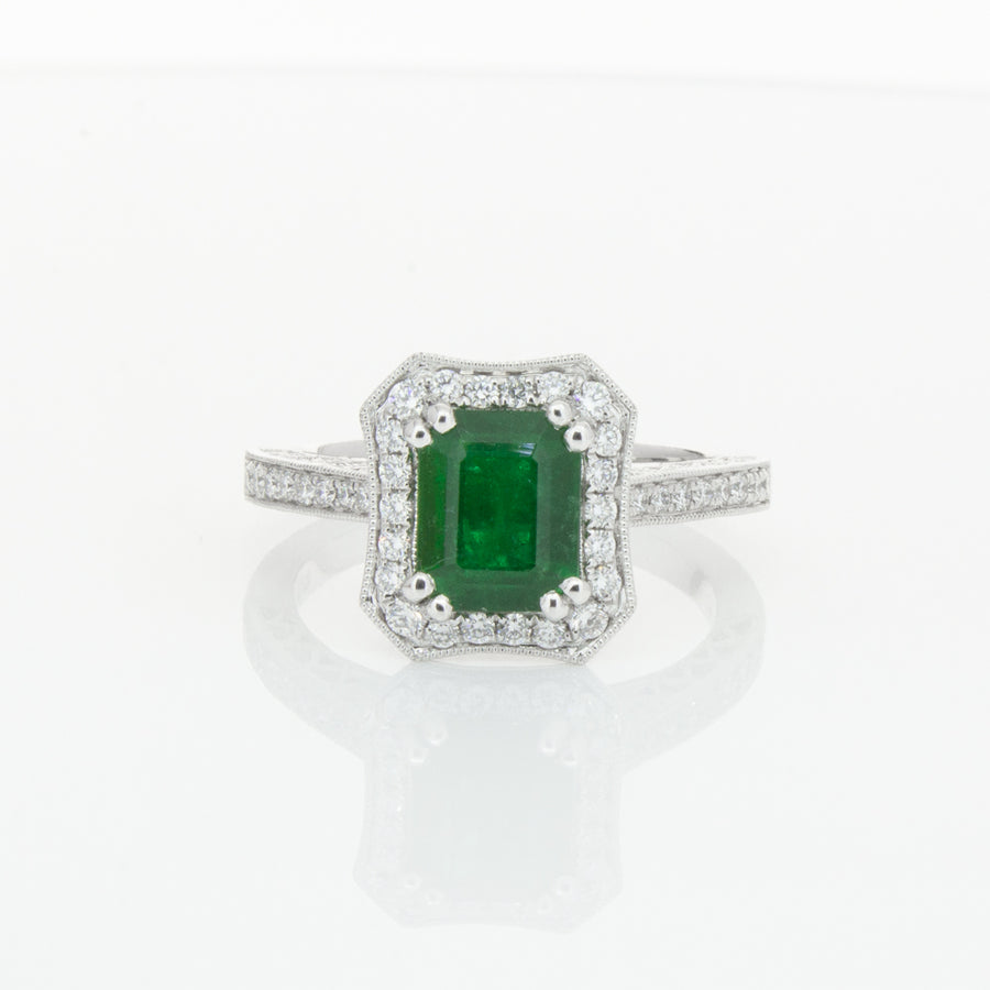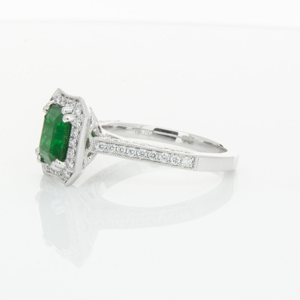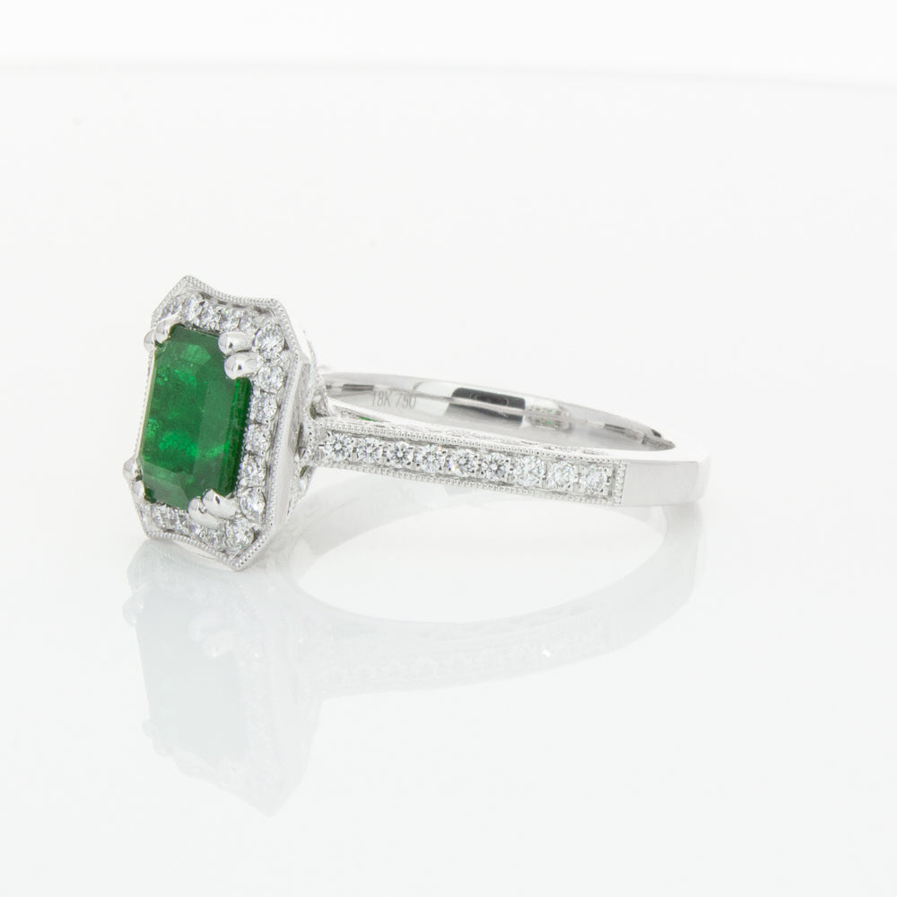 18ct white gold ring featuring a rectangular cut emerald framed by a halo of dazzling white diamonds, resting on diamond set shoulders.
