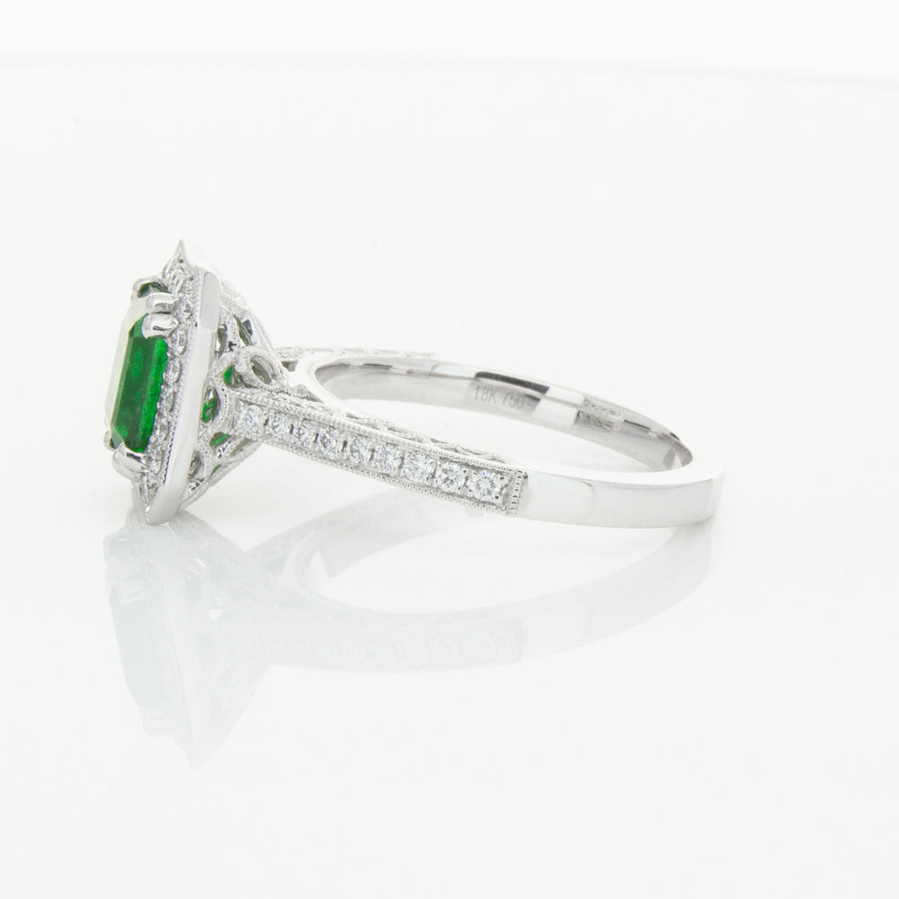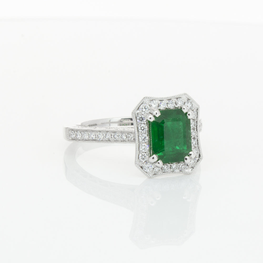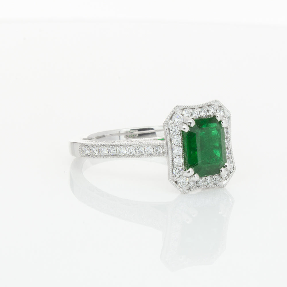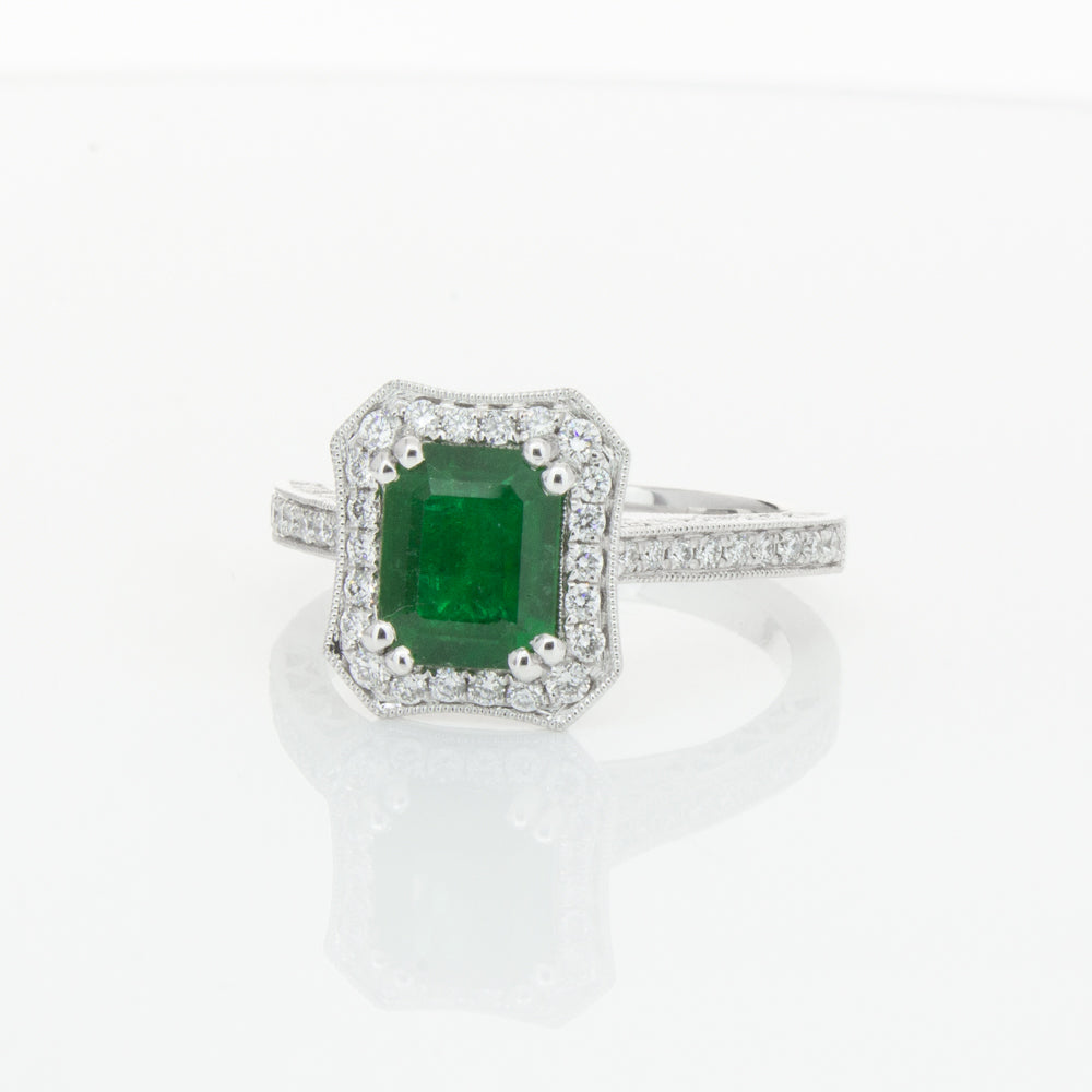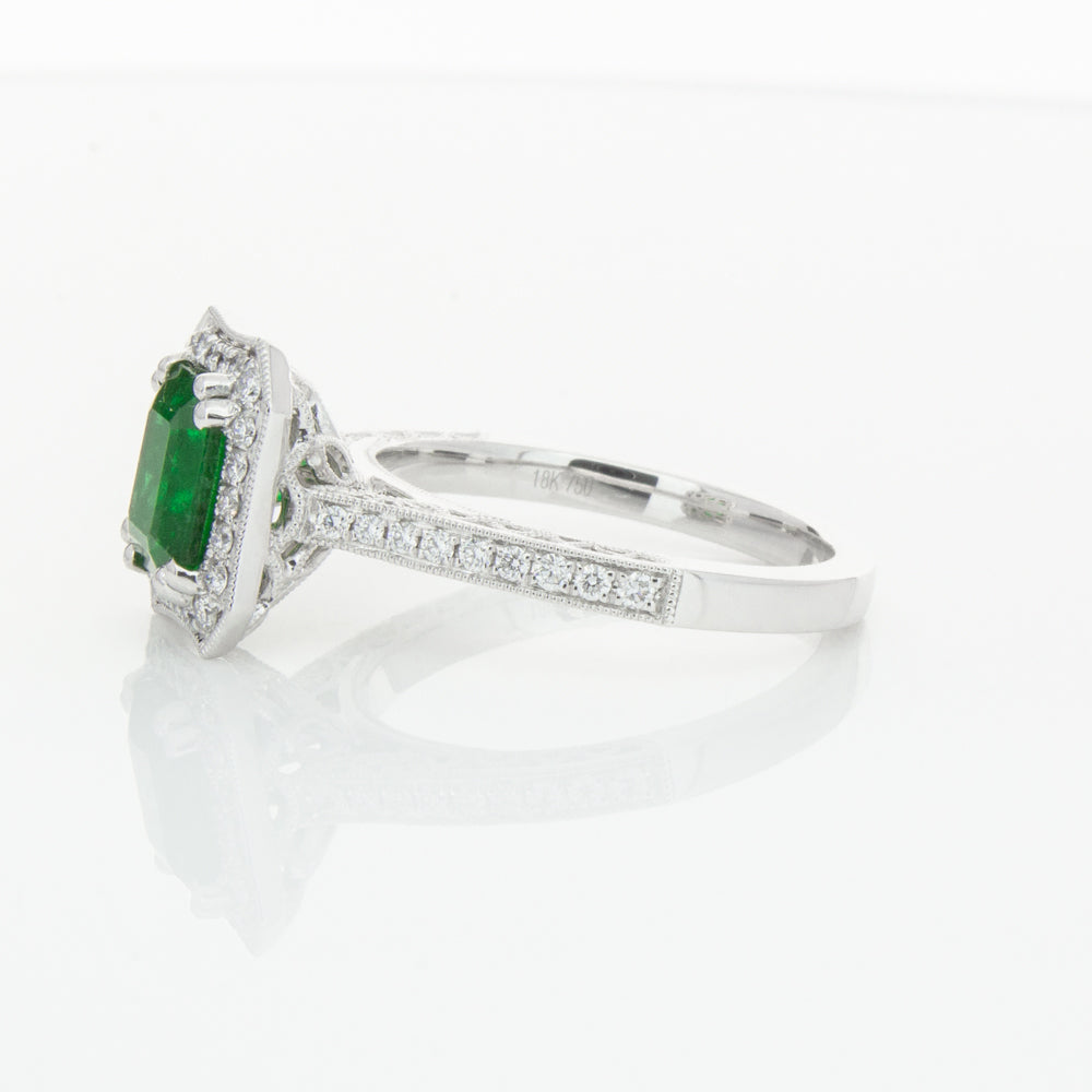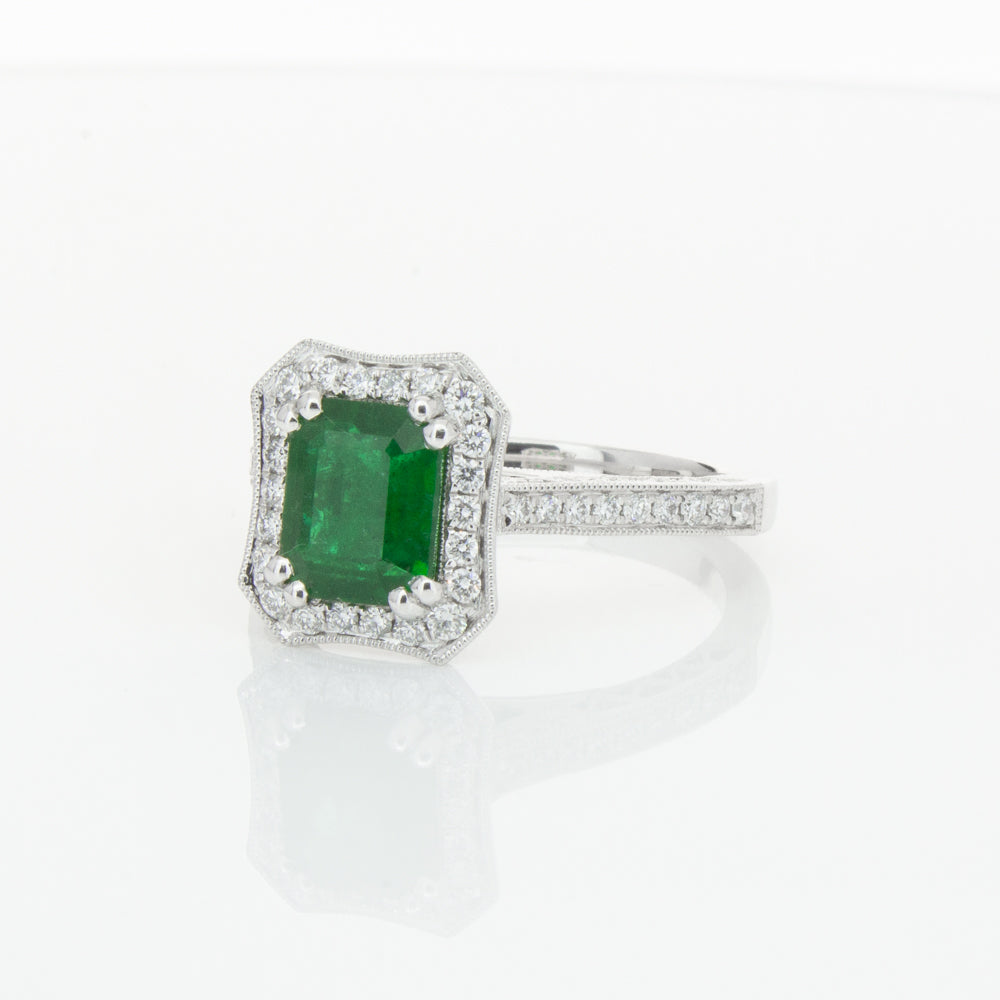 18ct white gold ring featuring a rectangular cut emerald framed by a halo of dazzling white diamonds, resting on diamond set shoulders.