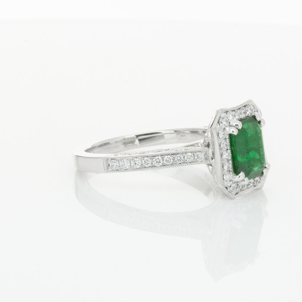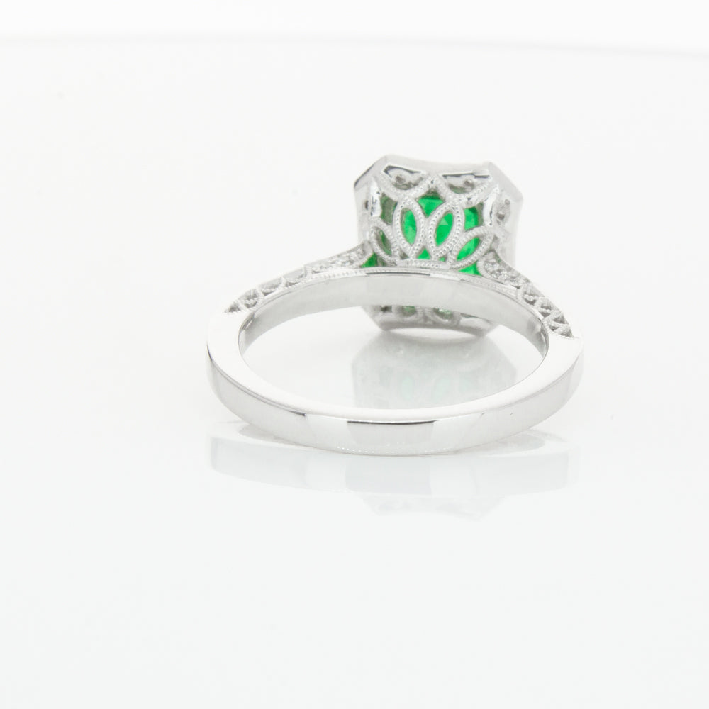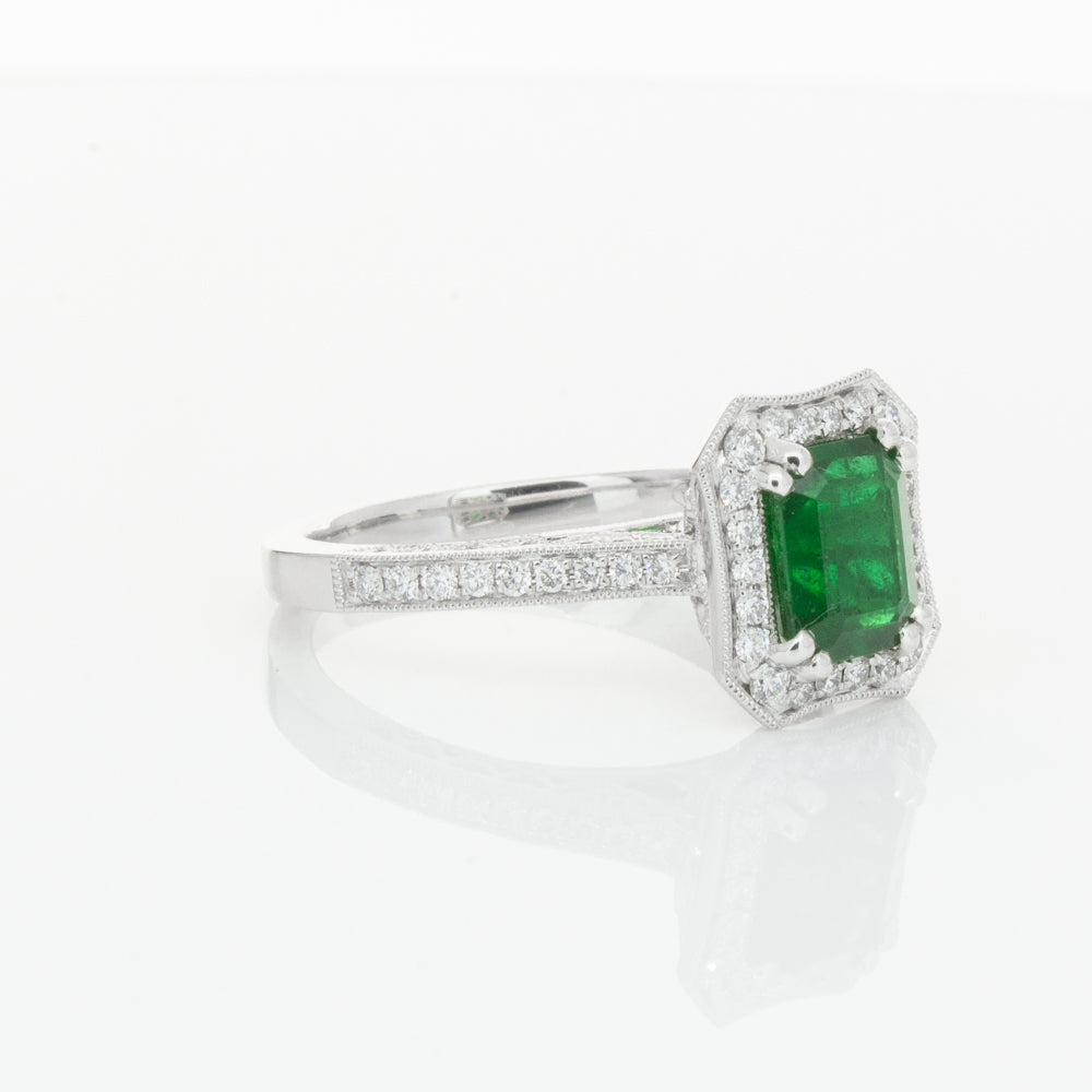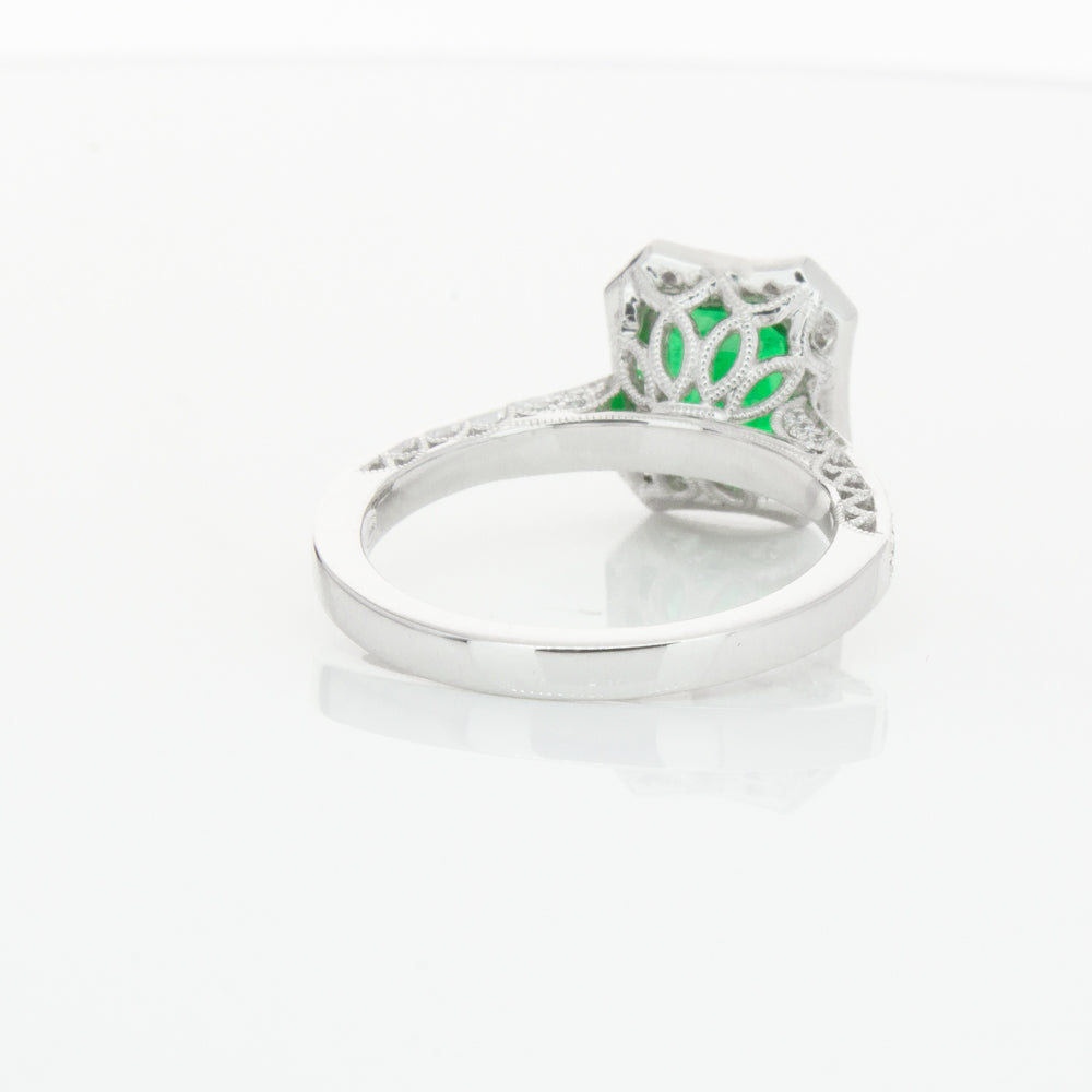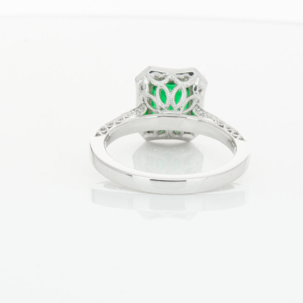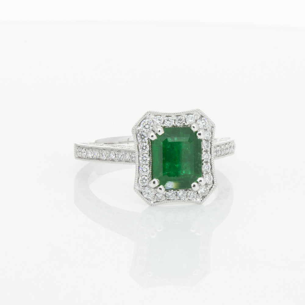 18ct white gold ring featuring a rectangular cut emerald framed by a halo of dazzling white diamonds, resting on diamond set shoulders.