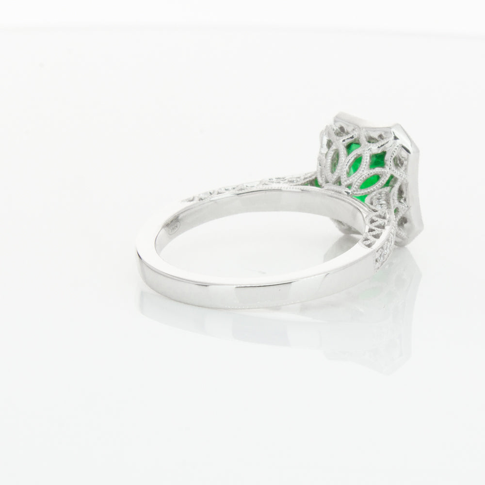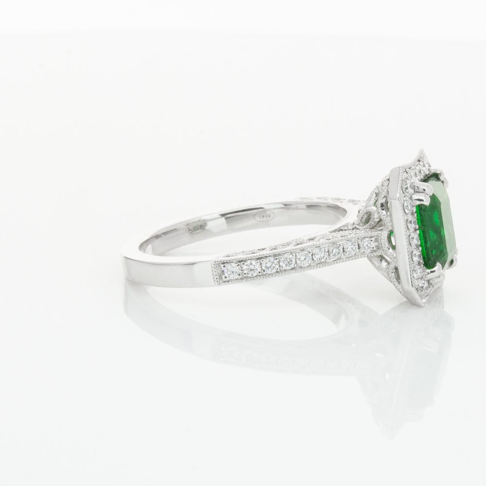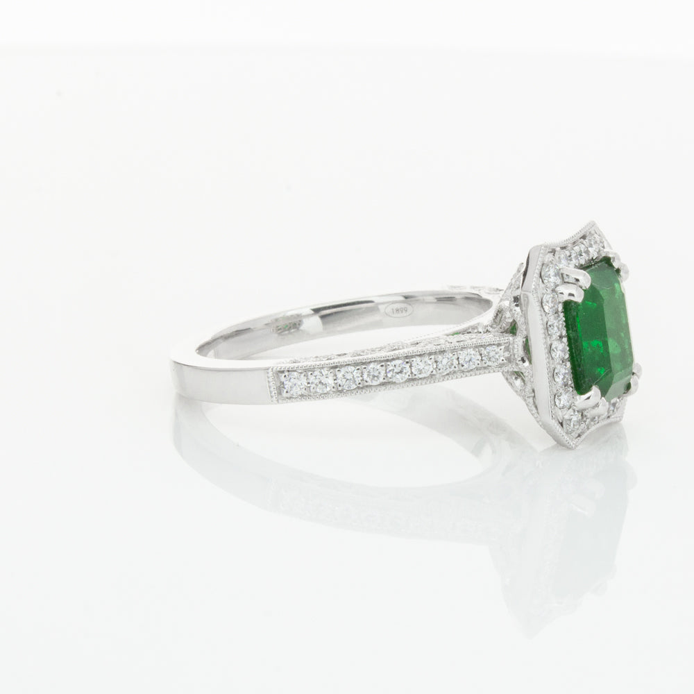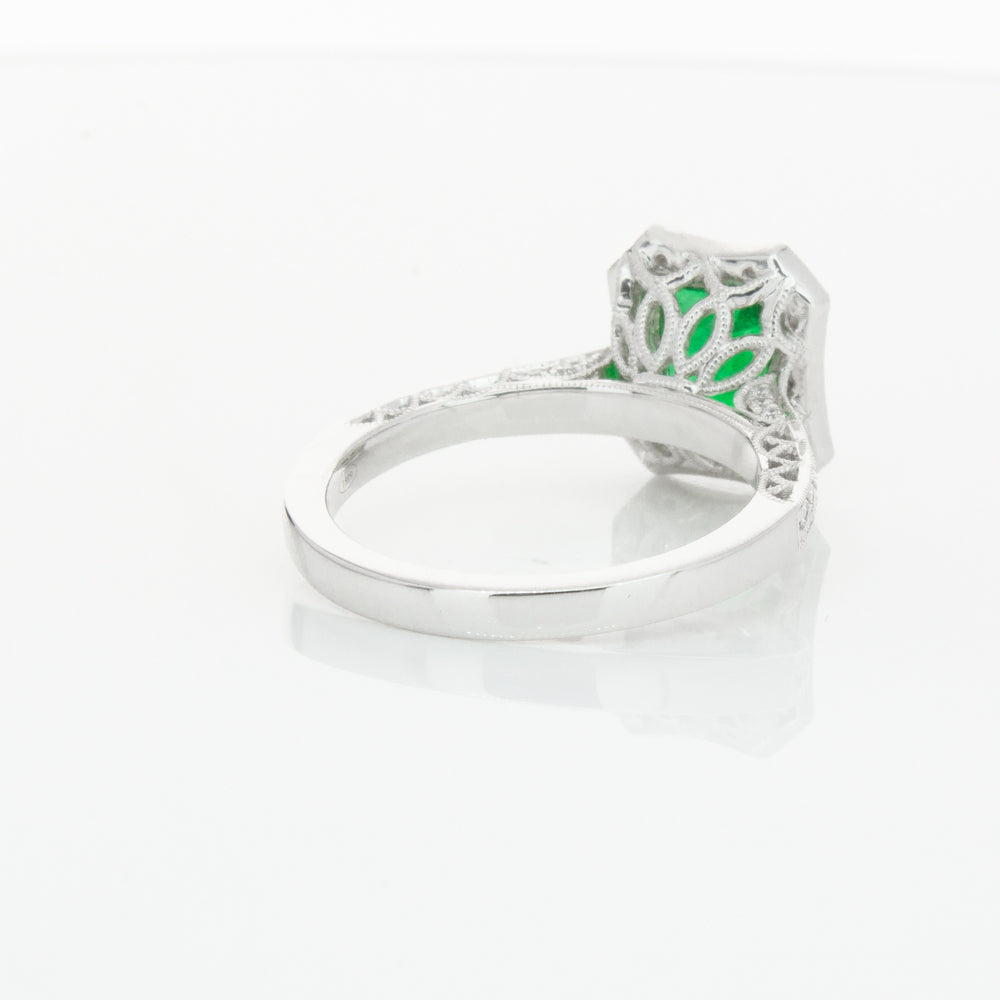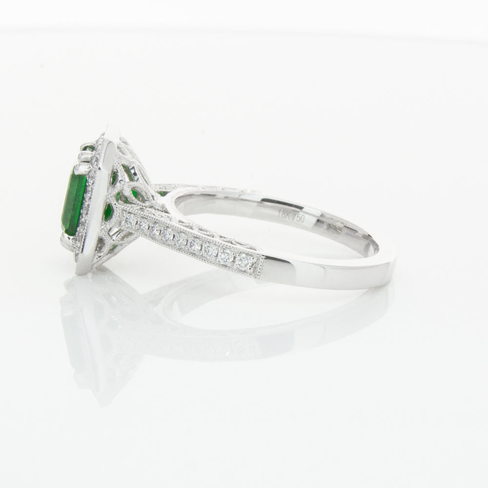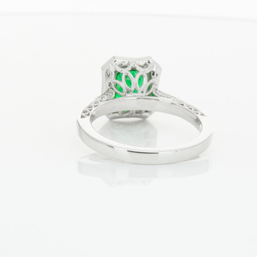 18ct white gold ring featuring a rectangular cut emerald framed by a halo of dazzling white diamonds, resting on diamond set shoulders.