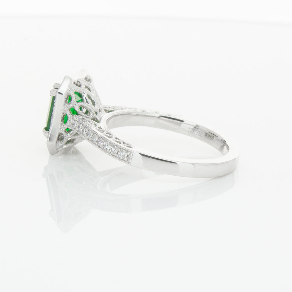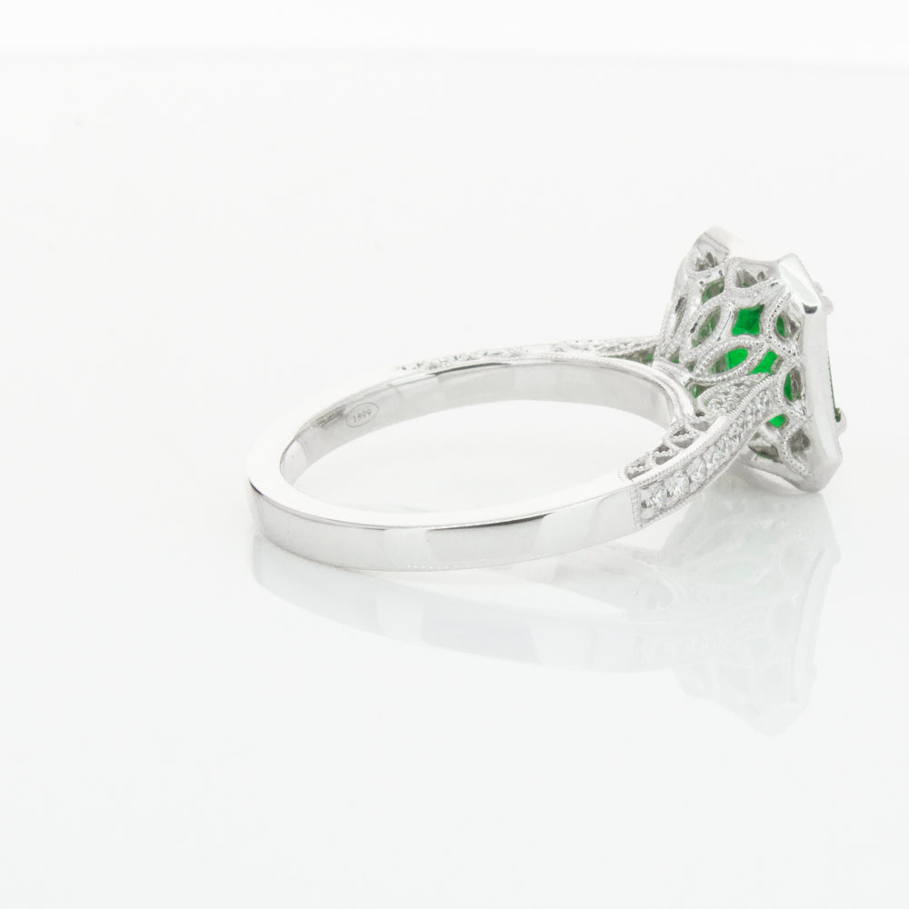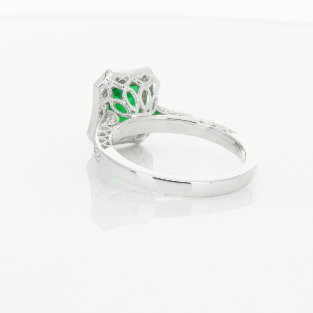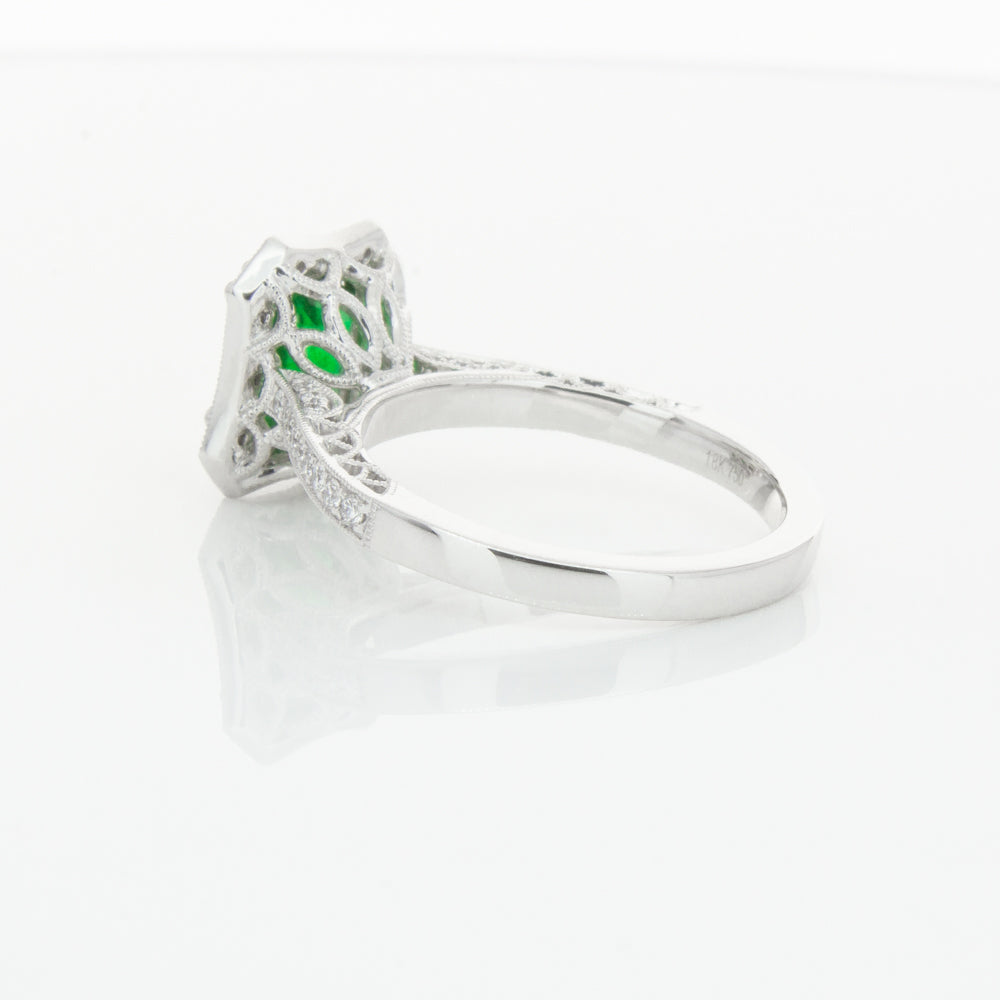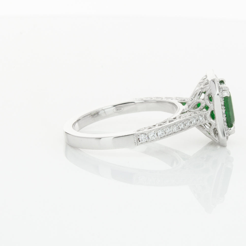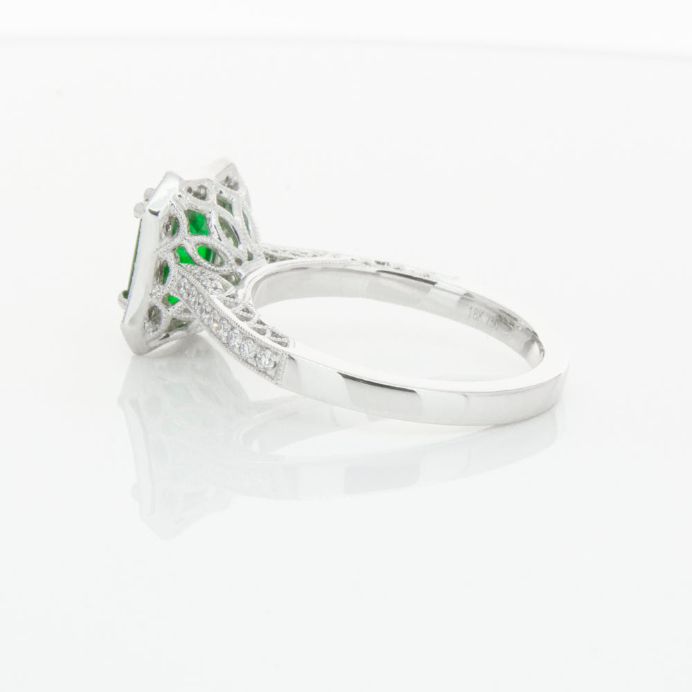 18ct white gold ring featuring a rectangular cut emerald framed by a halo of dazzling white diamonds, resting on diamond set shoulders.