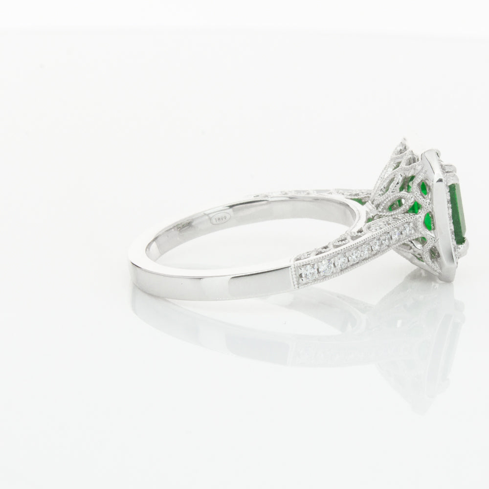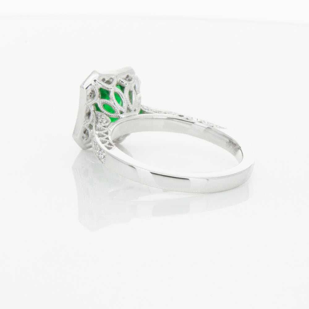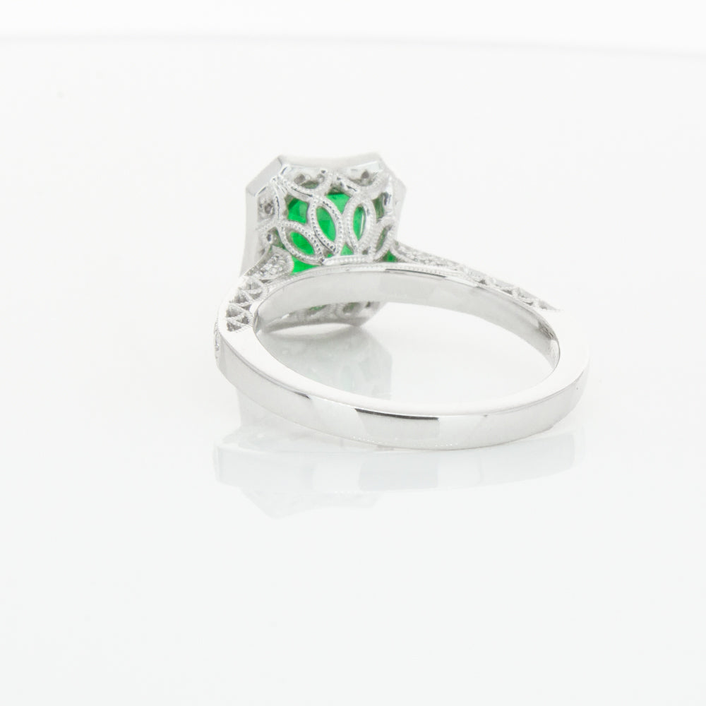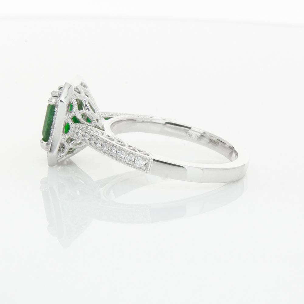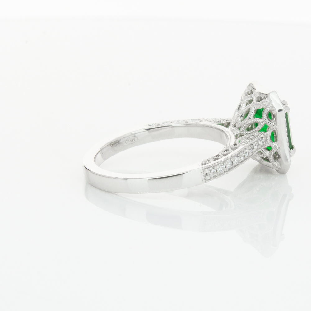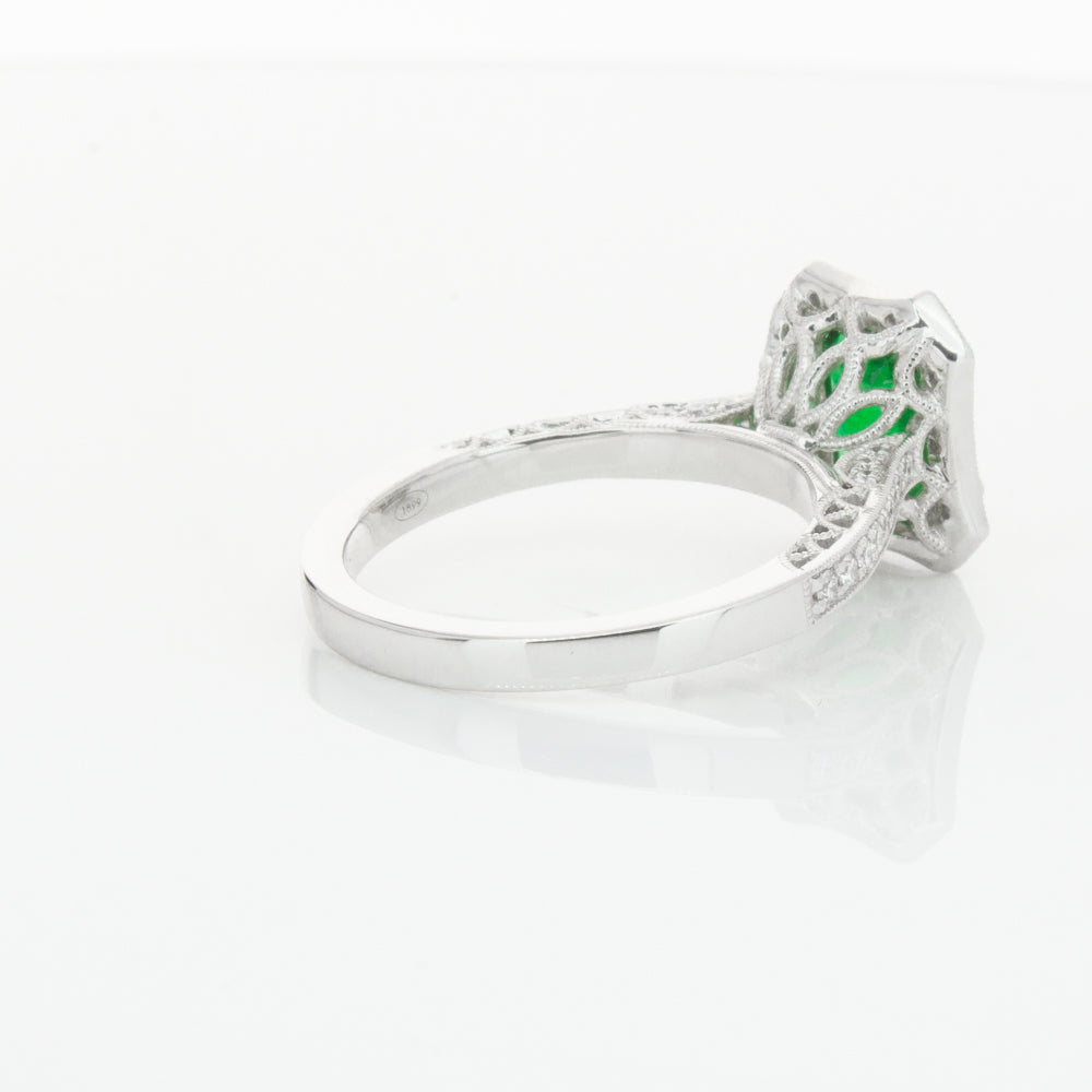 18ct white gold ring featuring a rectangular cut emerald framed by a halo of dazzling white diamonds, resting on diamond set shoulders.