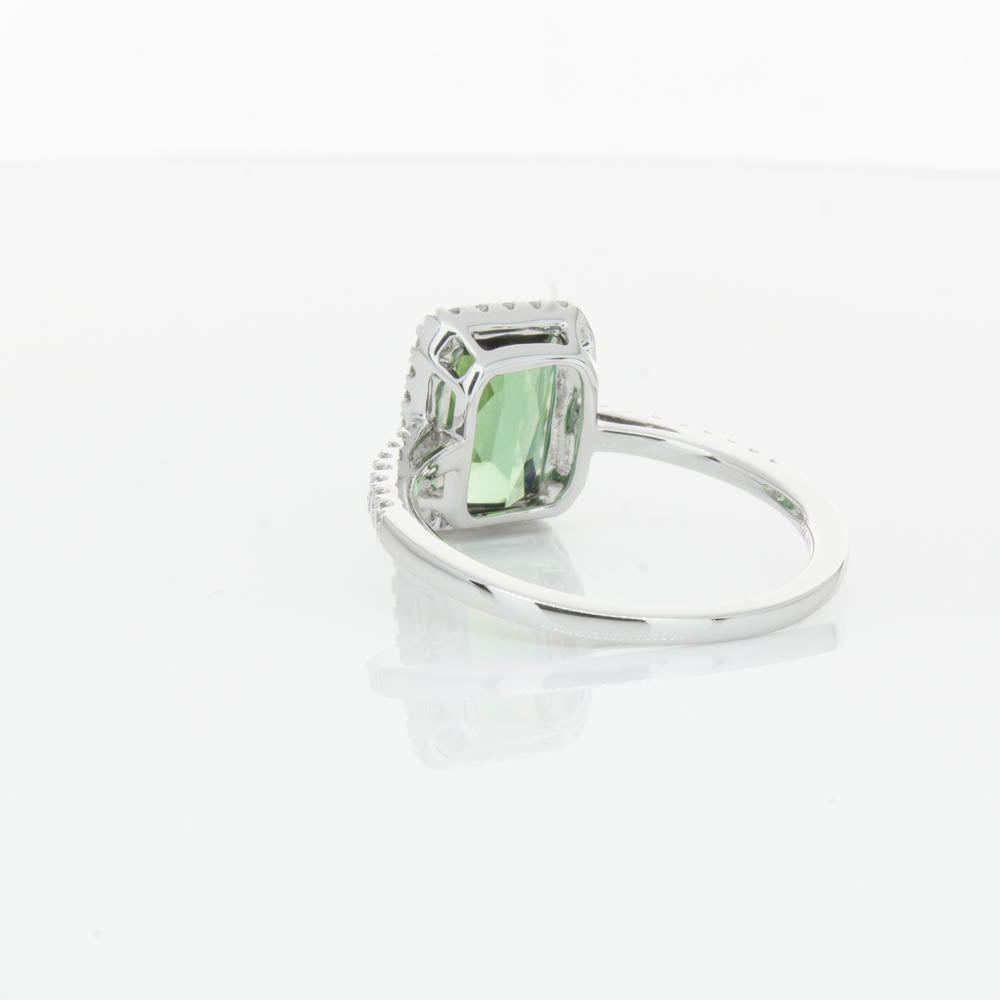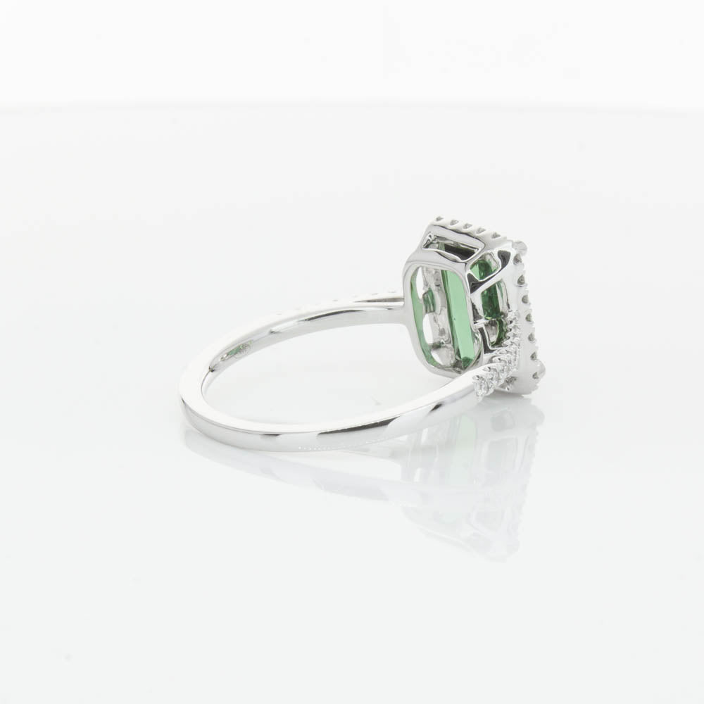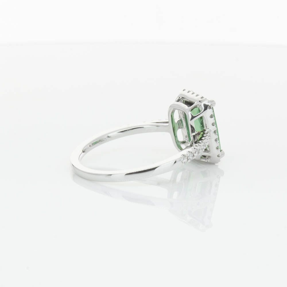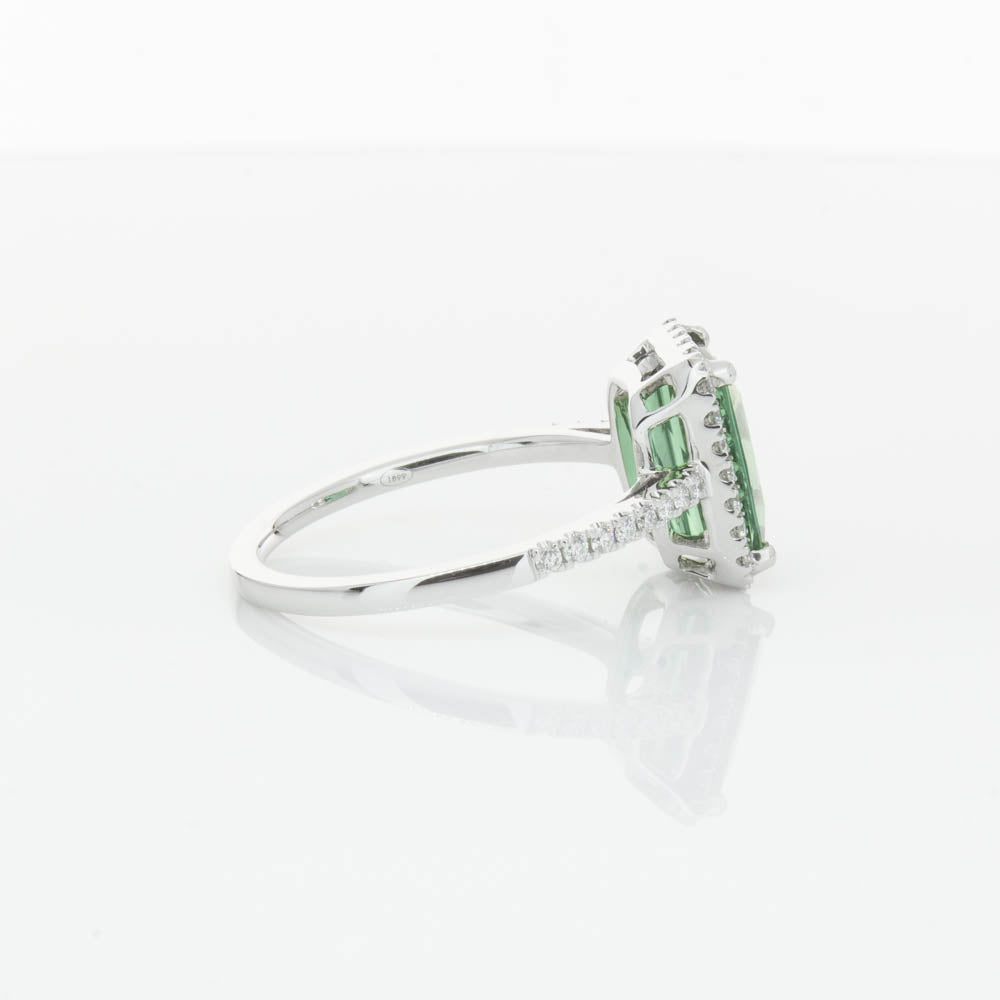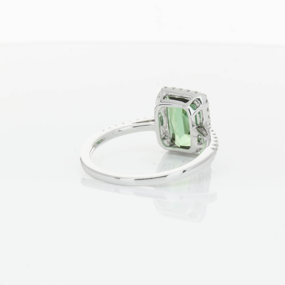 This glistening treasure boasts one impressive rectangular faceted green tourmaline resting in an elegant four claw setting and encased by a glittering diamond halo. Diamond set shoulders add extra sparkle to this delightful ring. Carefully hand assembled in luxurious 18ct white gold from our signature 1899 collection.