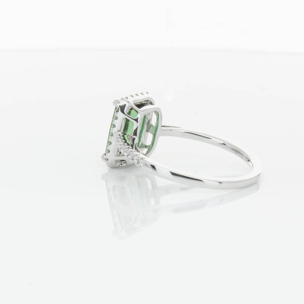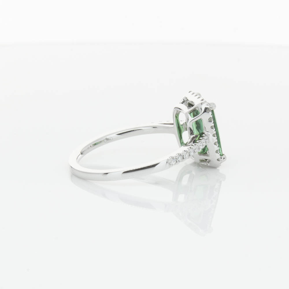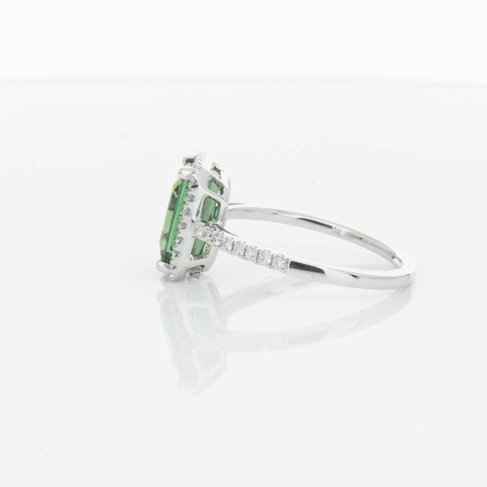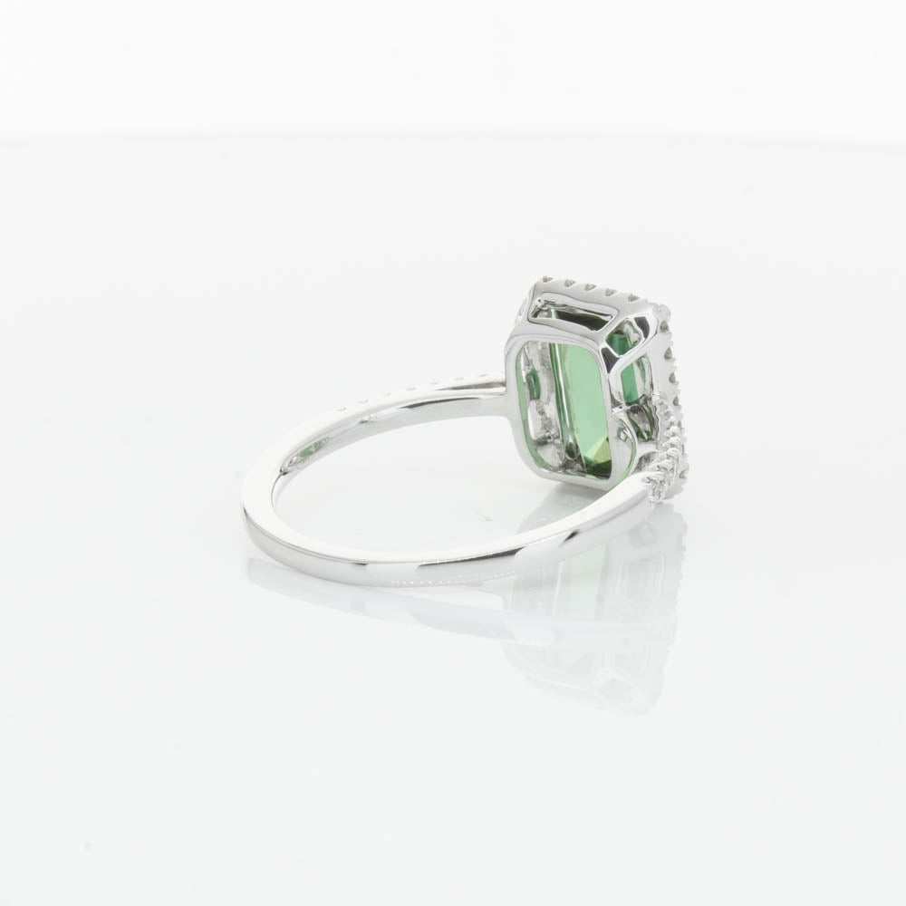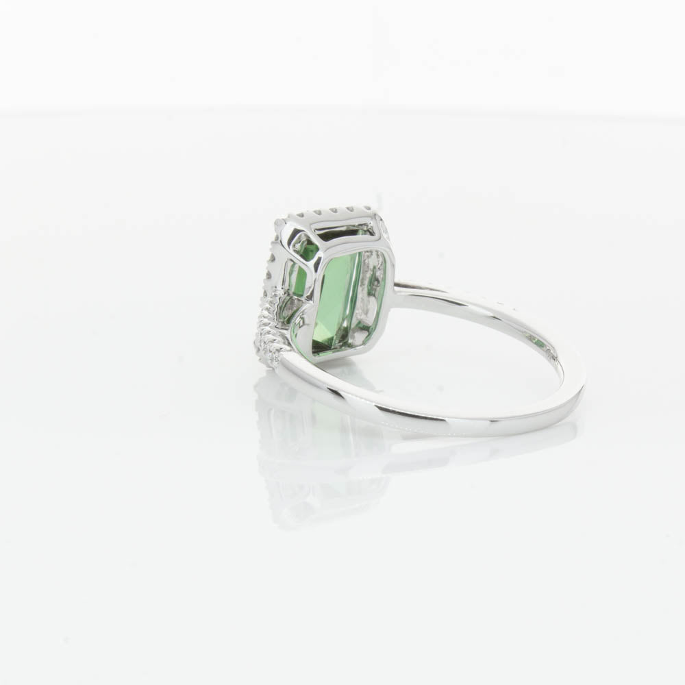This glistening treasure boasts one impressive rectangular faceted green tourmaline resting in an elegant four claw setting and encased by a glittering diamond halo. Diamond set shoulders add extra sparkle to this delightful ring. Carefully hand assembled in luxurious 18ct white gold from our signature 1899 collection.