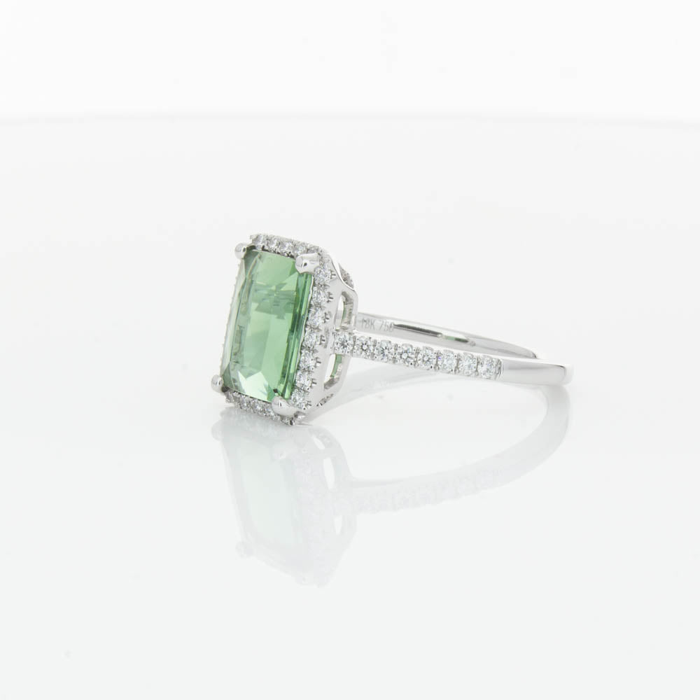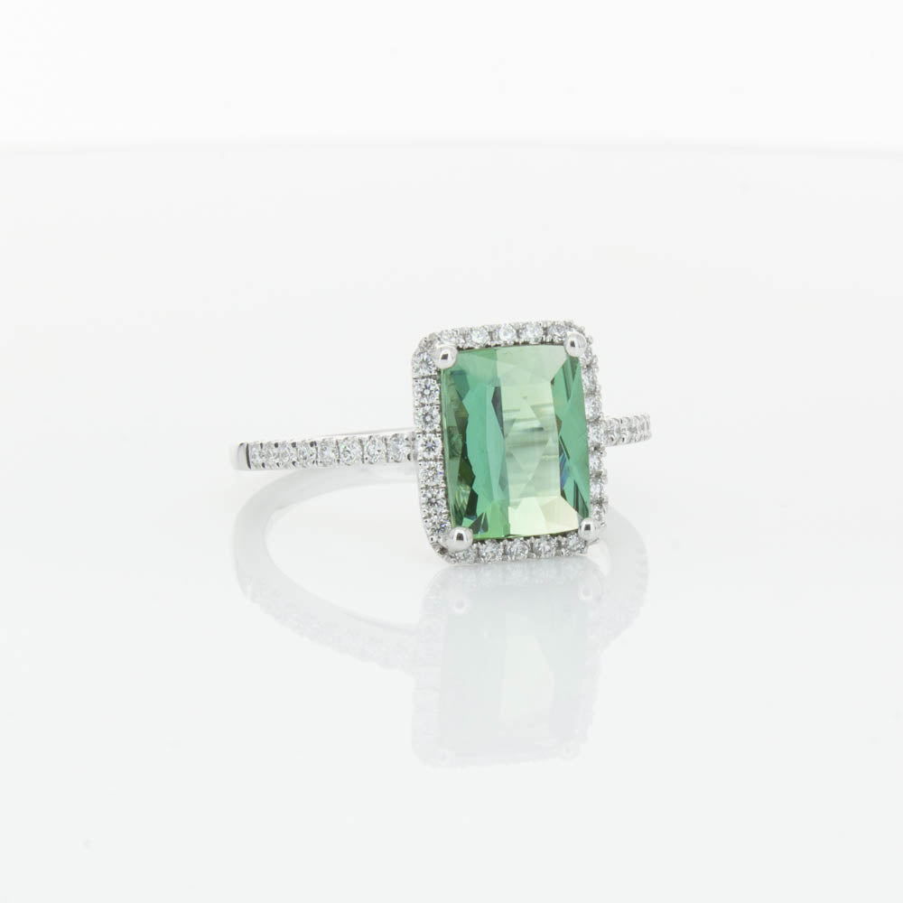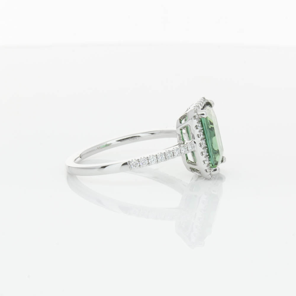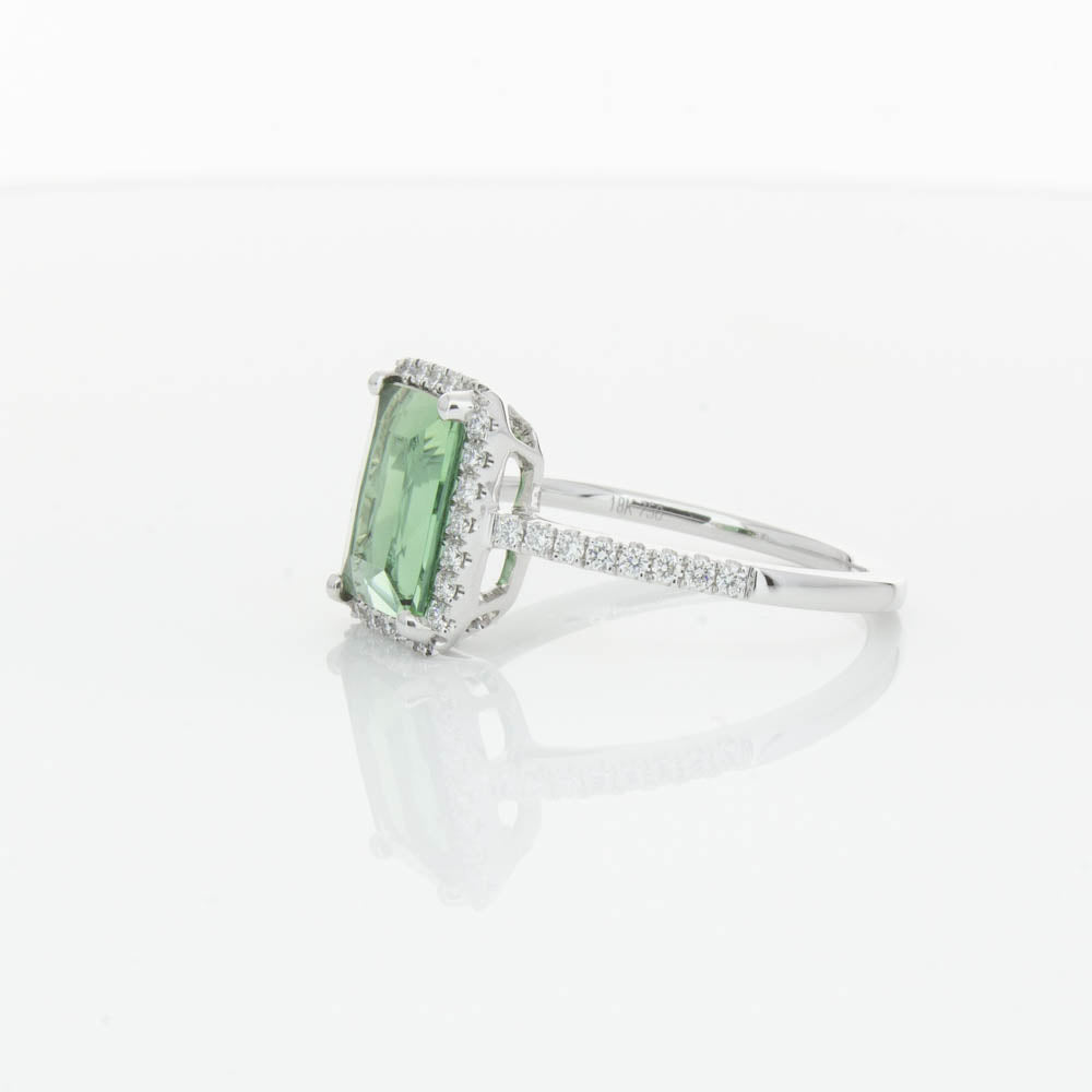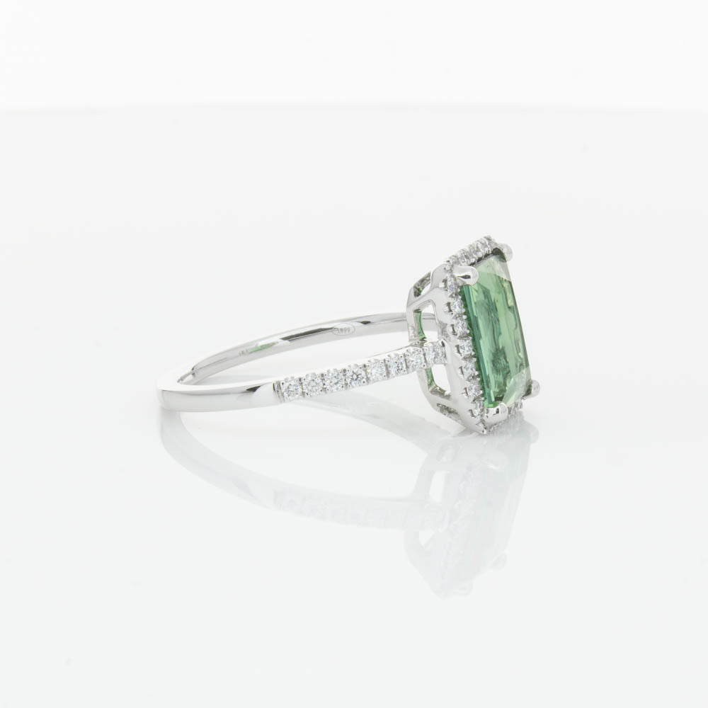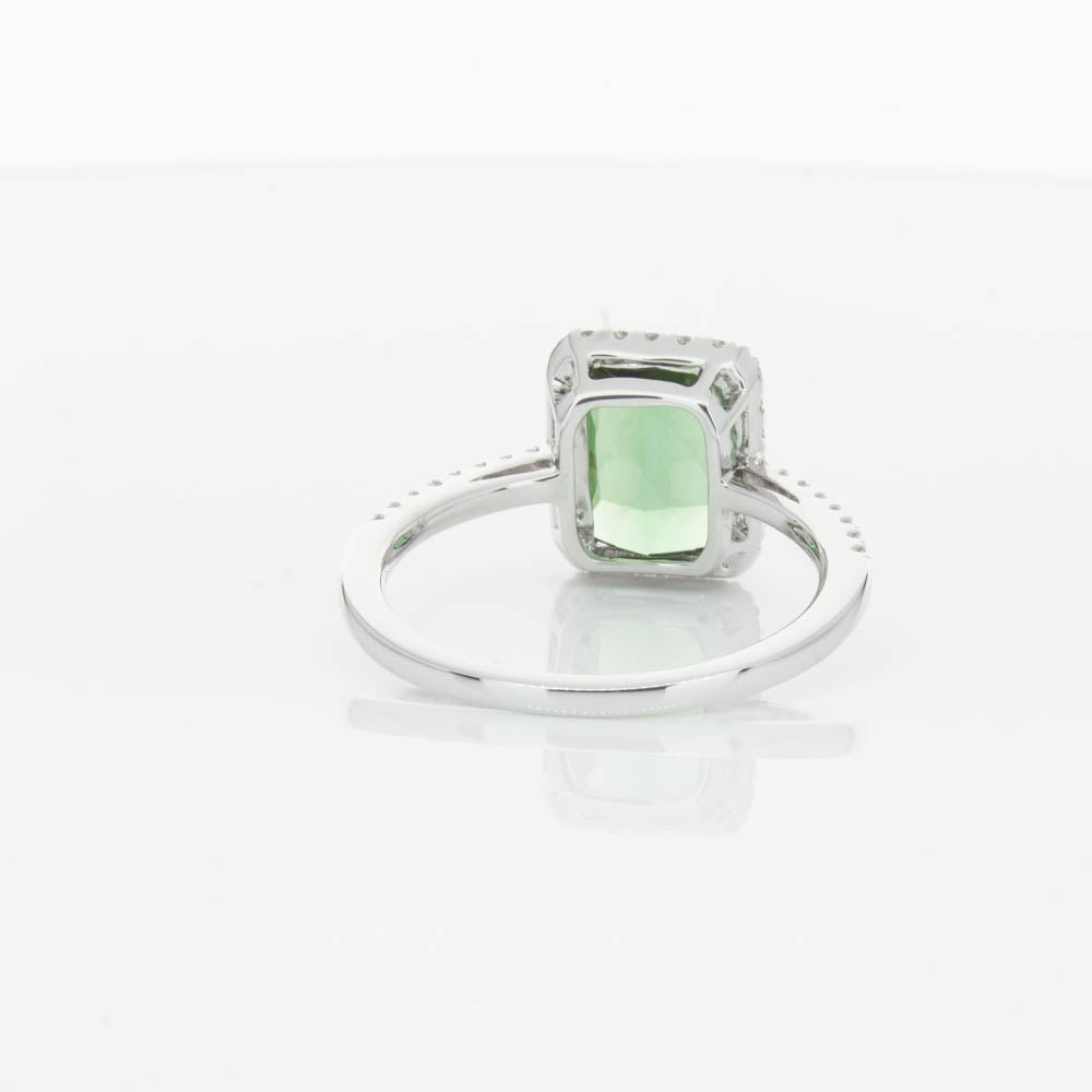This glistening treasure boasts one impressive rectangular faceted green tourmaline resting in an elegant four claw setting and encased by a glittering diamond halo. Diamond set shoulders add extra sparkle to this delightful ring. Carefully hand assembled in luxurious 18ct white gold from our signature 1899 collection.