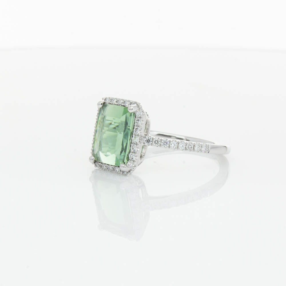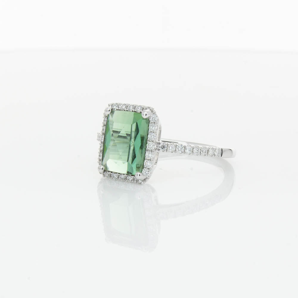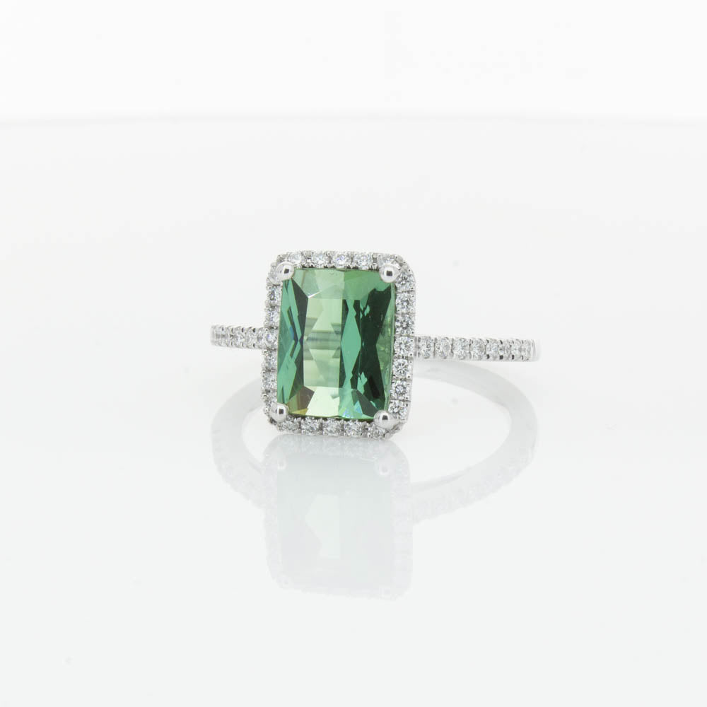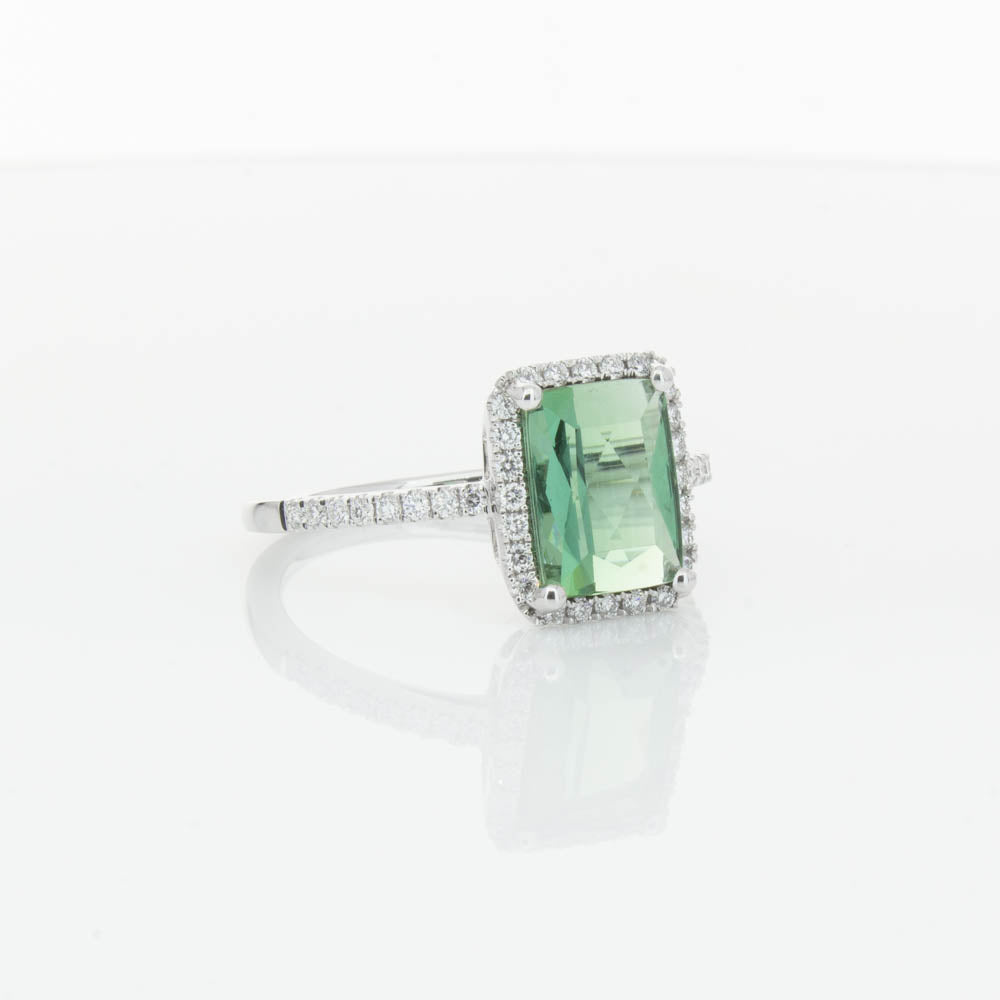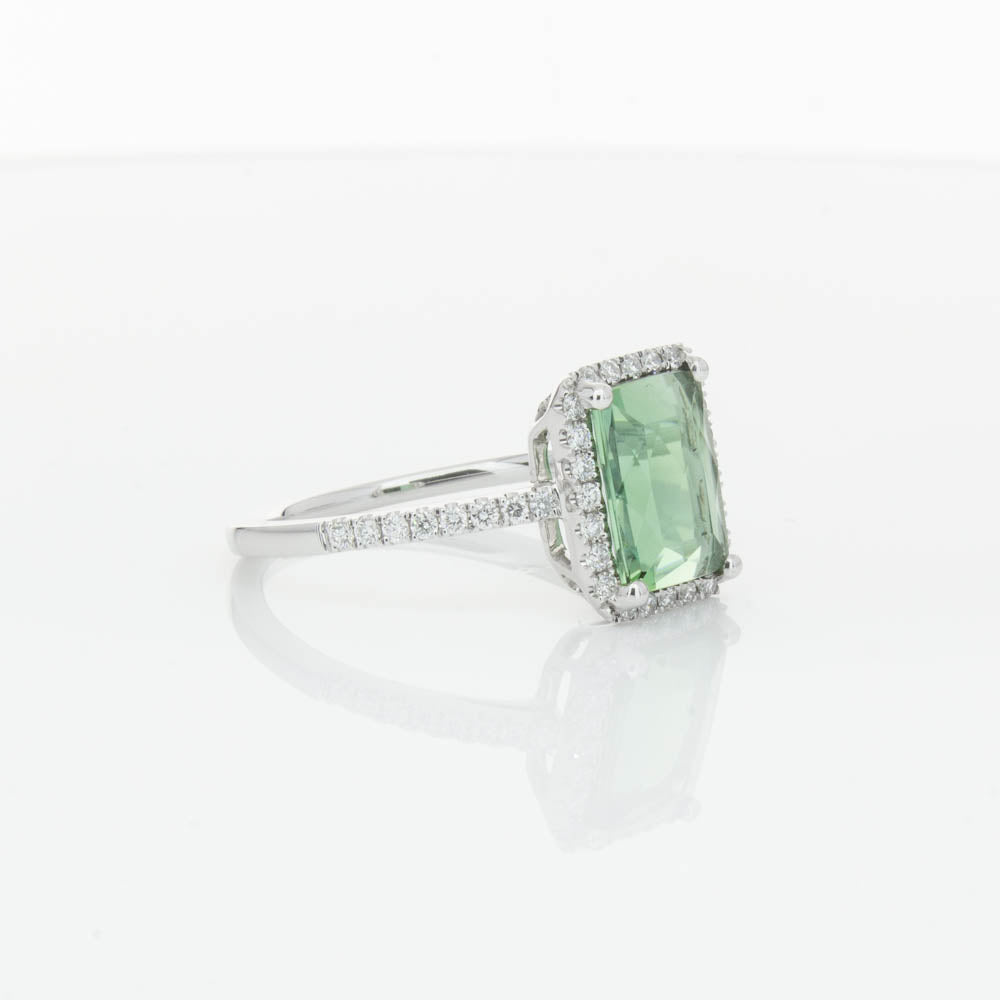 This glistening treasure boasts one impressive rectangular faceted green tourmaline resting in an elegant four claw setting and encased by a glittering diamond halo. Diamond set shoulders add extra sparkle to this delightful ring. Carefully hand assembled in luxurious 18ct white gold from our signature 1899 collection.