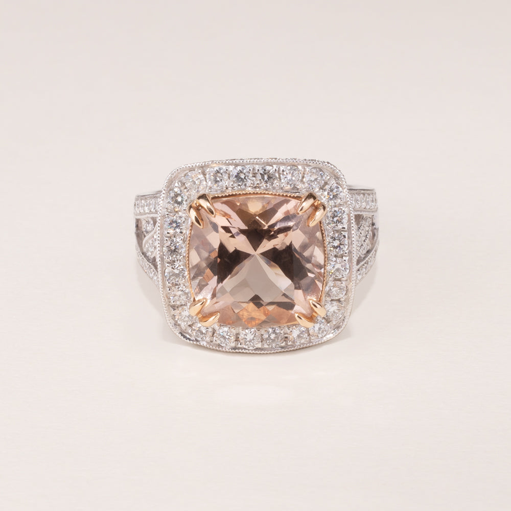 Simply radiant, this precious ring is sure to be the one. Beautifully crafted from 18ct white gold, this striking ring features a sparkling cushion cut morganite which is made even more captivating surrounded by a glistening array of diamonds.